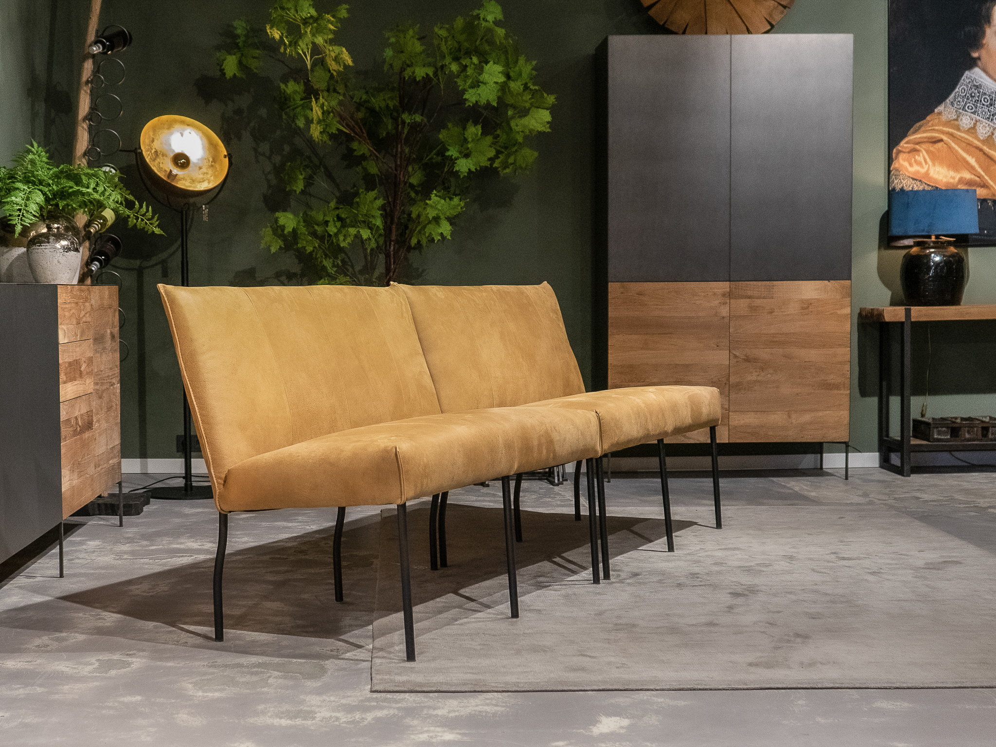 Stoere industriële eetkamerbank leverbaar in leer en stof. Dit model leveren we in 2 soorten doorgekleurd leer en in 3 soorten stof waarvan 1 exclusief bij ons verkrijgbaar. Zowel in het stof als leer een zeer luxe eetkamerbank, Het metalen frame is voorzien van een beschermende poedercoat en maakt de stoere uitstraling compleet. Tevens leverbaar als eetkamerstoel of als barkruk!