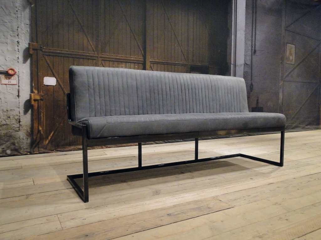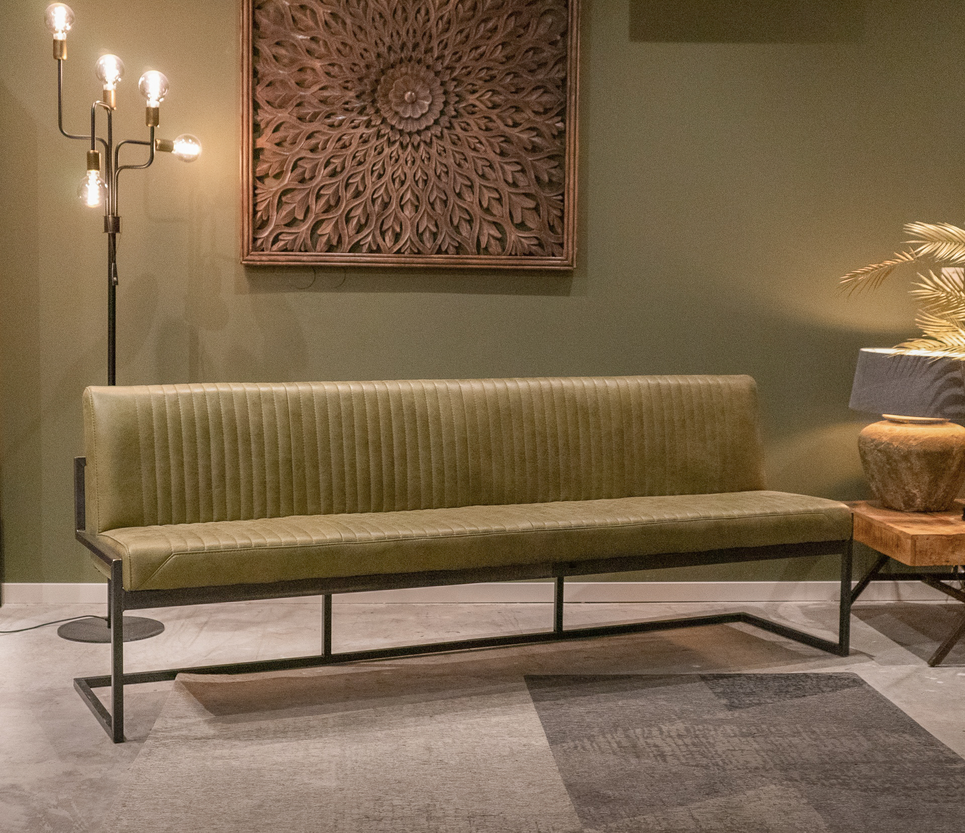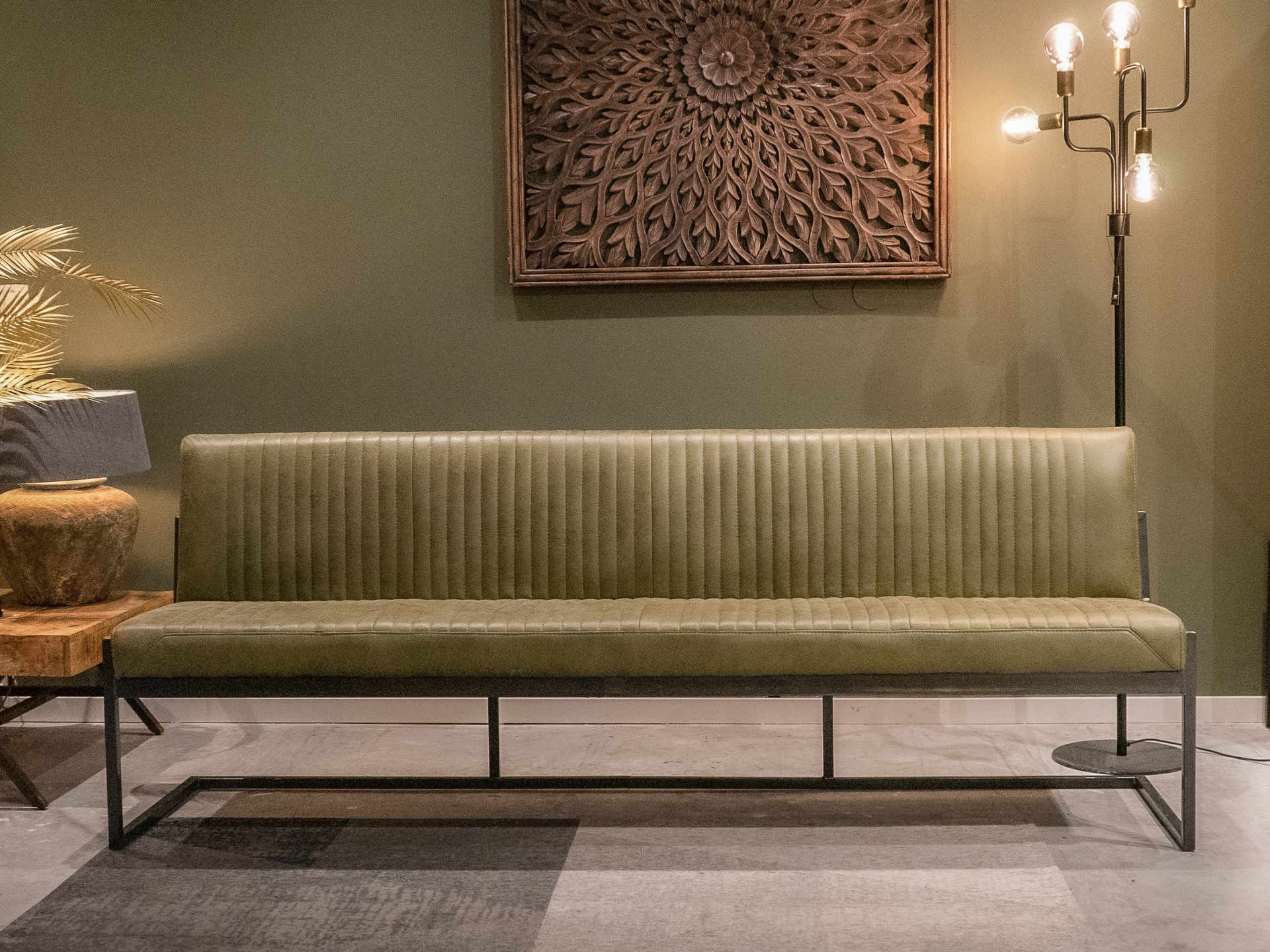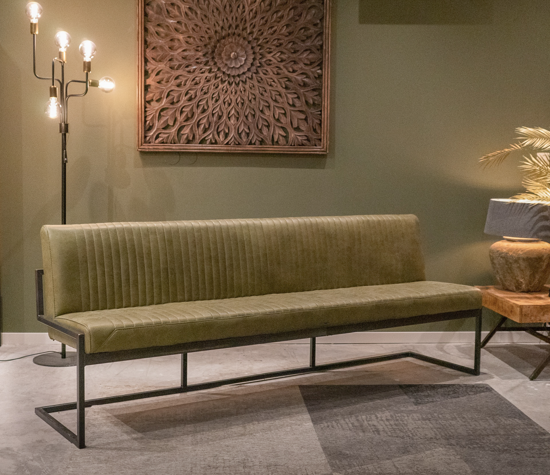 Stoere industriële eetkamerbank, doorgaans leverbaar direct uit voorraad in 4 kleuren in diverse maten. Het metalen frame is voorzien van een beschermende coating en maakt de stoere industriële uitstraling compleet, bij de kleuren licht bruin en donker bruin zijn de frames iets bruiner/bronzer gekleurd dan bij de groene en antraciet stof. Zoekt u meer opties qua materiaal, kleur en stiksel? Bekijk dan onze eetkamerbank Valenzano, welke in al onze standaard materialen leverbaar is met 4 verschillende stiksels.