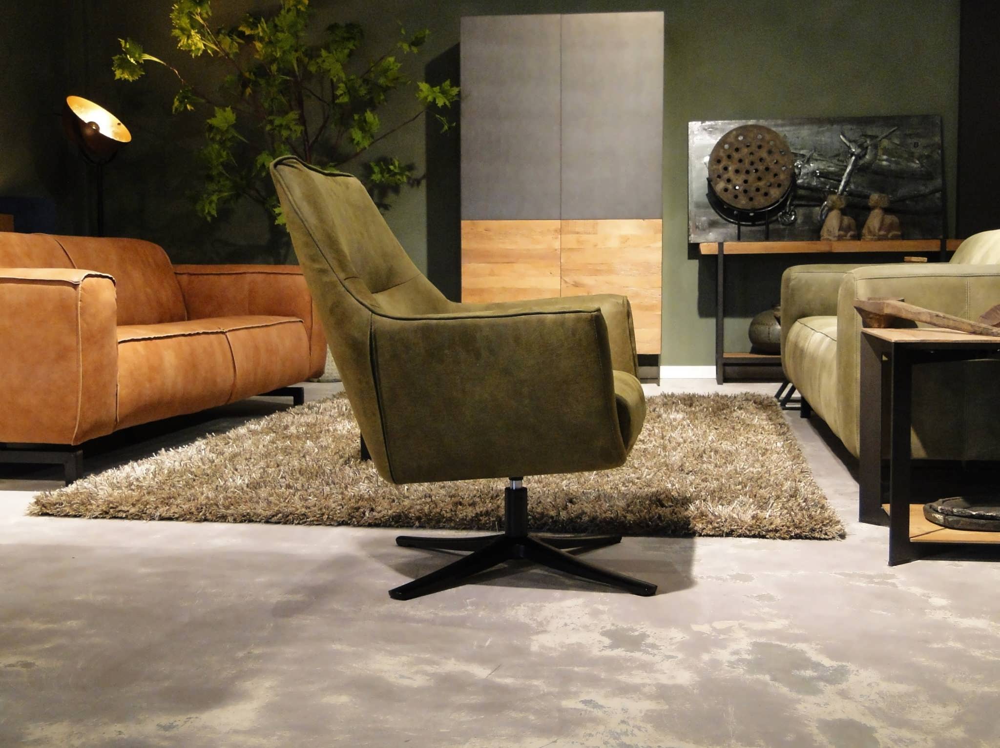 De stoere industriële draaifauteuil Bezons is doorgaans direct uit voorraad leverbaar in het eco leer, in de kleuren moss, niagara en graphite. Dit bull eco leder (ook wel microleder genoemd) bestaat voor 60% uit leer en voor 40% uit polyester. Dit materiaal is exact hetzelfde als het bull eco leder voor onze andere meubels. Deze fauteuil heeft een klassiek uiterlijk en zit zeer comfortabel. De zwarte sterpoot geeft een stoere ´draai´ aan dit model.