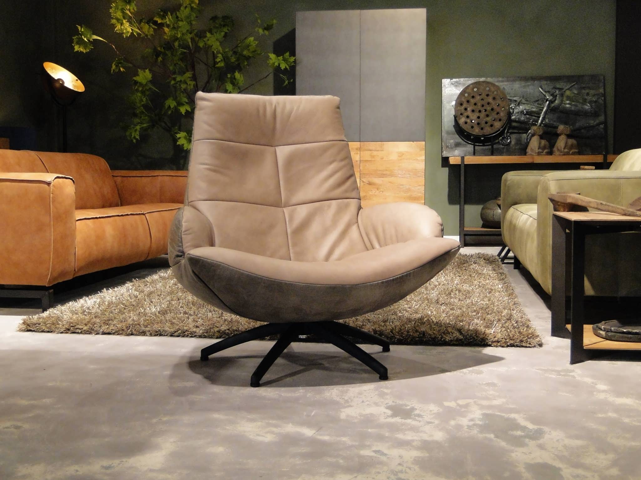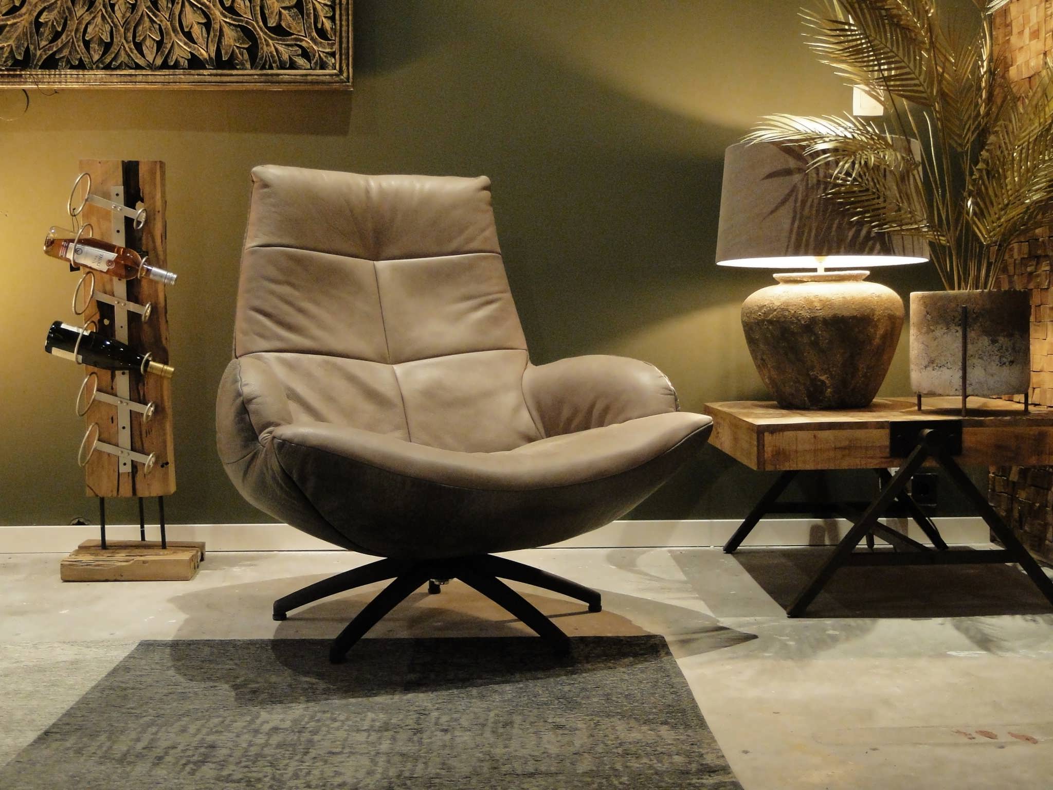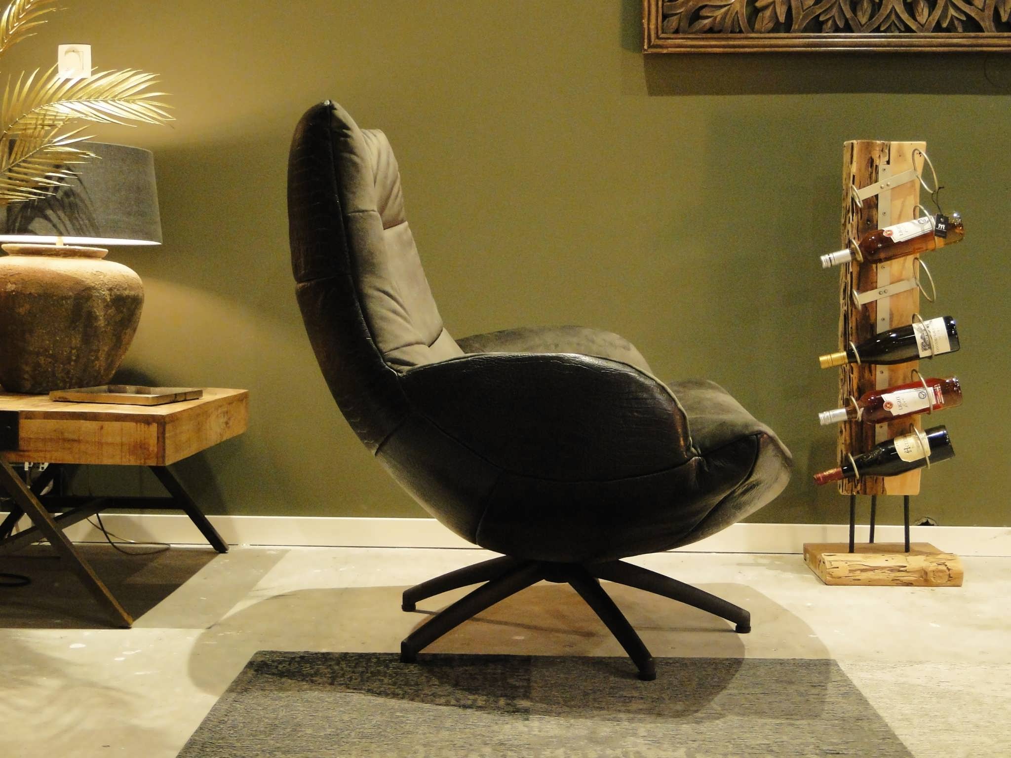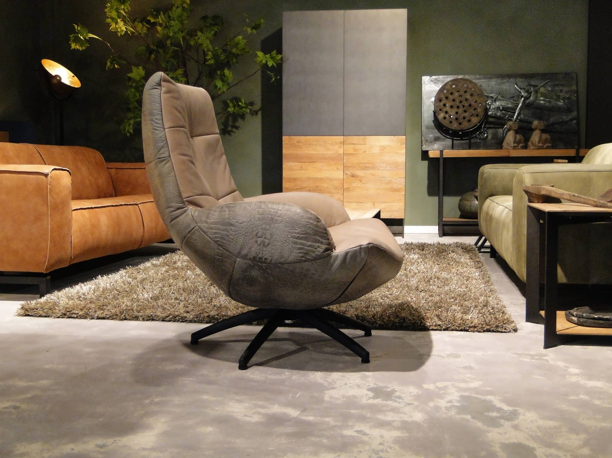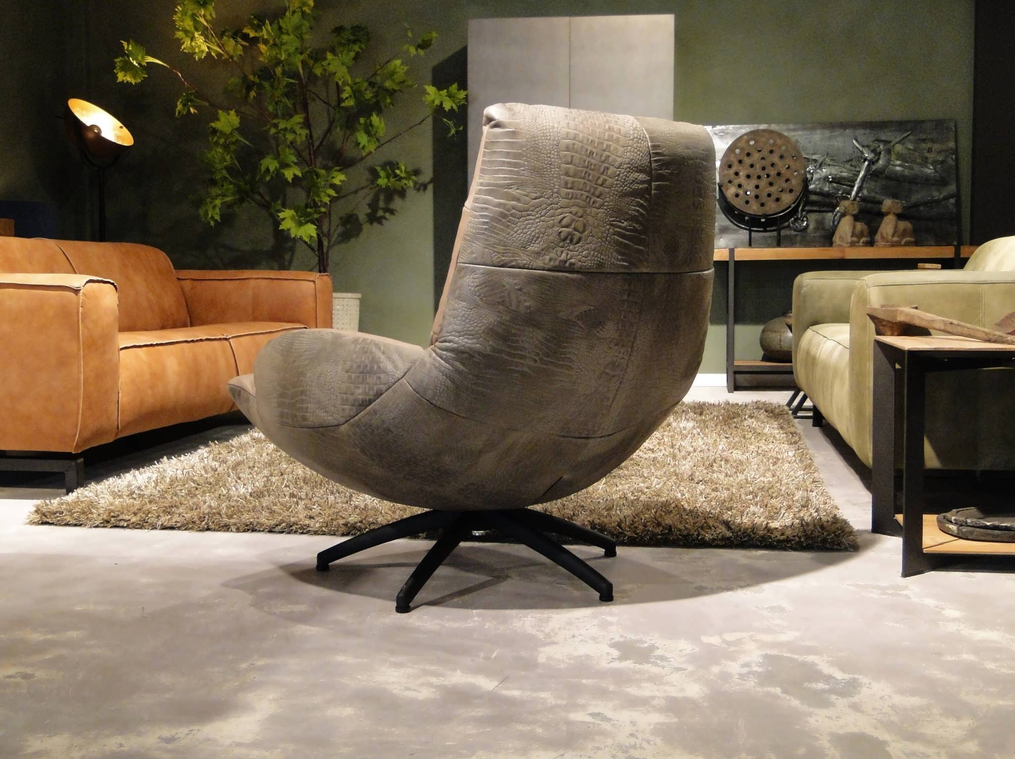 Exclusieve draaifauteuil op stalen draaivoet leverbaar in leer en stof. Dit model leveren we in bijzonder veel uitvoeringen en diverse kleuren. Dit model is leverbaar in caiman leer met een mooie croq print. Gemaakt in Nederland geeft het veel opties, zo is het ook mogelijk om bijvoorbeeld een achterkant in caiman leer en een voorkant in antigo leer te bestellen. Indien er caiman leer op het zitvlak gekozen wordt moet u er rekening mee houden dat de print over tijd zal vervagen.