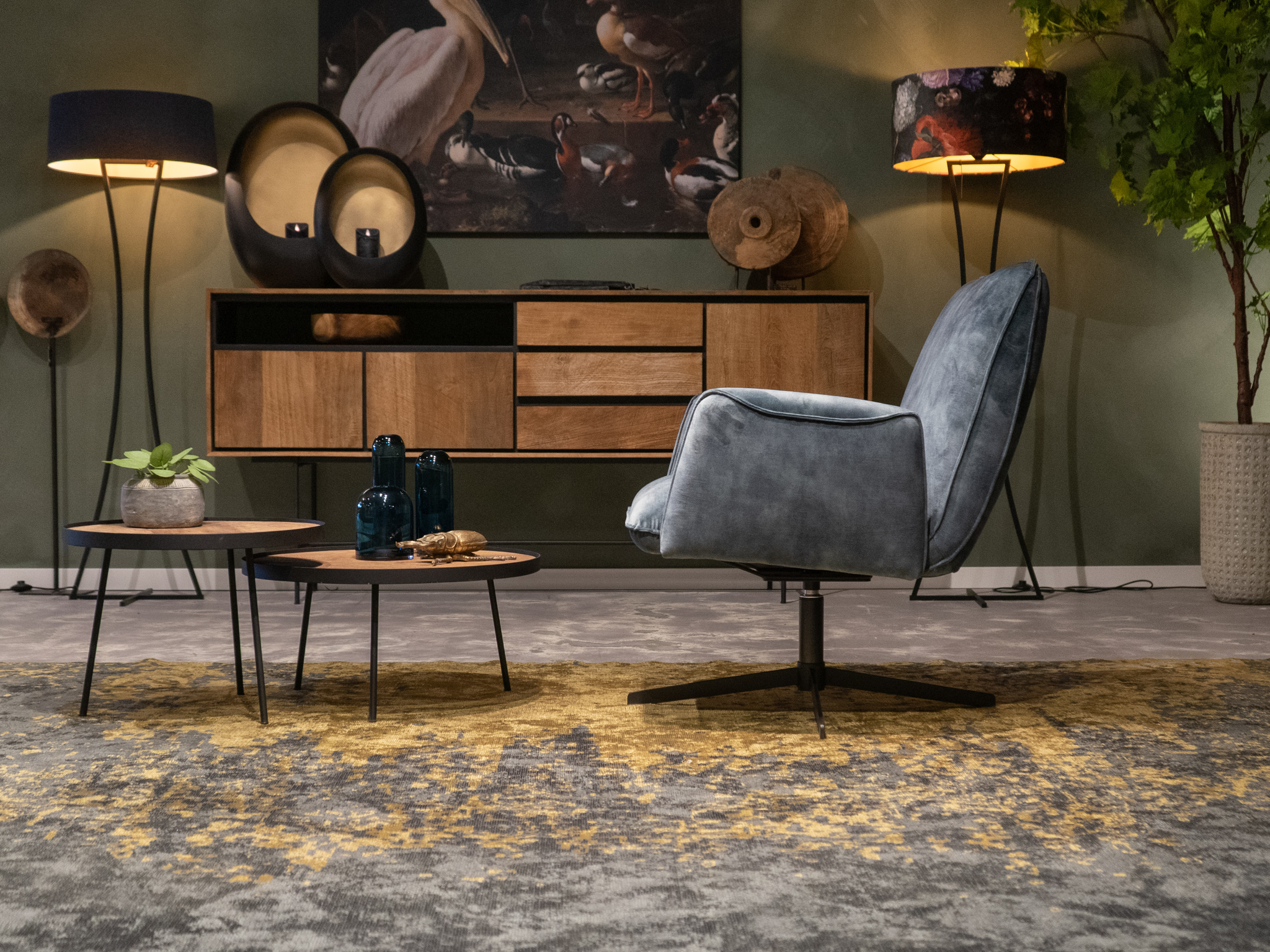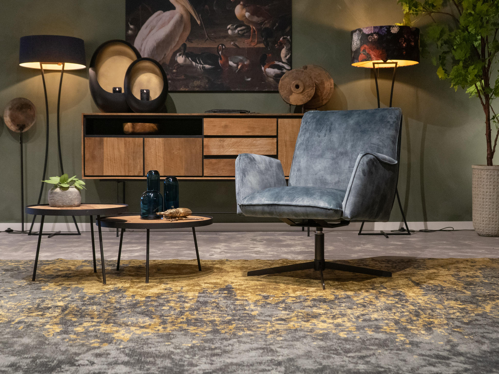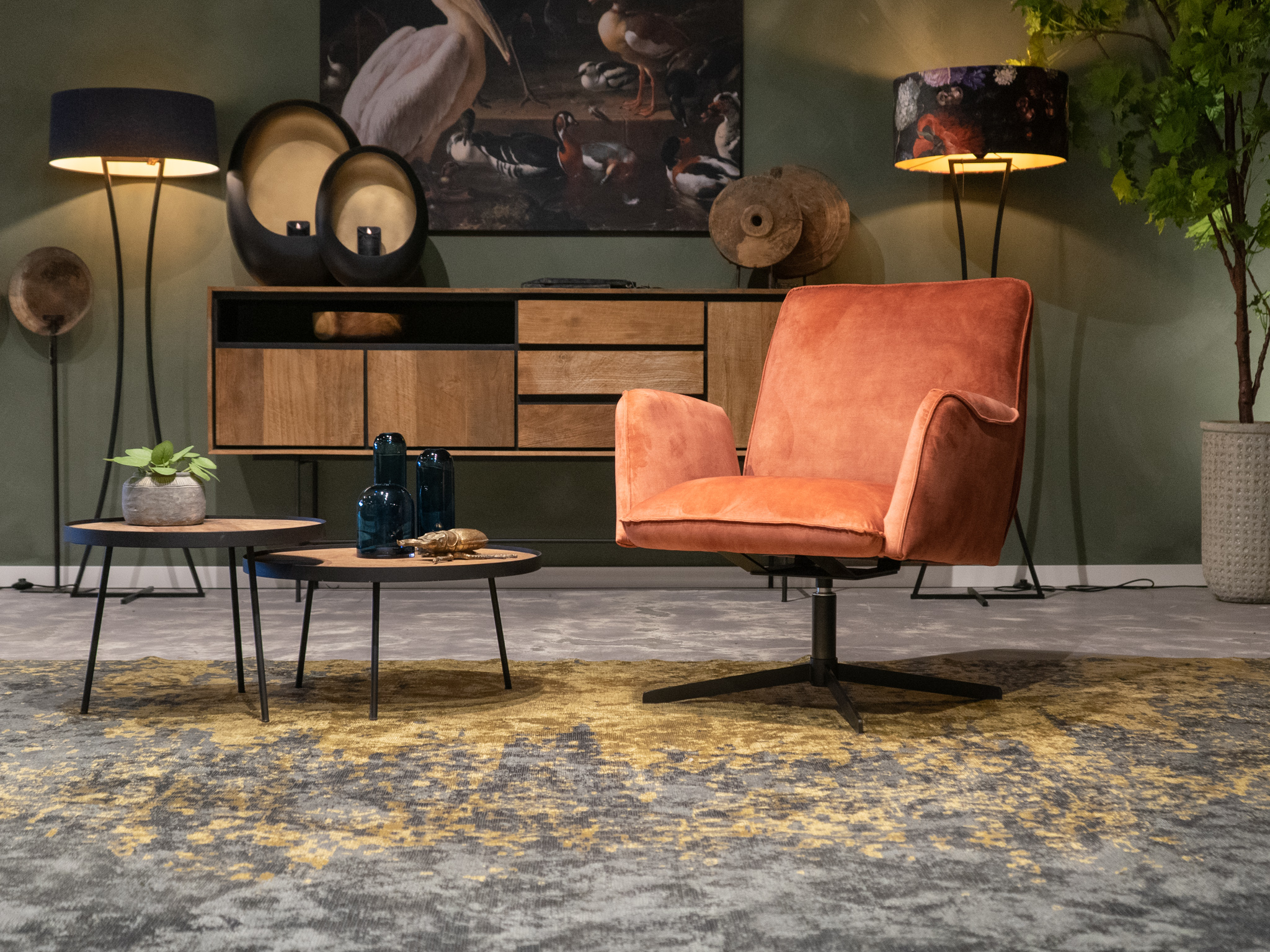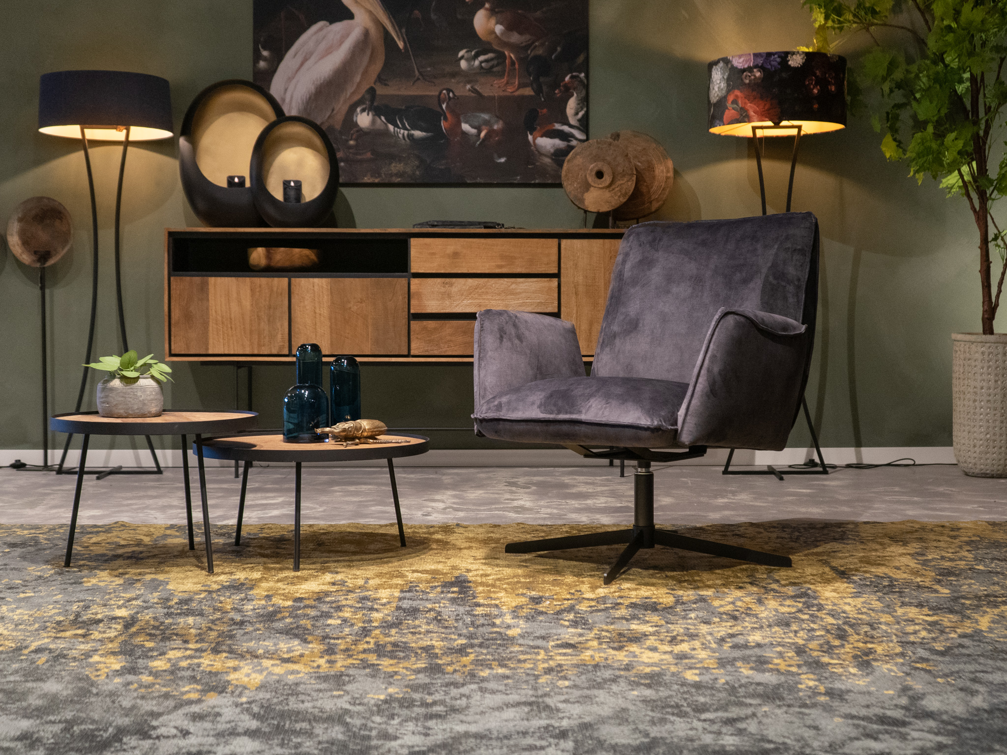 Stoere draaifauteuil Vardan met heerlijk zachte velvet stof bekleding. De fauteuil Vardan heeft een mooie zwarte draaivoet gemaakt van zwart staal. De velvet stof van deze fauteuil is exact hetzelfde als de velvet stof welke wij gebruiken op onze andere stoffen meubels. Het open gedeelte aan de achterzijde van deze fauteuil zorgt voor een luchtige uitstraling.