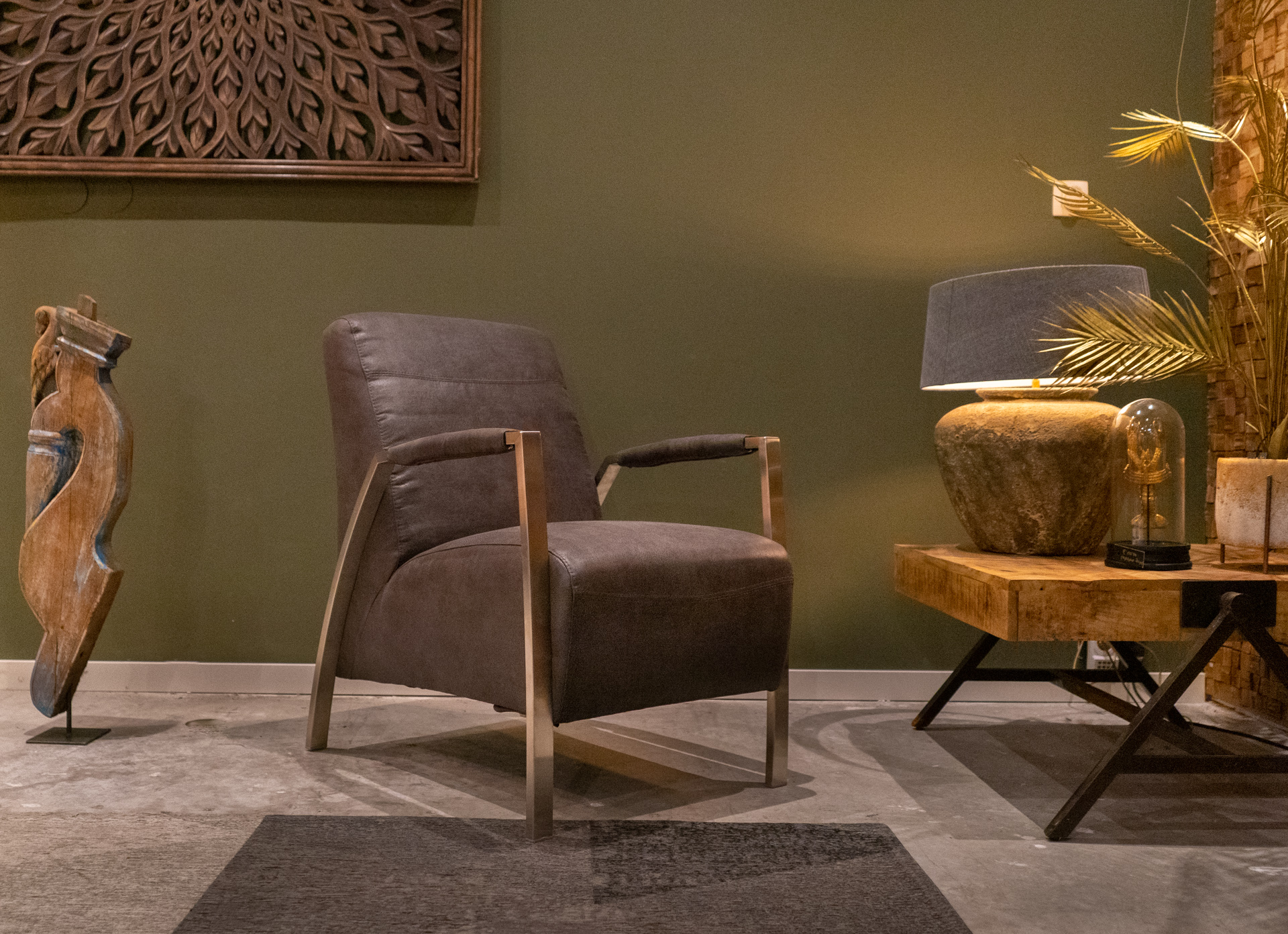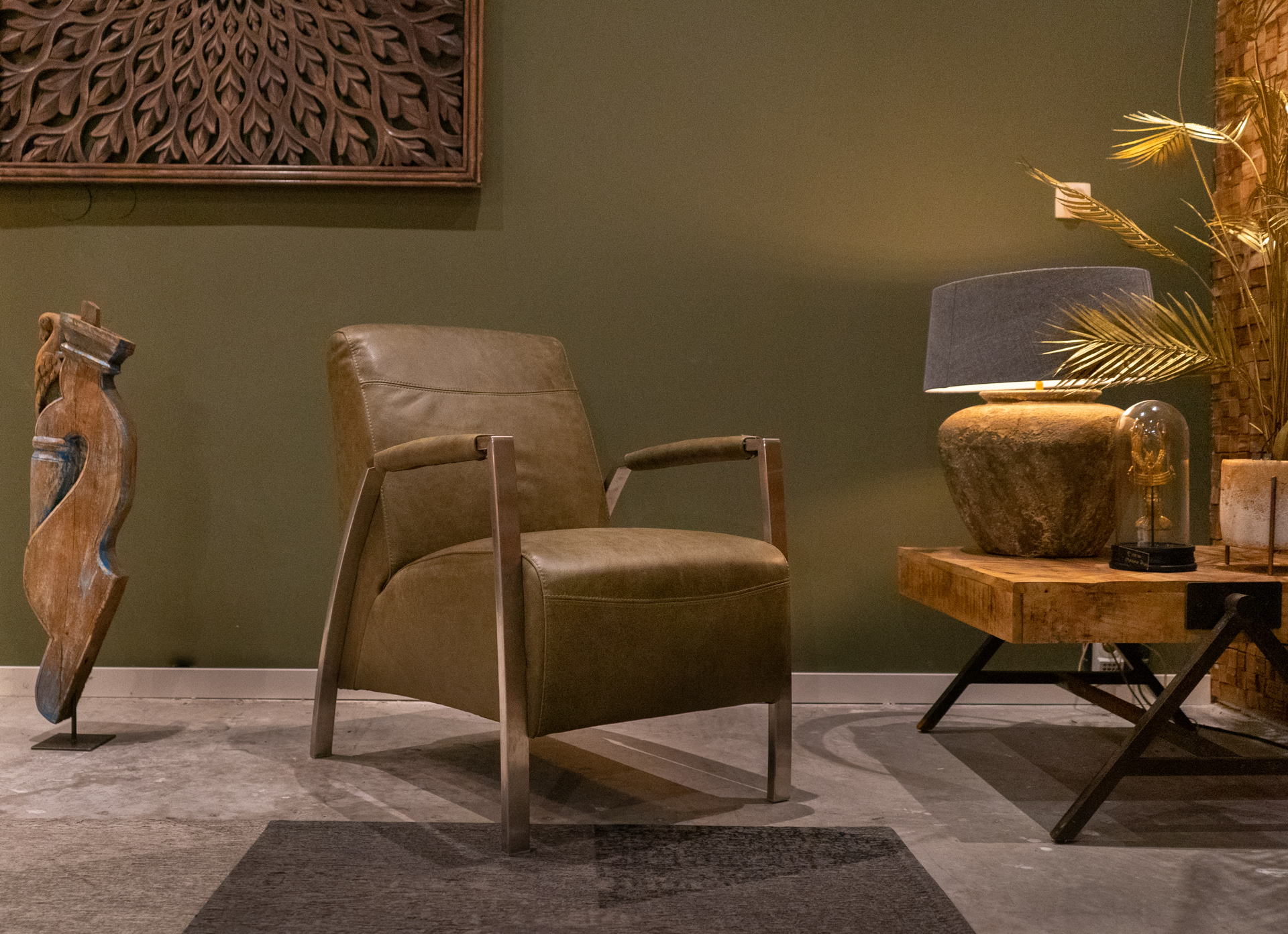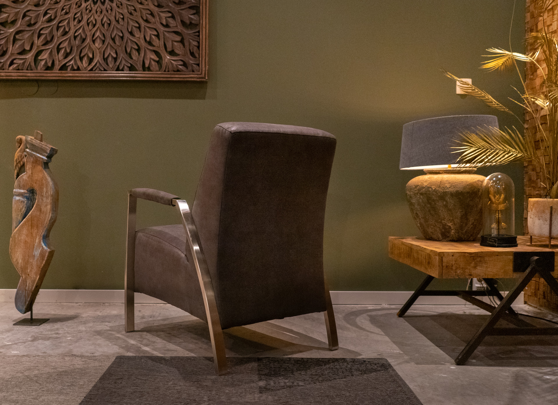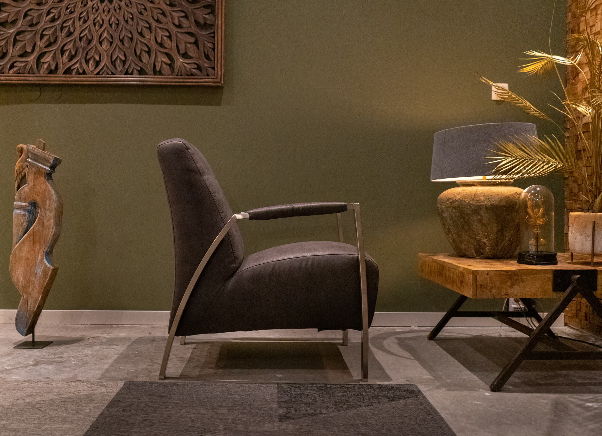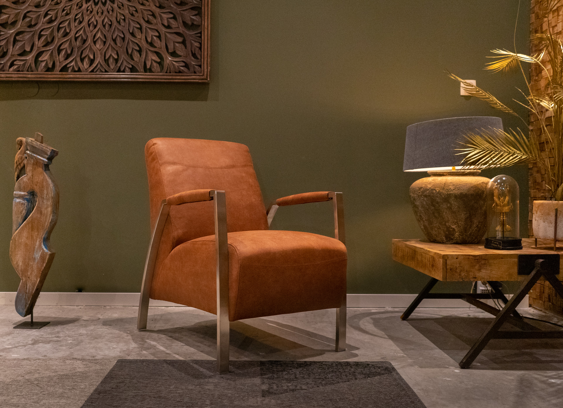 Stoere fauteuil leverbaar in leer en stof. Dit model leveren we in diverse kleuren. Het onderstel kan zowel in geborsteld als zwart staal gemaakt worden.