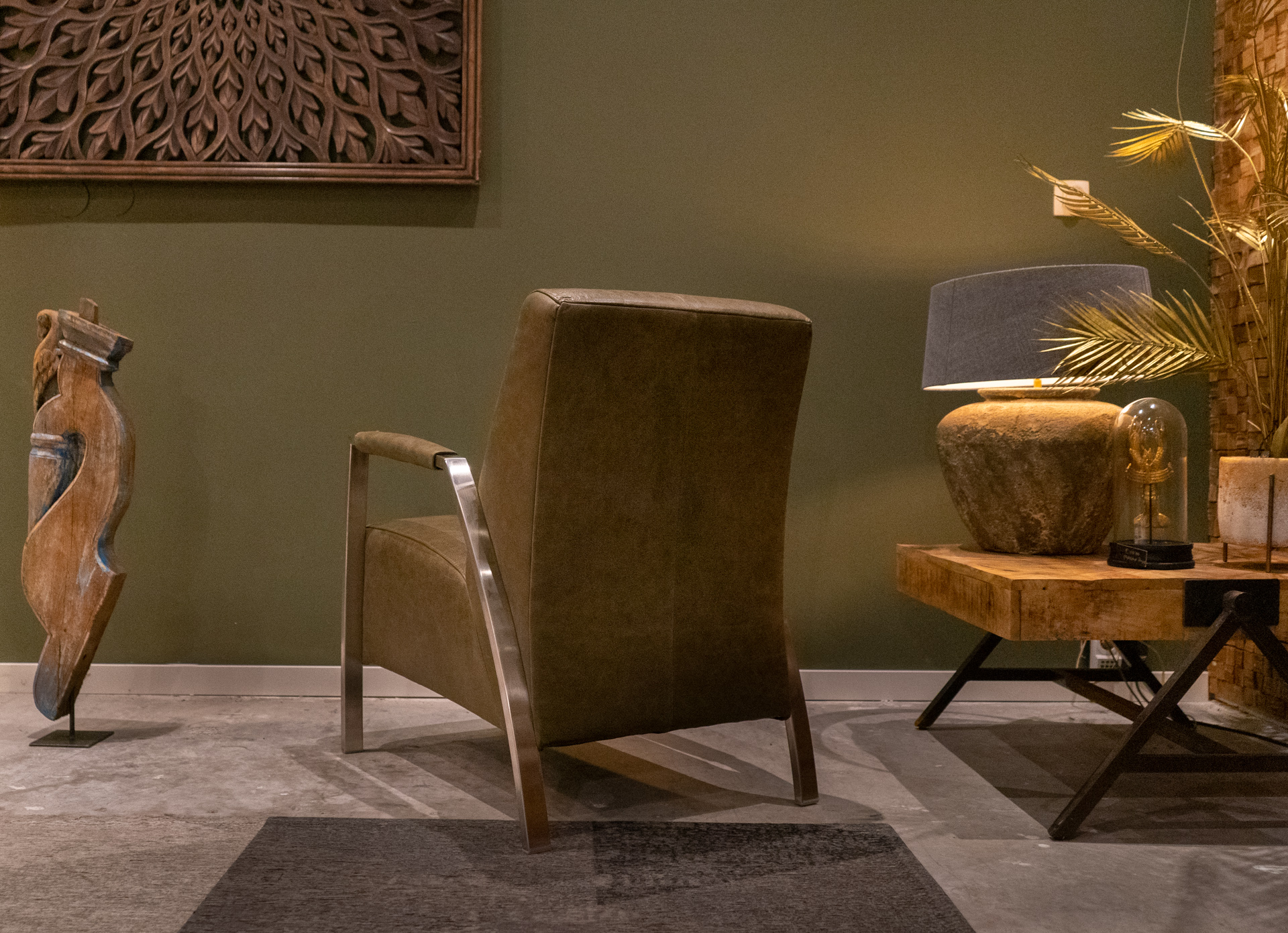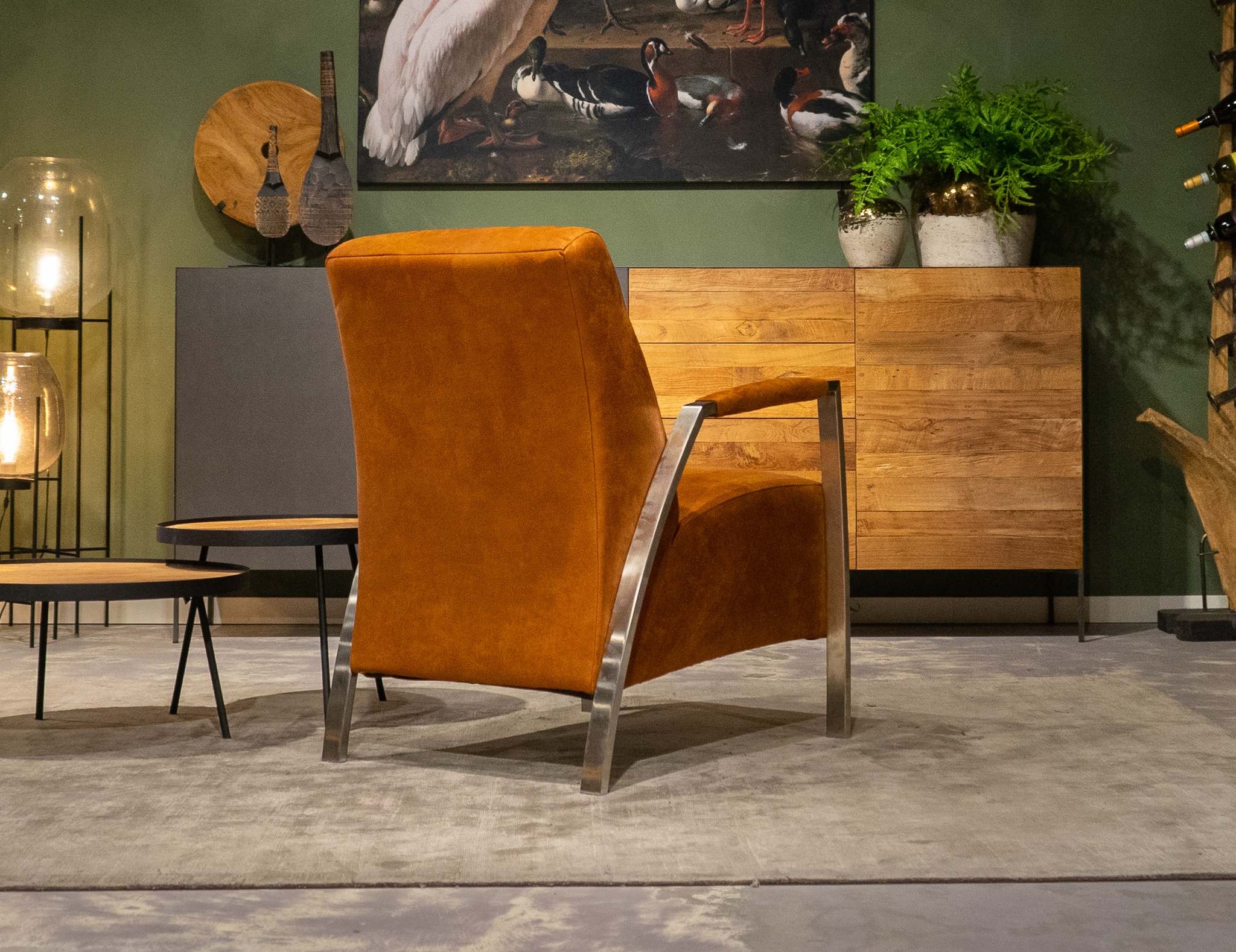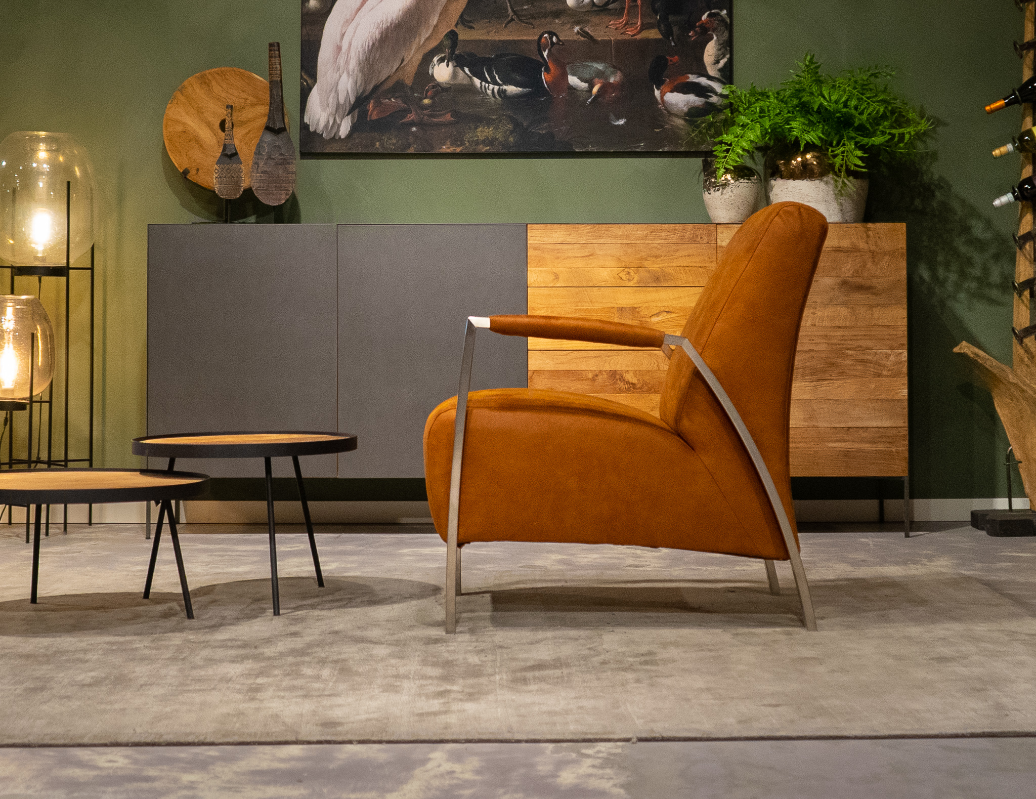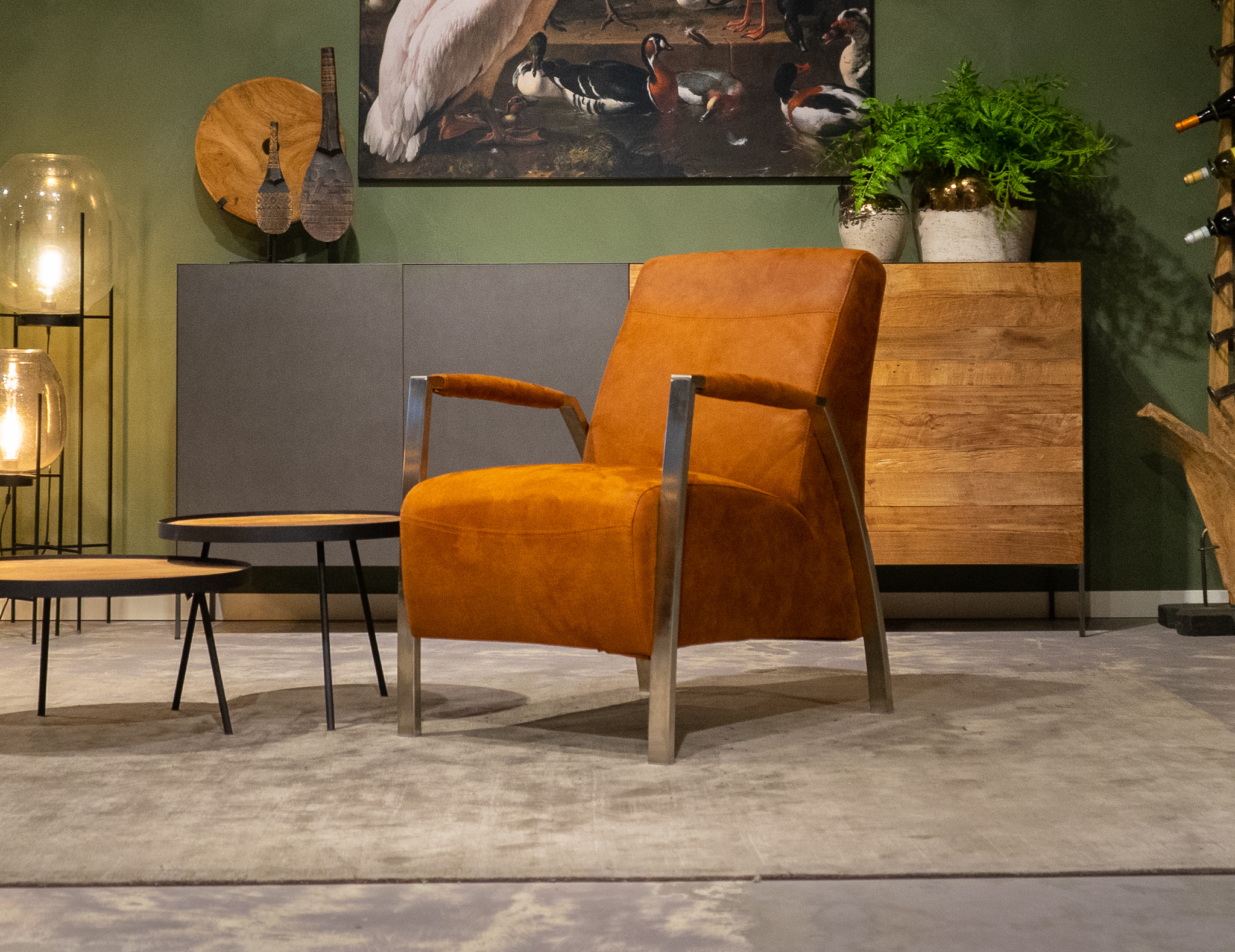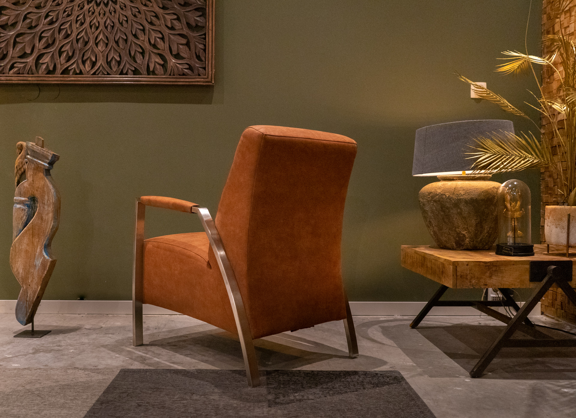 Stoere fauteuil leverbaar in leer en stof. Dit model leveren we in diverse kleuren. Het onderstel kan zowel in geborsteld als zwart staal gemaakt worden.
