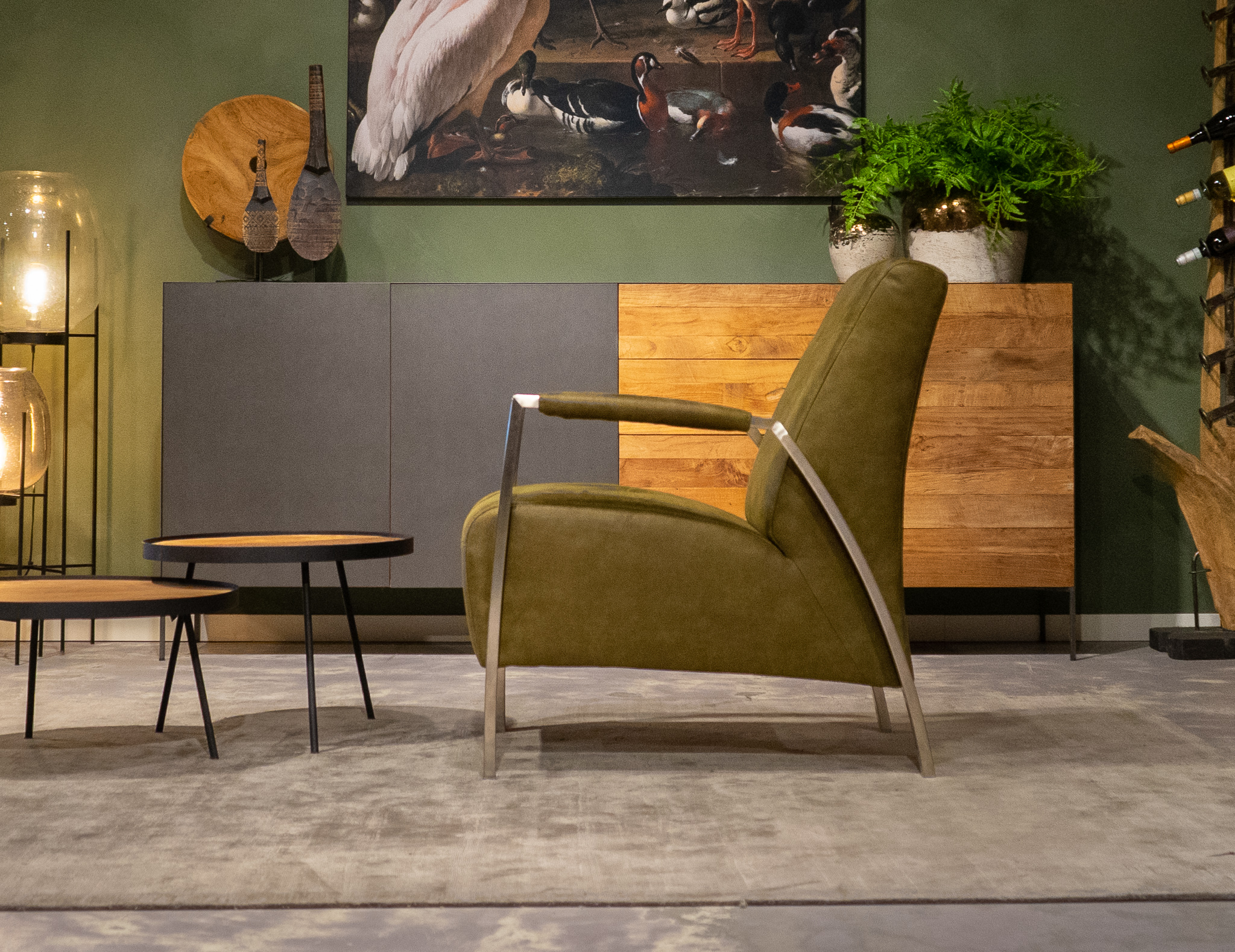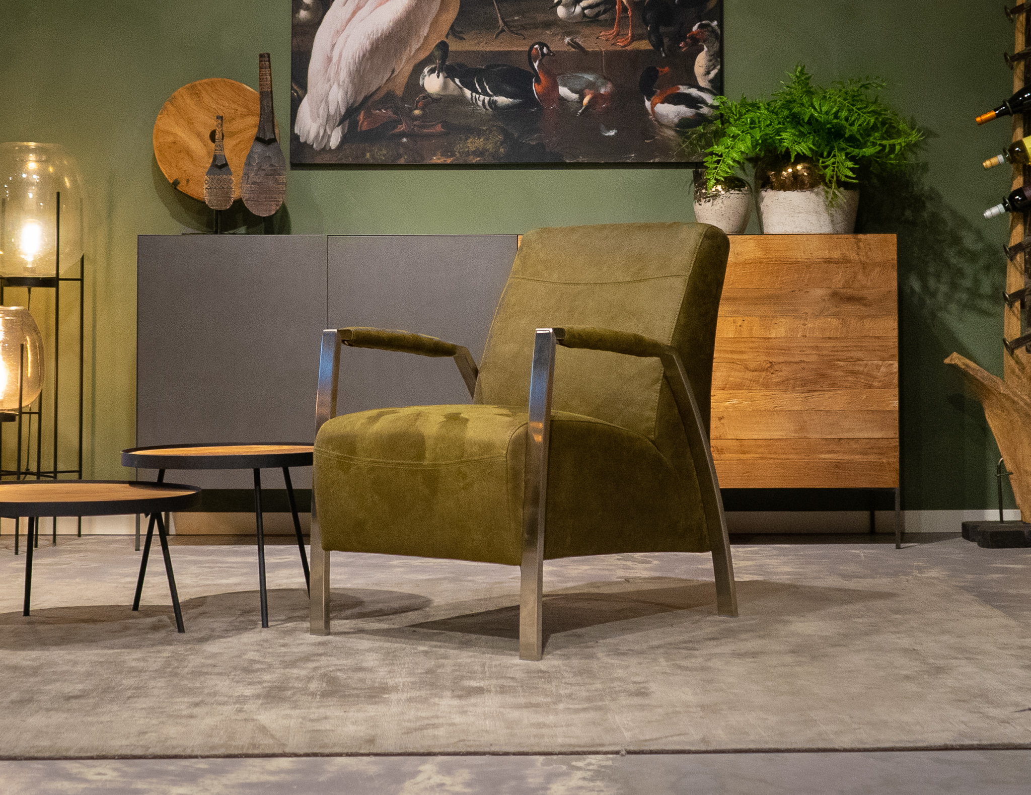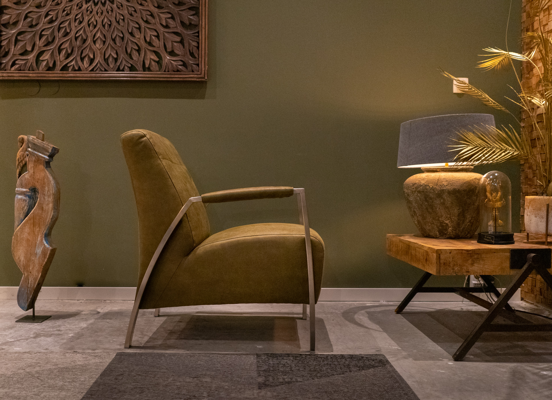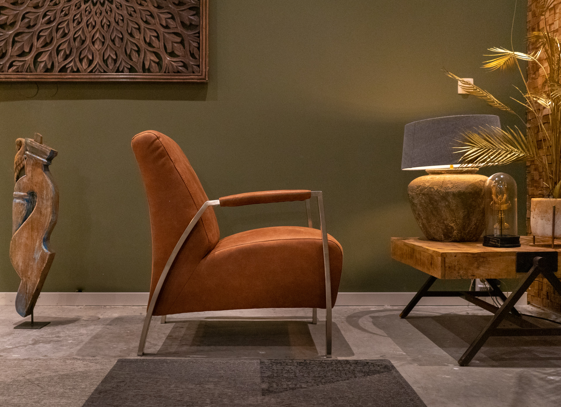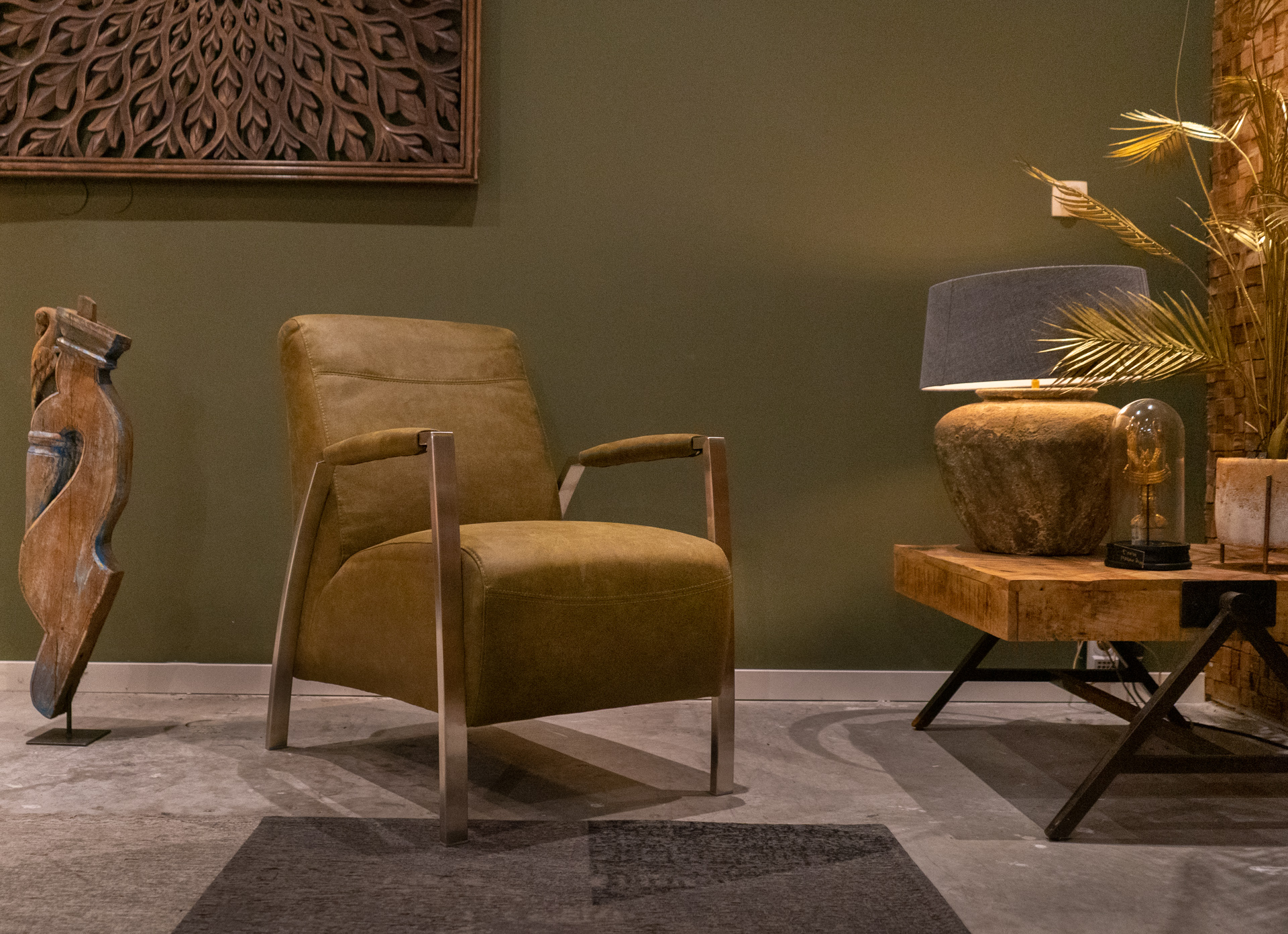 Stoere fauteuil leverbaar in leer en stof. Dit model leveren we in diverse kleuren. Het onderstel kan zowel in geborsteld als zwart staal gemaakt worden.