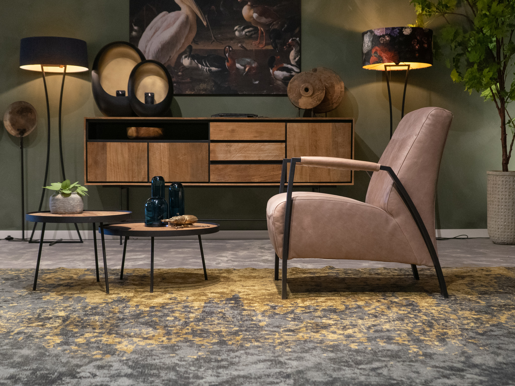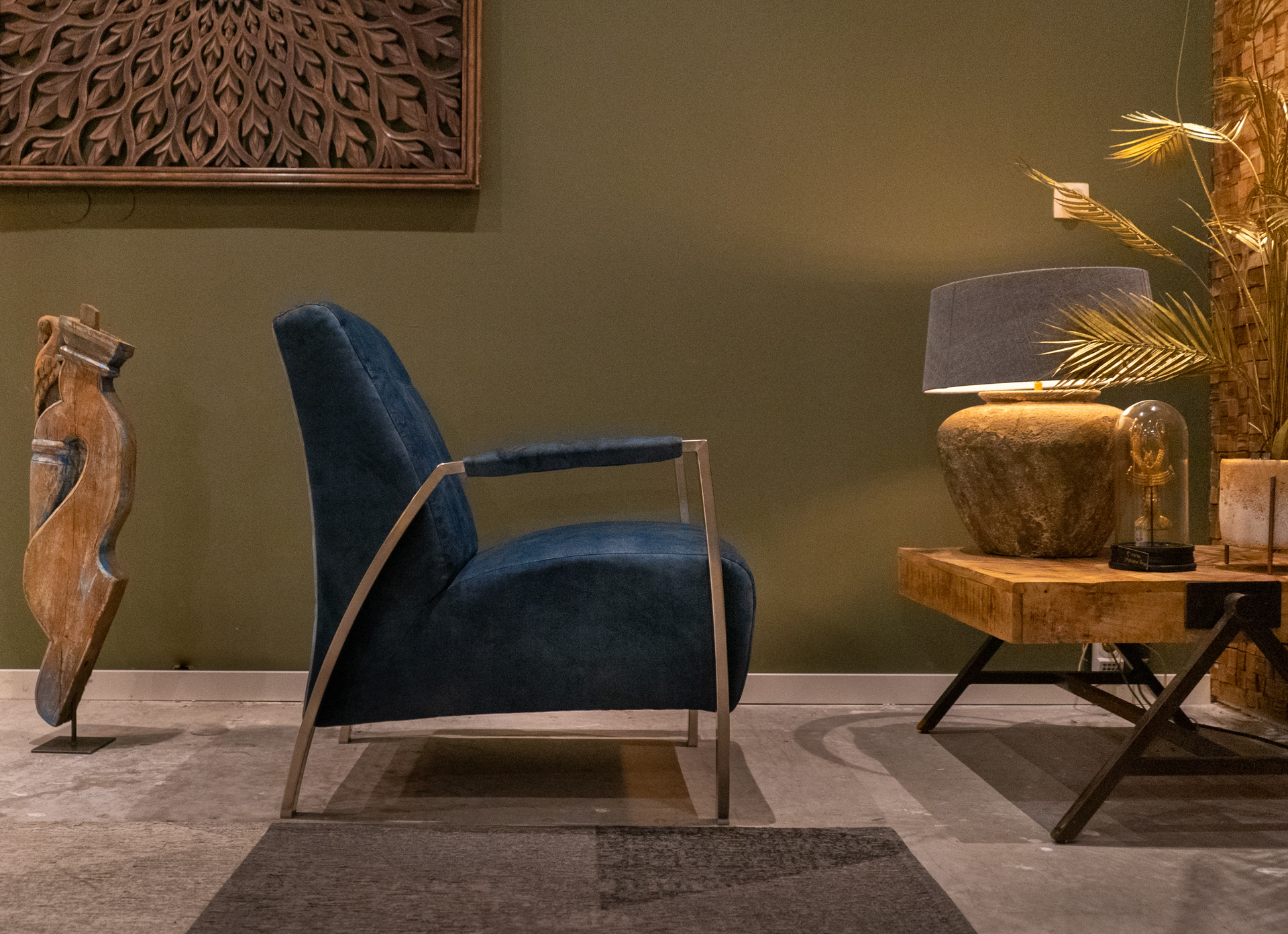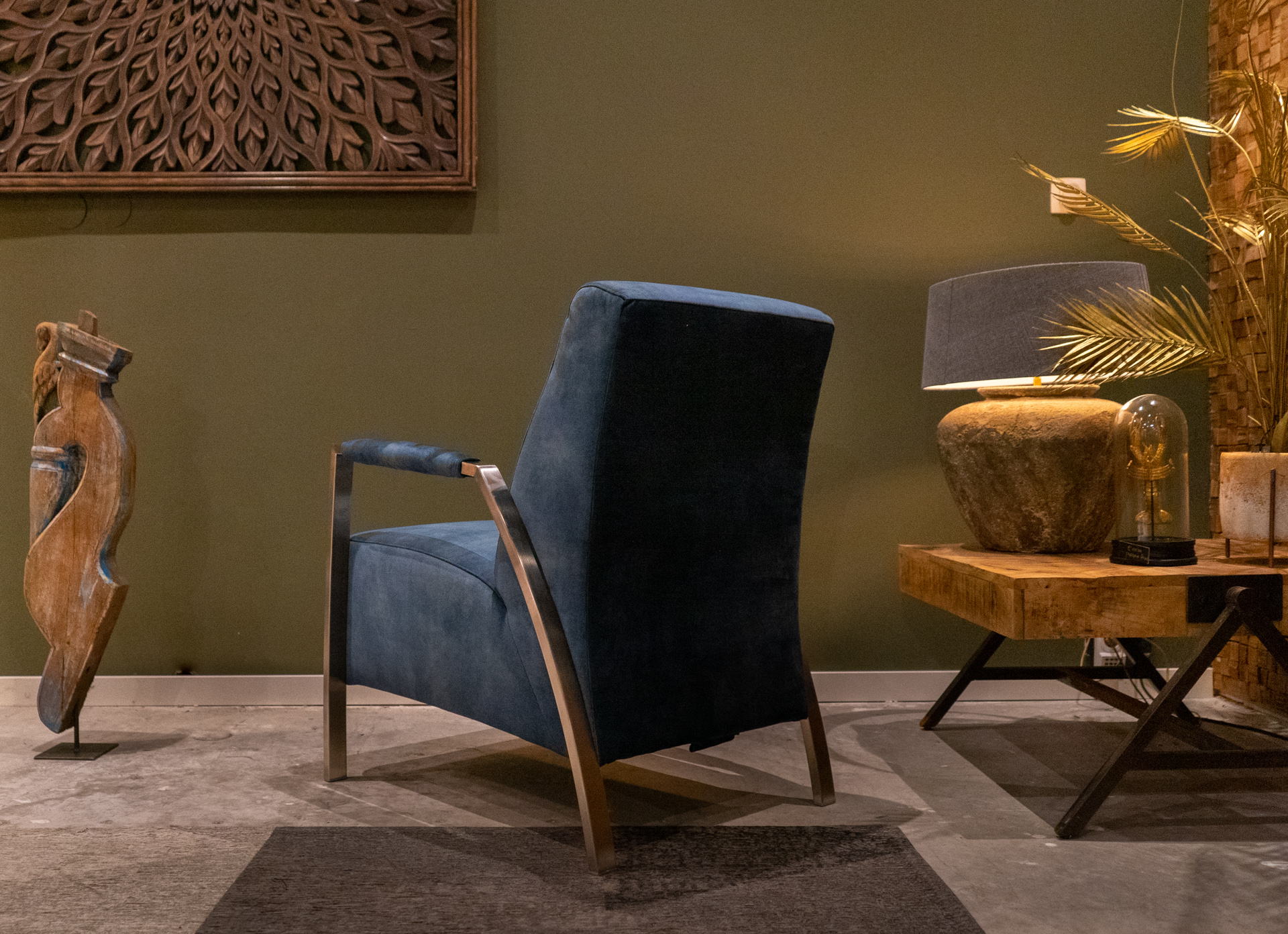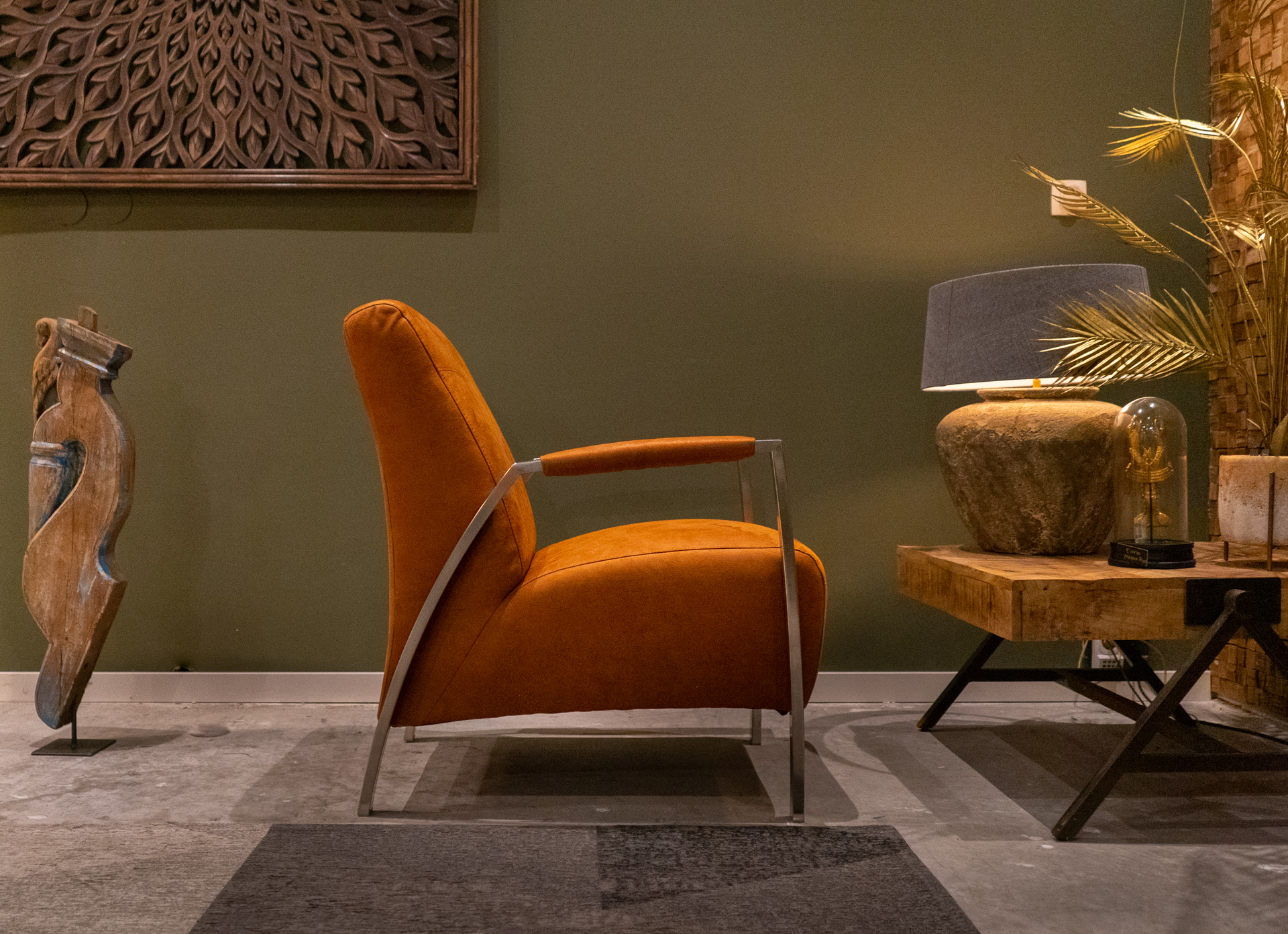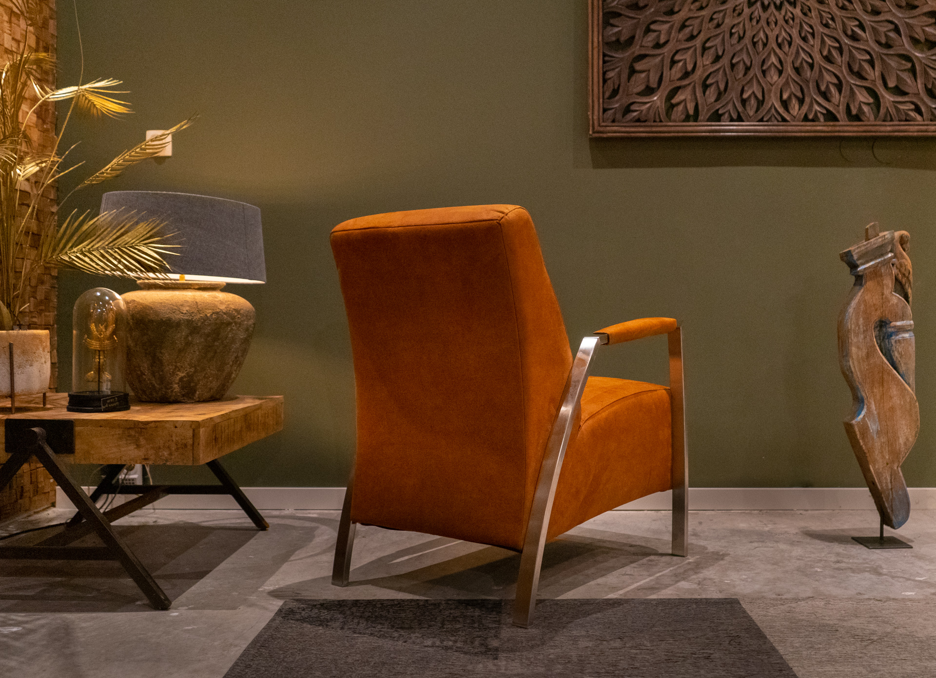 Stoere fauteuil leverbaar in leer en stof. Dit model leveren we in diverse kleuren. Het onderstel kan zowel in geborsteld als zwart staal gemaakt worden.