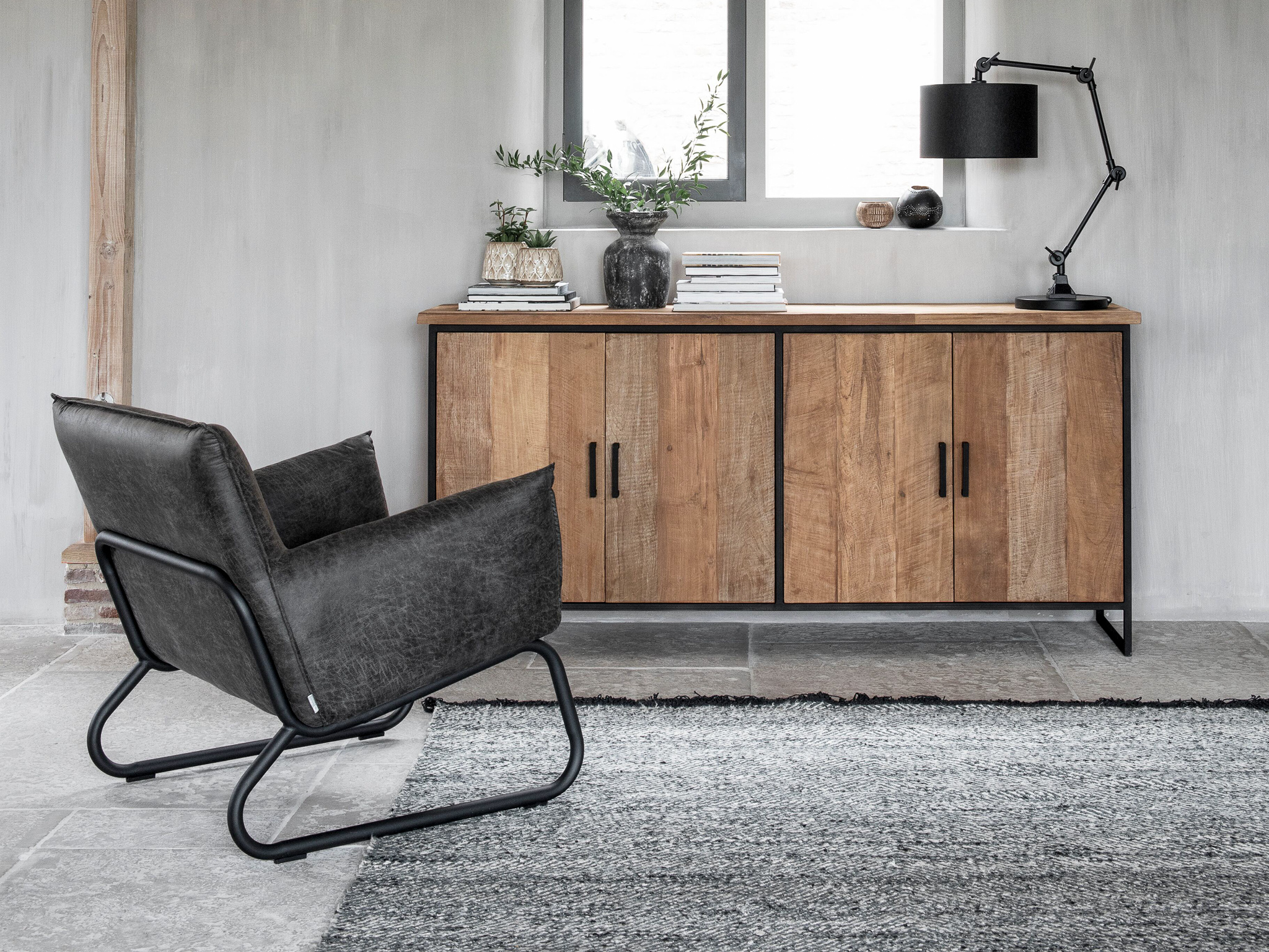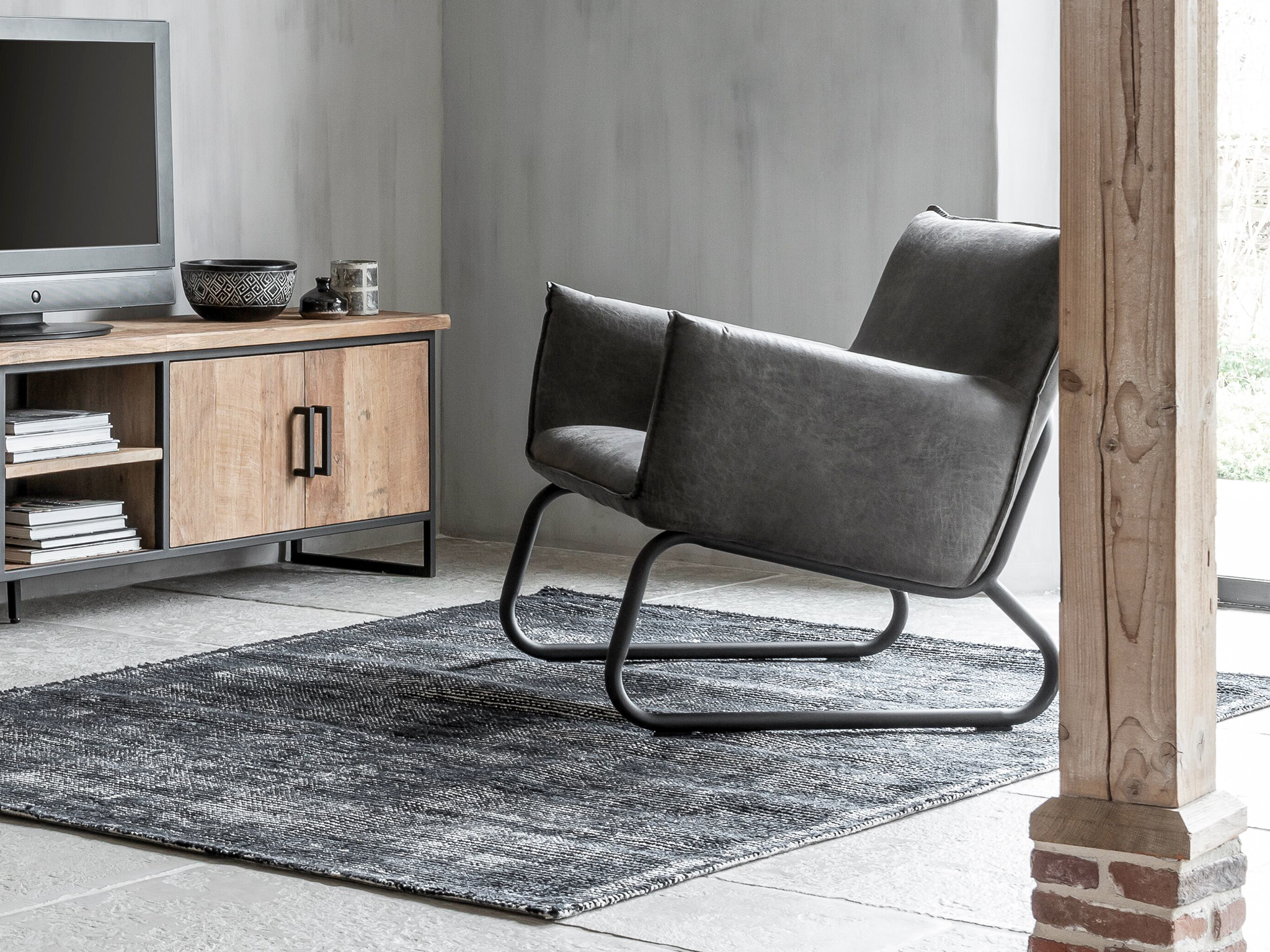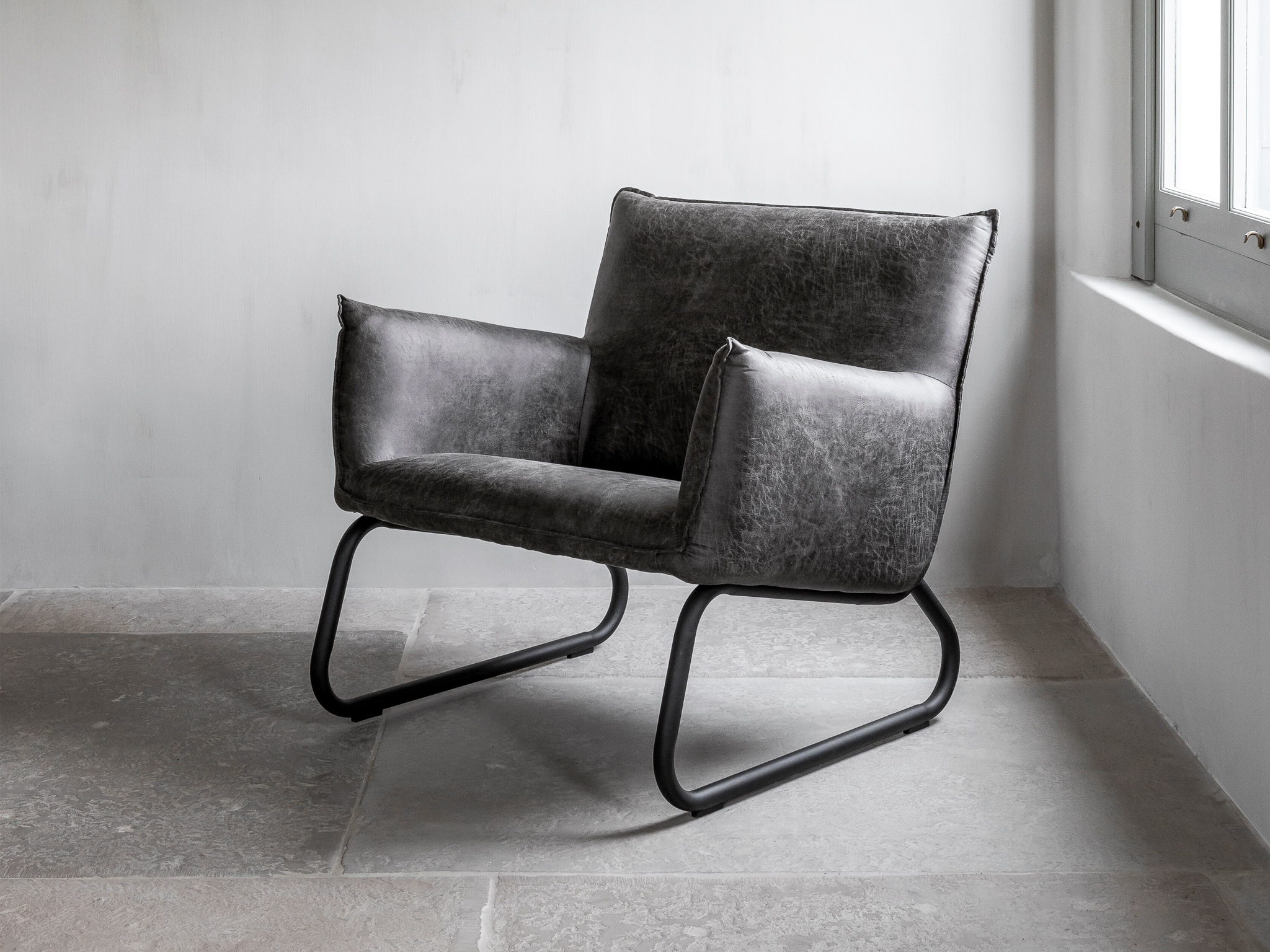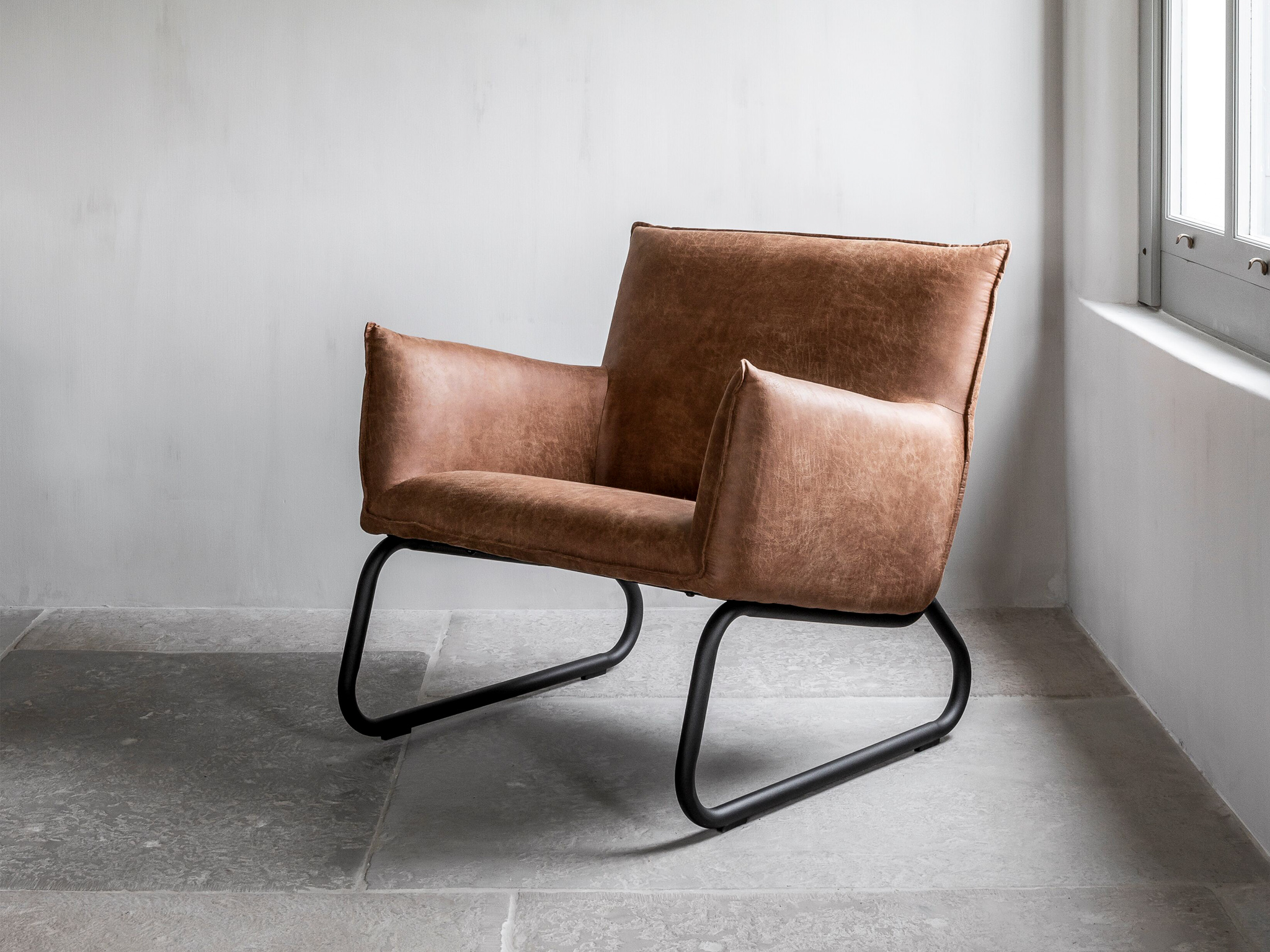 Stoere comfortabele loveseat-fauteuil Toledo met armleuningen, leverbaar doorgaans direct uit voorraad in 2 kleuren gerecycled leder, te weten grey en cognac. Dit materiaal is eenvoudig gegarandeerd vlekvrij te krijgen met een Protexx behandeling. Daarnaast is de fauteuil afgewerkt met een metalen frame wat de industriële look compleet maakt.
