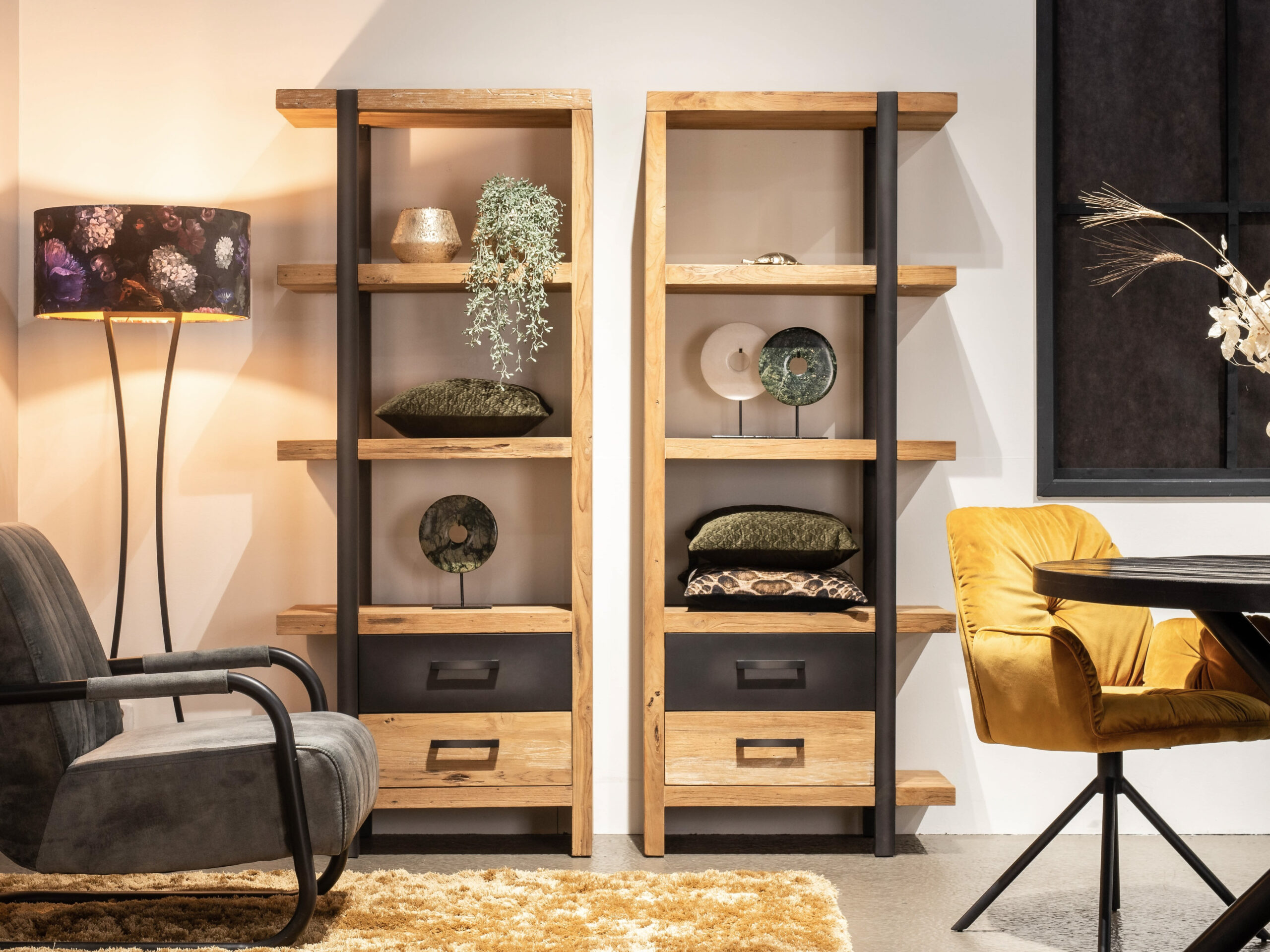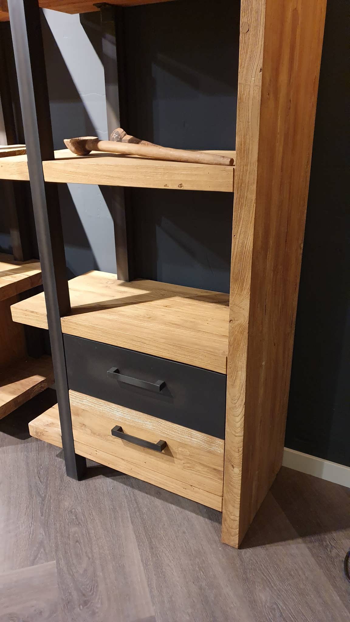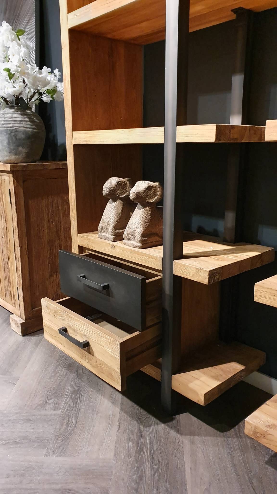 Stoere boekenkast van oud recycled teak en stalen poten. Dit model is leverbaar in 2 varianten, links en rechts, het links en rechts geeft aan waar de kant van de kast open is.