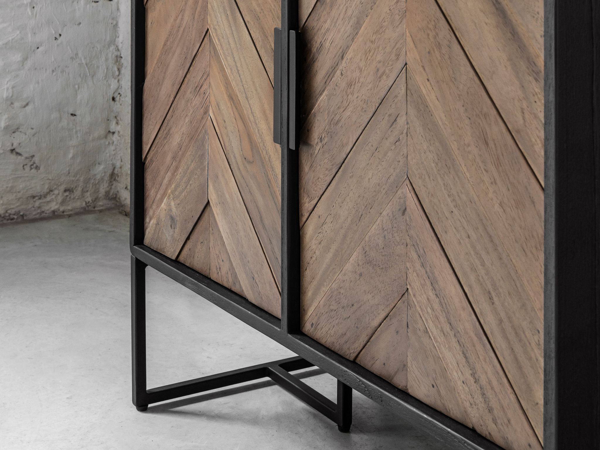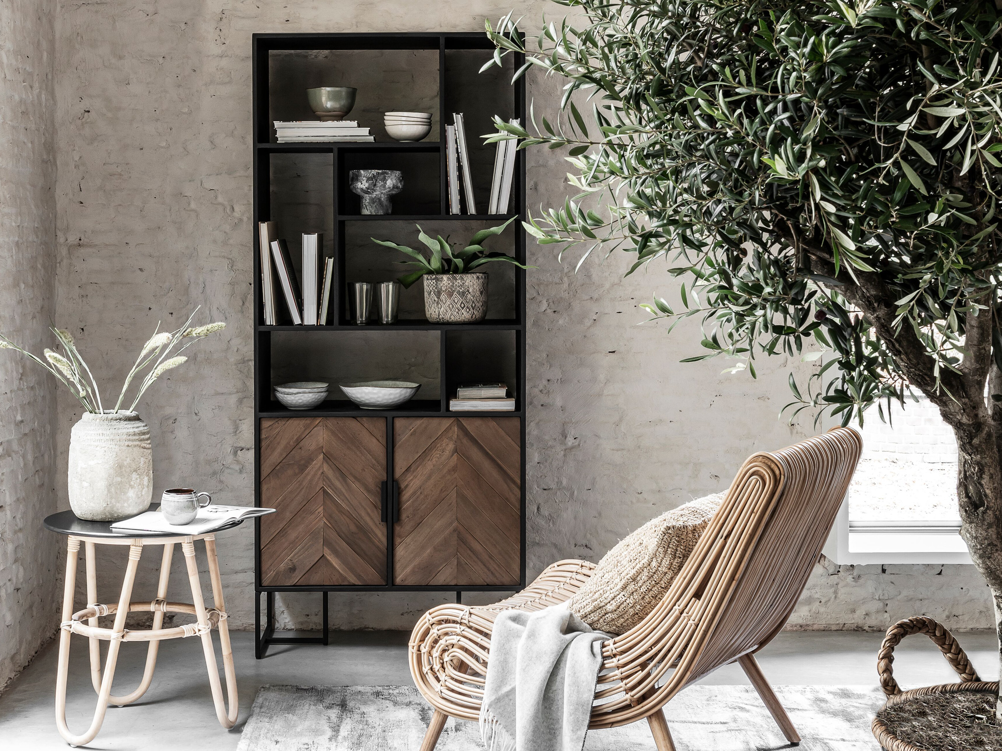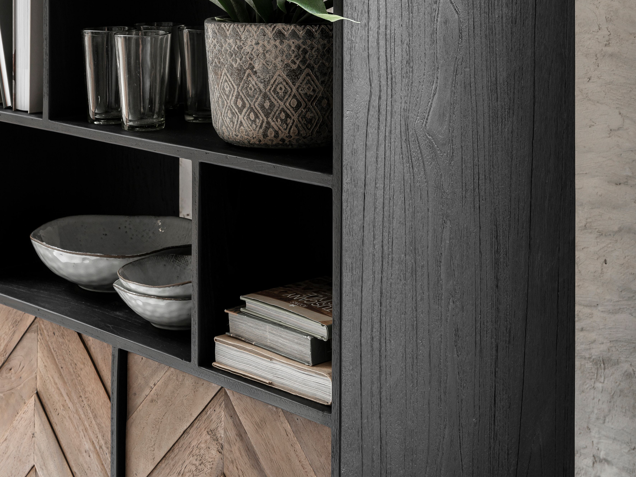 Stoere boekenkast Padula van oud teak met 2 deuren en een aantal open vakken, leverbaar doorgaans uit voorraad. De boekenkast is leverbaar in de maat 80x40x185cm. De Padula serie is uniek doordat de teak planken in visgraat motief zijn geplaast om zo het meubel een karakteristiek uiterlijk te geven. De combinatie van het zwart gebeitste hout en het oude gerecyclede teak zorgt voor een erg warme en robuuste uitstraling.