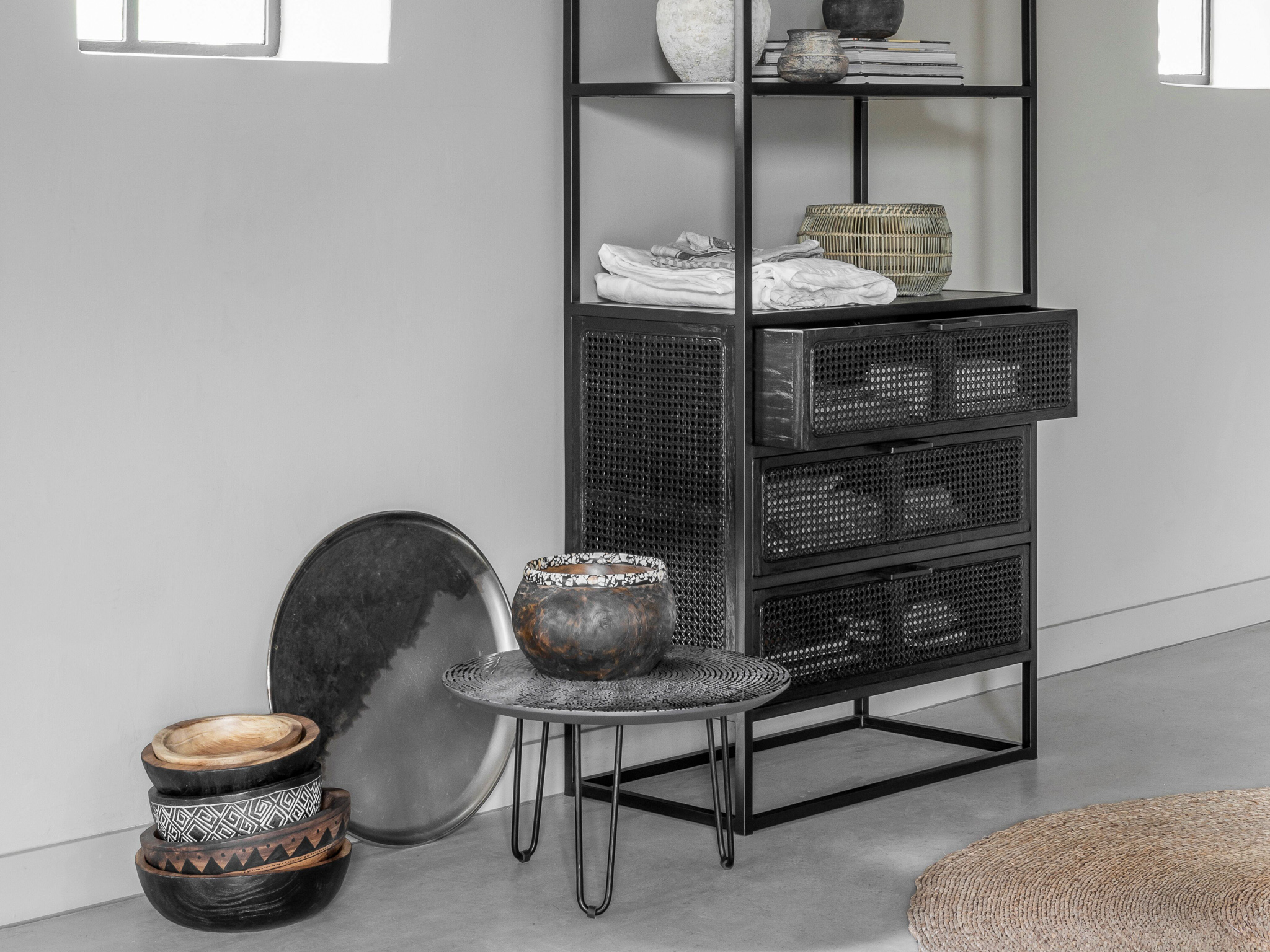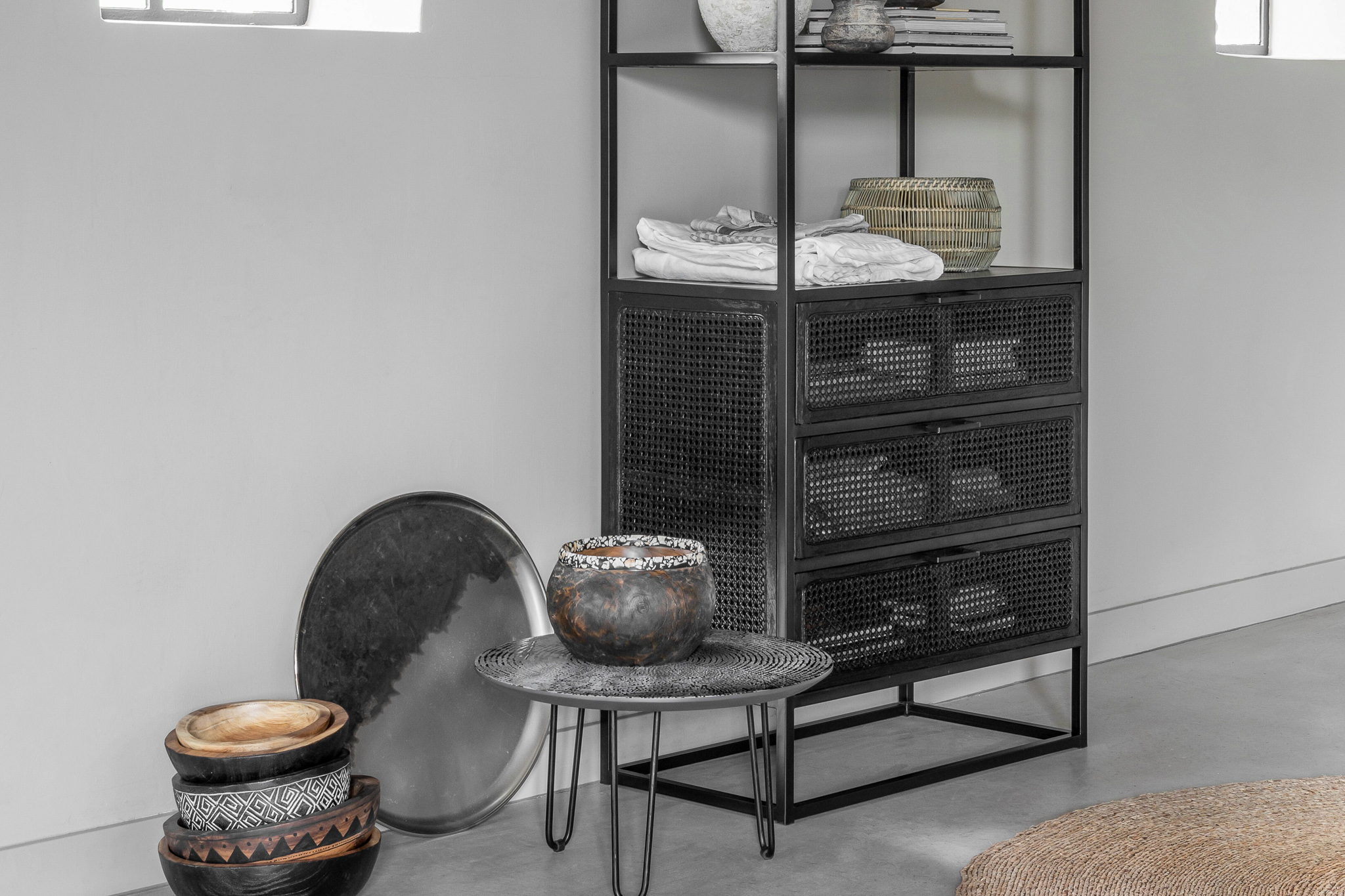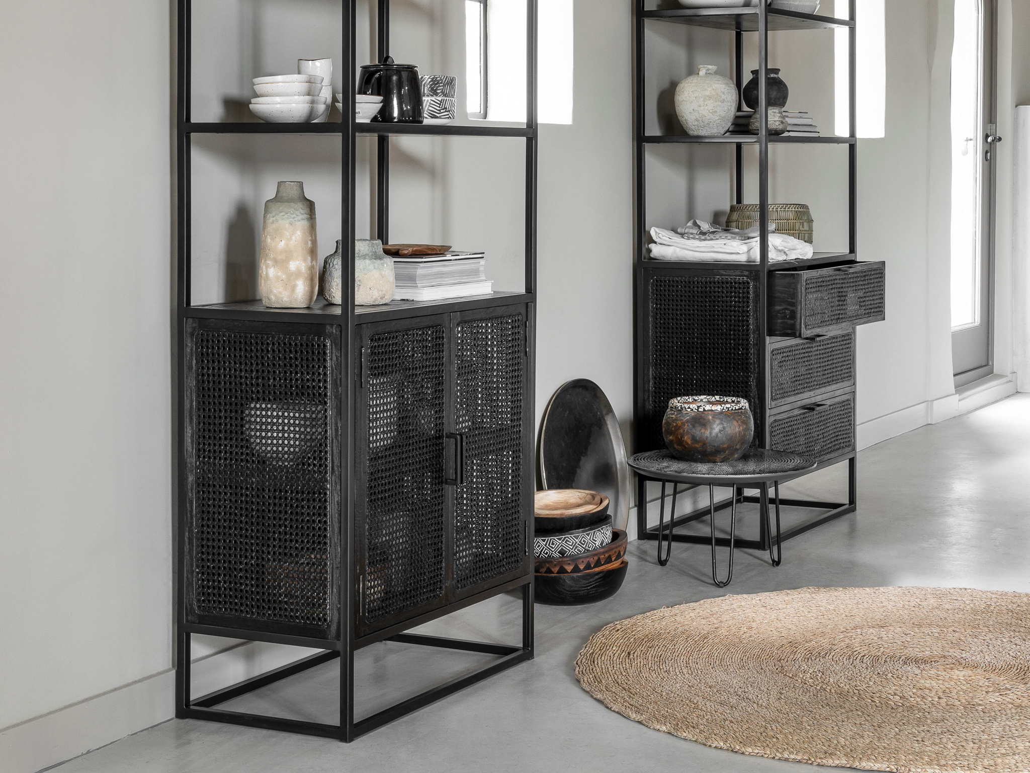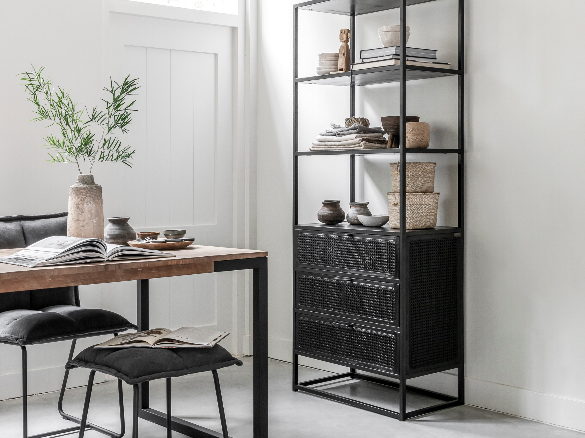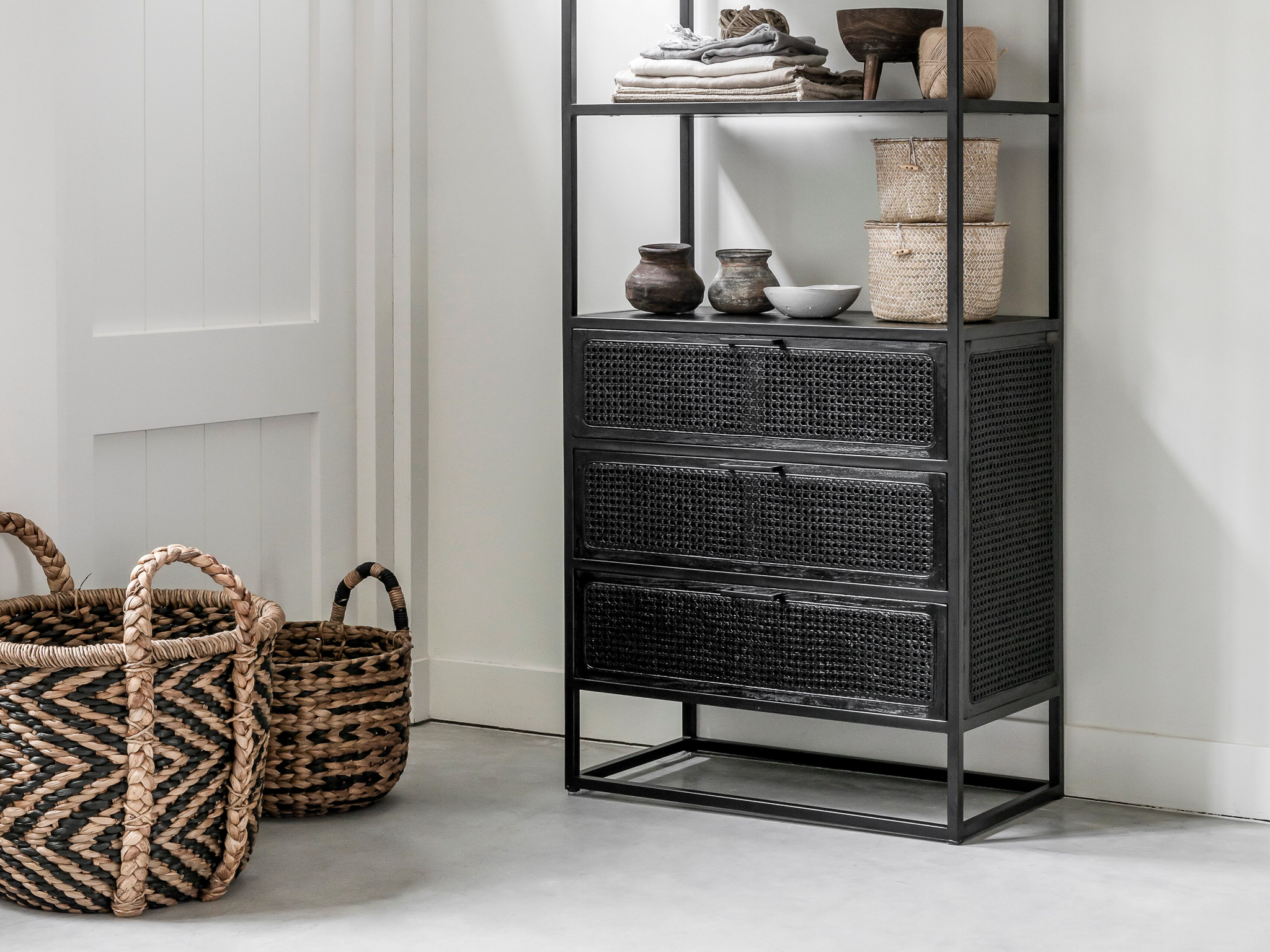Unieke, karakteristieke, boekenkast Veyron van oude rotanstengels met 3 laden of 2 deuren deuren en zwart stalen onderstel. De Veyron serie is doorgaans direct uit voorraad leverbaar. Deze kast is uitsluitend leverbaar in de maat 75x40x190cm. De Veyron serie is kenmerkend door de zwart gemaakte rotangstengels, ook wel ´webbing´ genoemd. De overige panelen van deze kast zijn gemaakt van oud zwartgebeitst hout. Het meubel is tevens voorzien van een stalen onderstel wat weer bijdraagt aan de industriële uitstraling.
