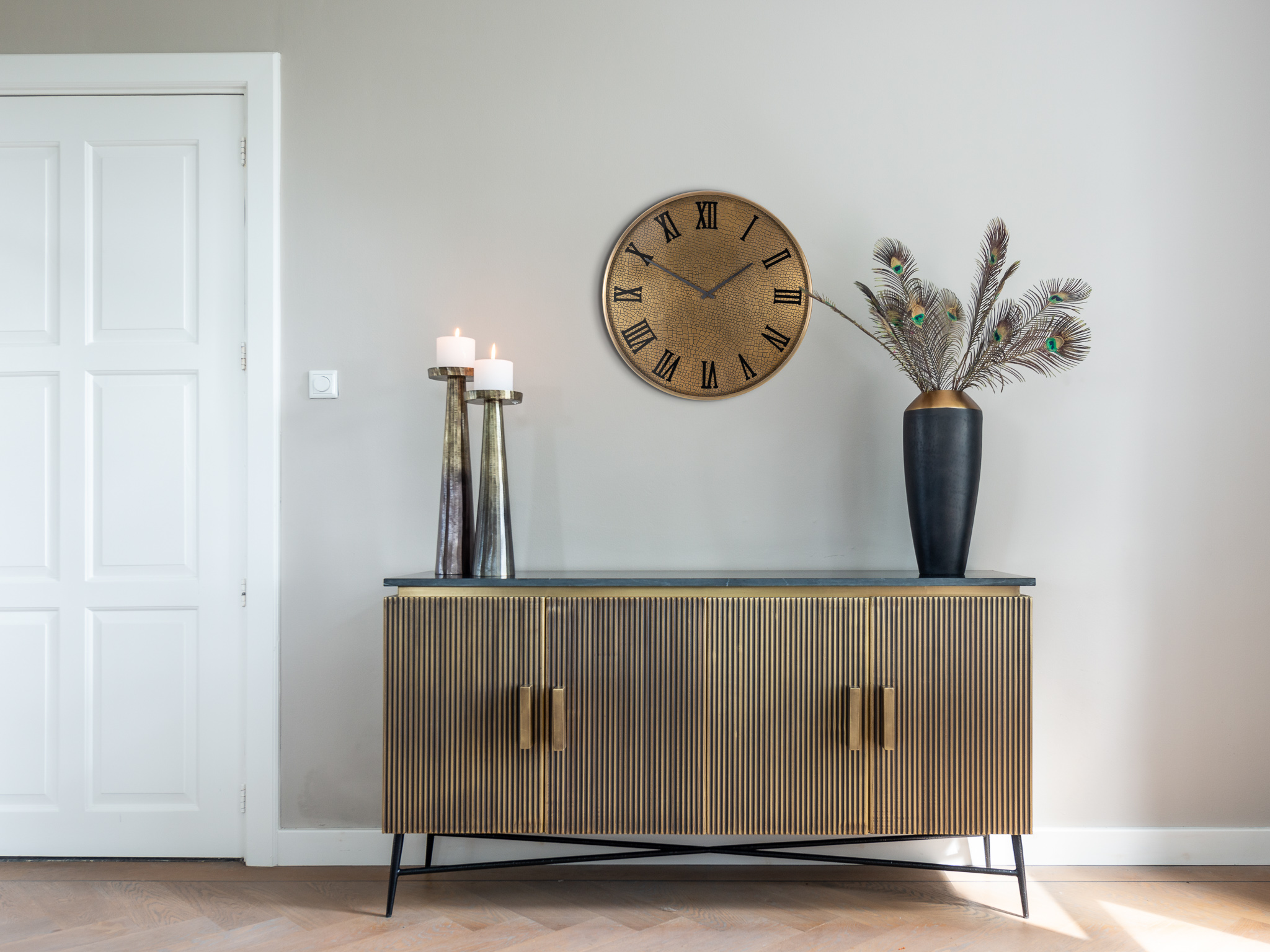 Dressoir Colmar is een uniek dressoir in goud / messing met geribbeld reliëf en zwart marmeren blad. Mid-Century Modern stijl (jaren zestig) in een nieuw jasje! Robuust chique!…