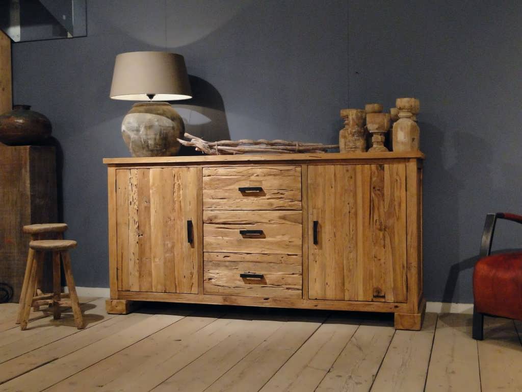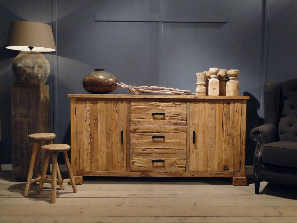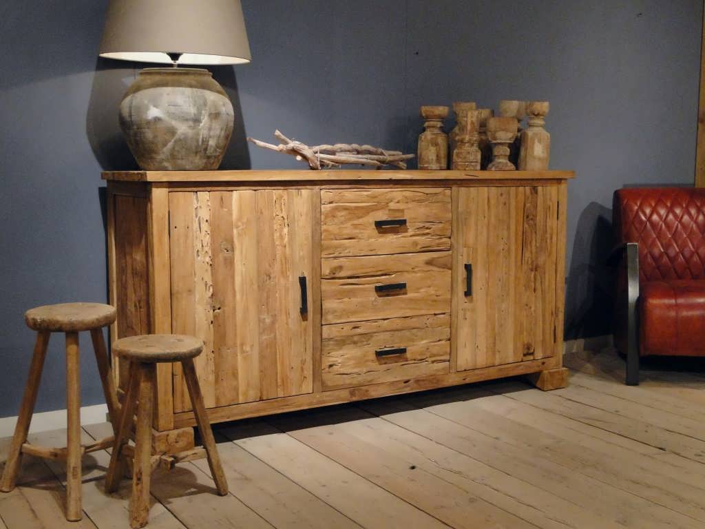 Stoer dressoir van oud recycled teak, ook wel driftwood genoemd. Leverbaar met 3 of 6 laden. Dit model combineert mooi met onze andere producten van oud hout zoals bijvoorbeeld onze tafel Brunoy of kloostertafel Tressot.