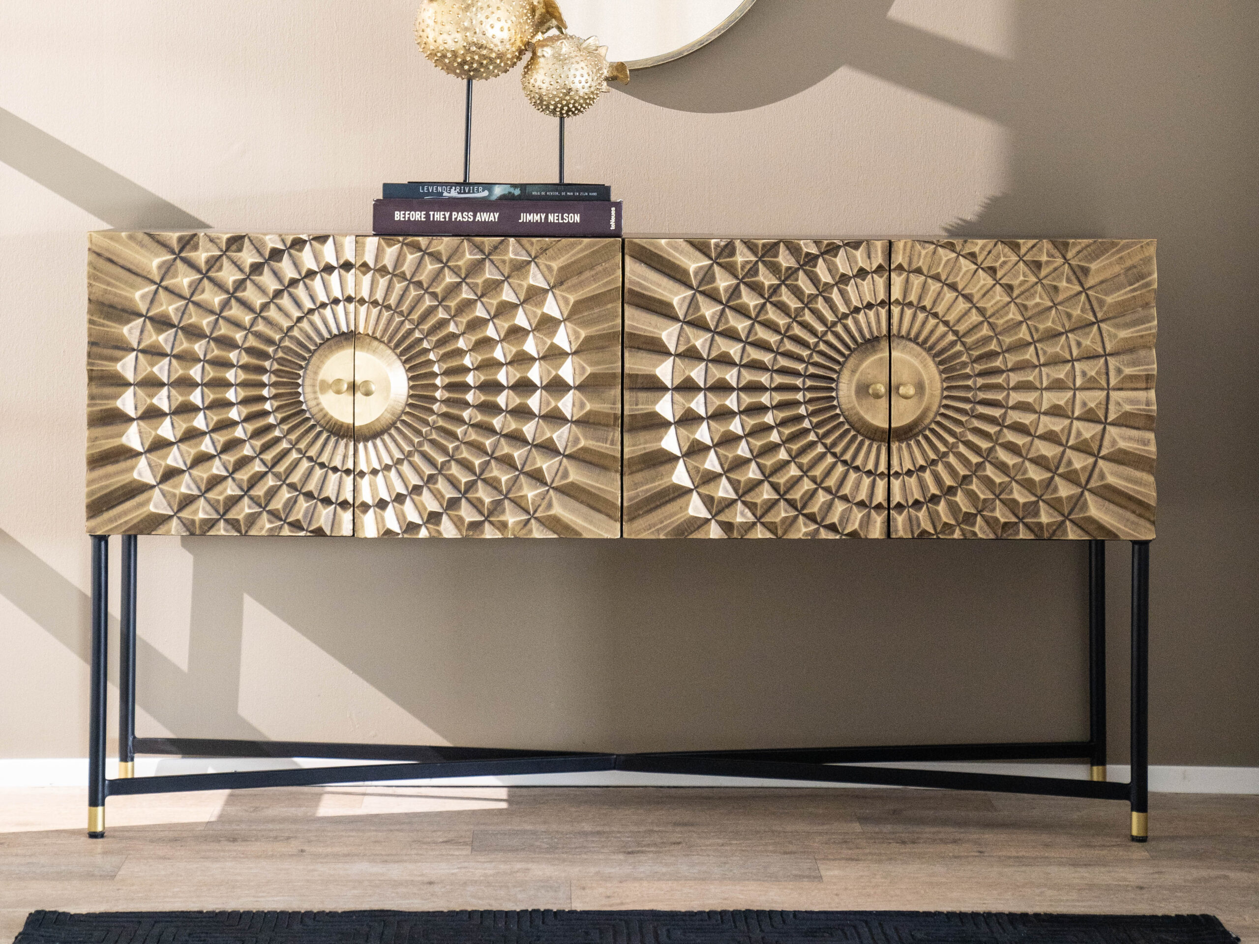 Met het prachtige dressoir Gladstone van Robuuste Tafels kunt u een relatief saaie woonkamer in één klap transformeren naar een trendy, chique, ruimte. Dit model bevat opvallende gouden deuren met reliëf en structuur. De gouden details in het onderstel maken de look compleet. Het is echt een zonnetje in huis!