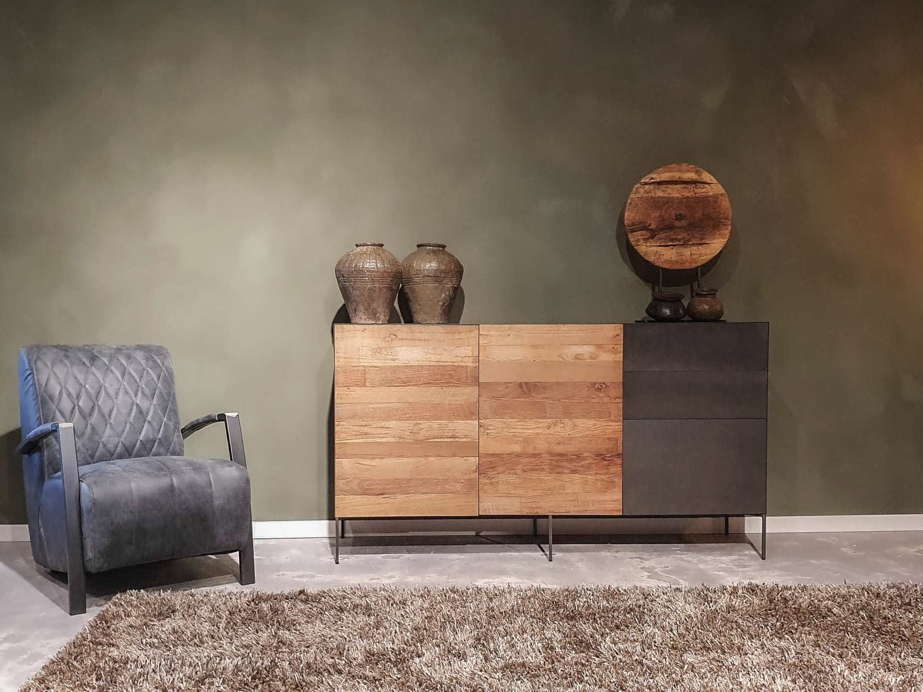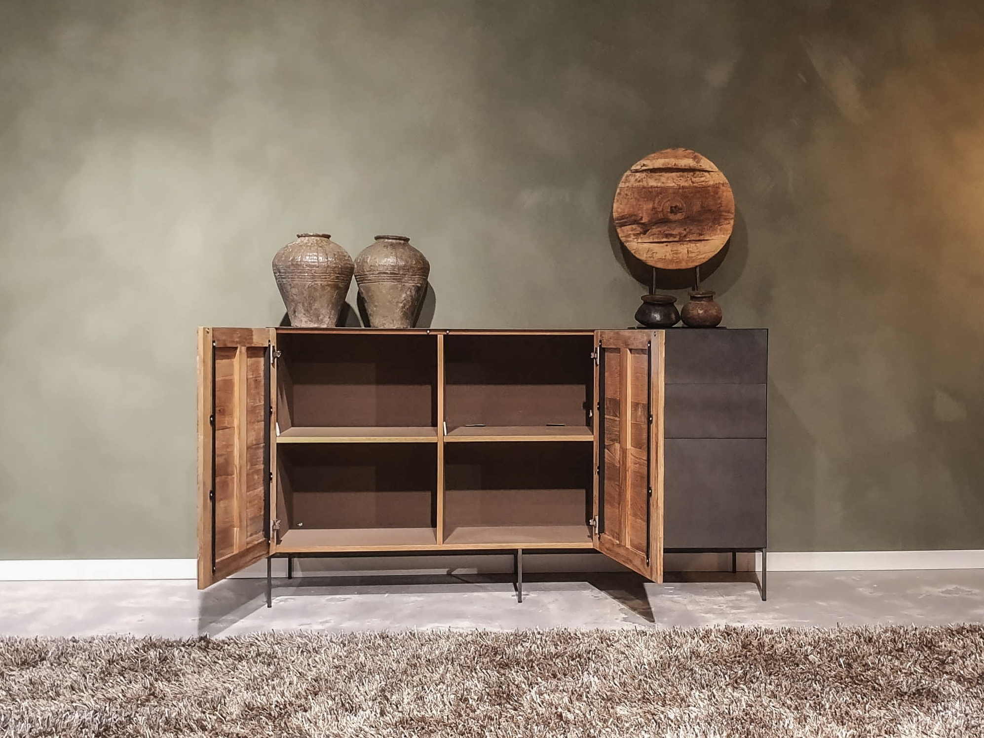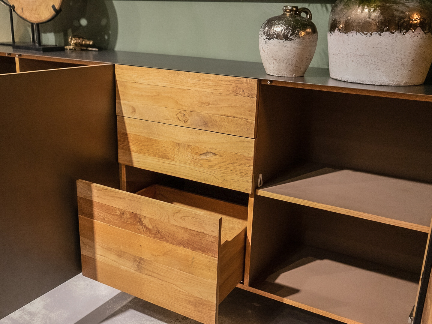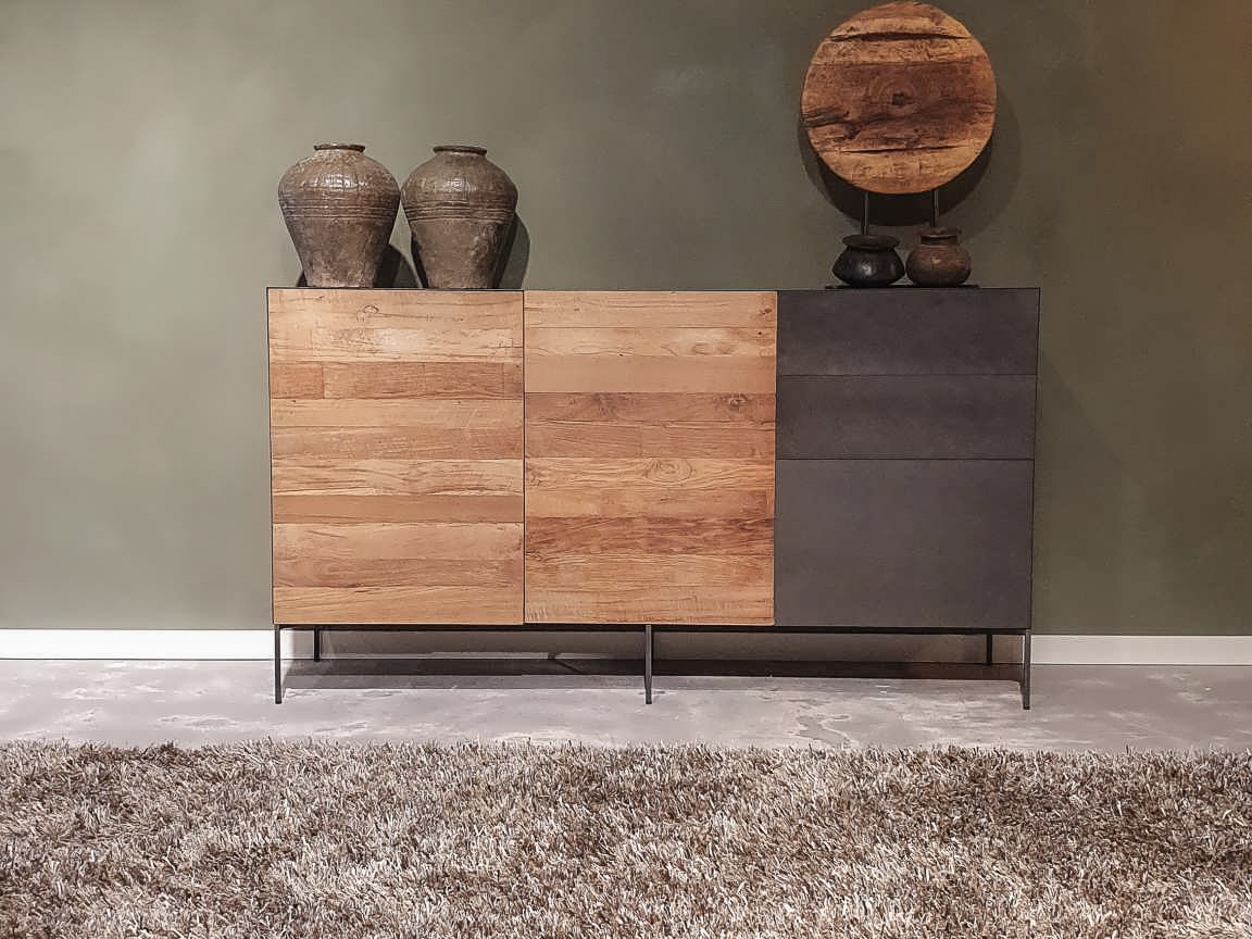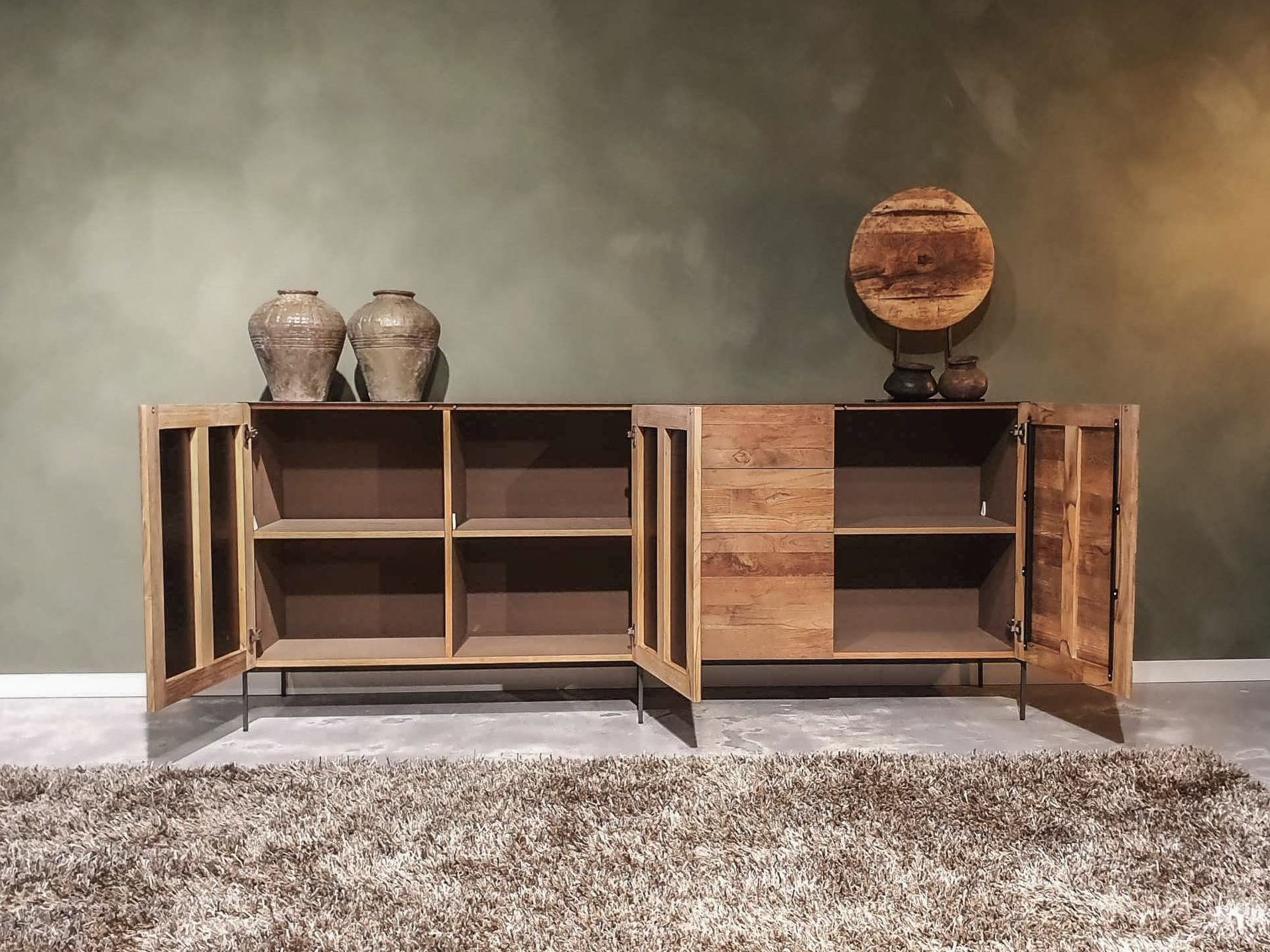 Mooi rank dressoir met stalen pootjes, gemaakt van oud recycled teak met stalen poten en mooie staal look deuren boven. De deurtjes en laden zijn greeploos en opent u middels een push to open systeem. Doorgaans direct uit voorraad leverbaar in 2 maten. Dit model combineert uiteraard mooi bij de overige meubels uit de Parrano serie, maar ook zeker bij de Cavallo, Ferro, Noma en Maldini welke ook gemaakt zijn van oud teak hout.