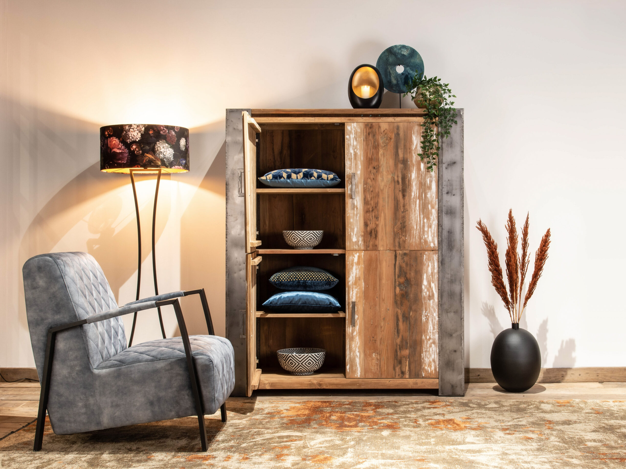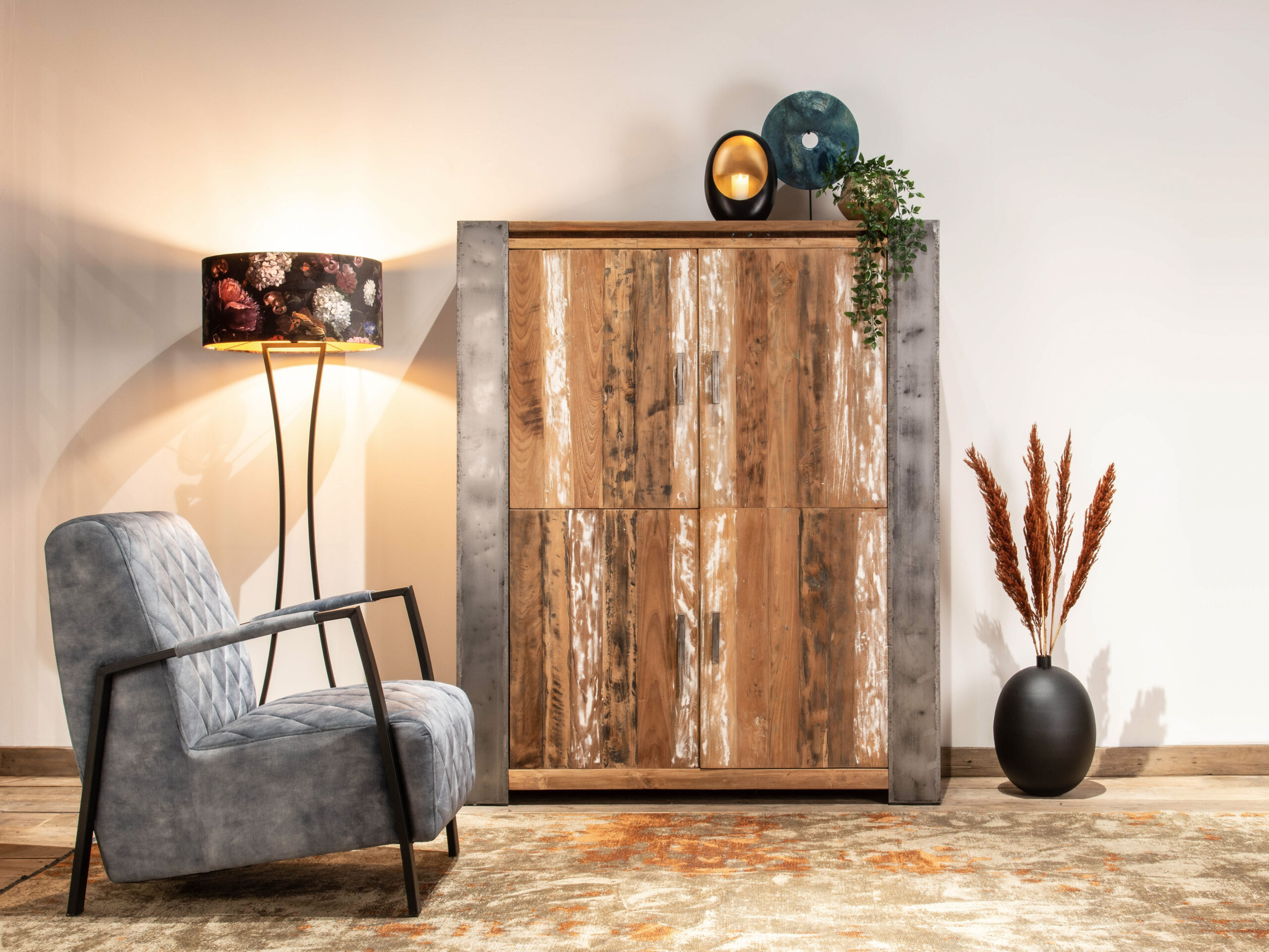 Robuuste kast van oud recycled teak en stalen poten. Dit model combineert mooi met onze tafel Asmund of een maatwerk model van oud eiken.