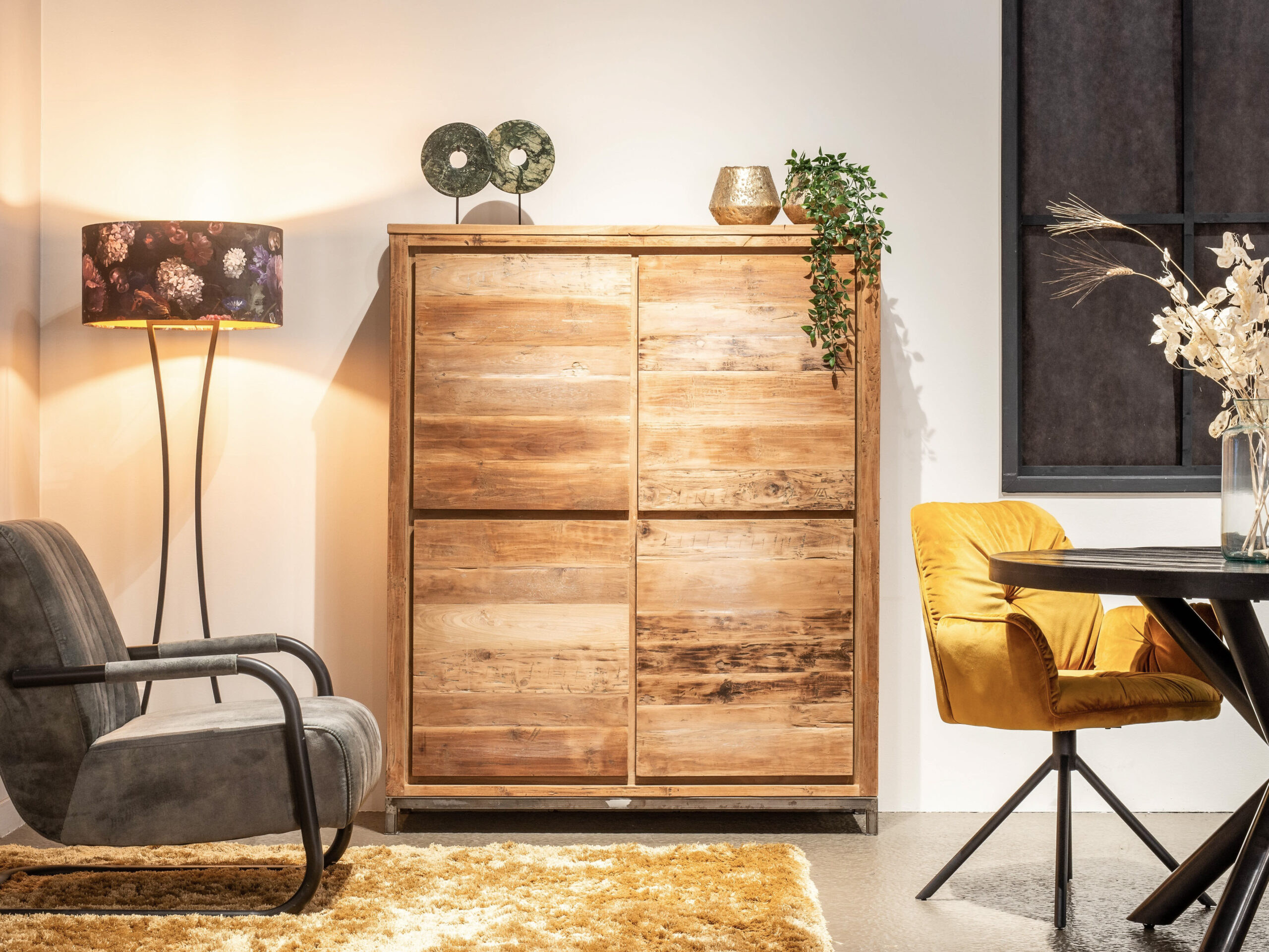 Onze meubels van recycled teak combineren heel mooi met de vele meubelen in oud hout welke we aanbieden. Of het nu een oud eiken eettafel of salontafel is, het oude hout met doorleefde uitstraling zal een fantastische combinatie zijn met deze handgemaakte meubels. Het combineren met onze andere series van teakhout is goed mogelijk met dit model.