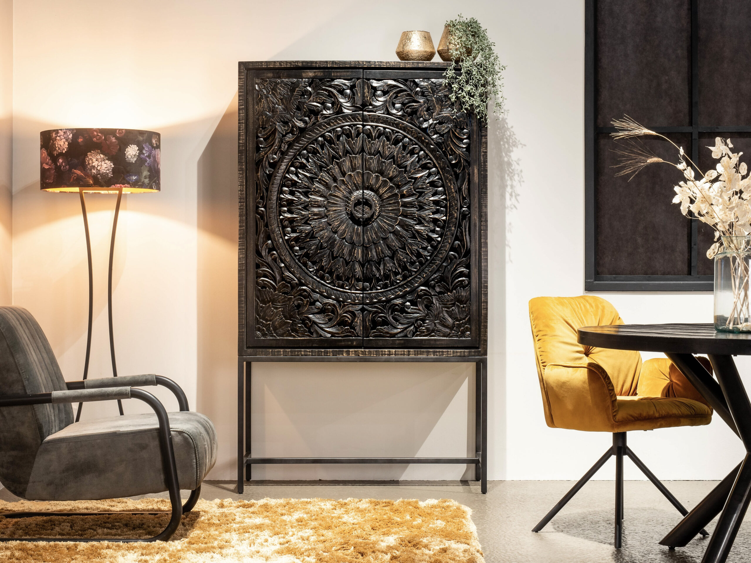 Stoere industriële kast met twee grote handsnijwerk deuren en een rank stalen frame. Deze opbergkast is gemaakt van zwart gebeitst oud hout. Dit model combineert mooi met de kast Callas met schuifdeuren en onze andere meubels in de kleur old black. De Callas kast is doorgaans direct uit voorraad leverbaar!