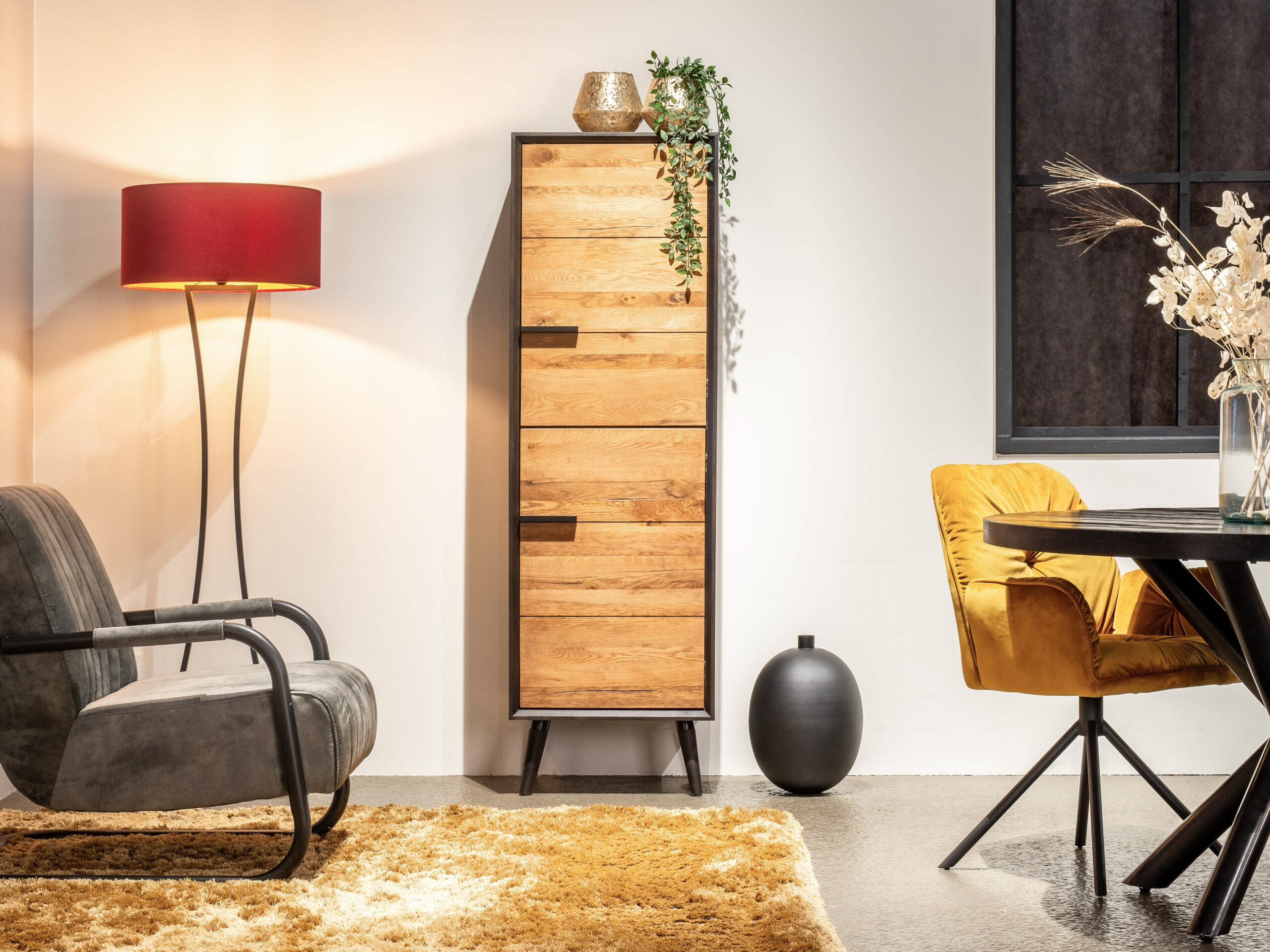 De opbergkast Lazzaro is een robuuste verschijning in het grote assortiment industriële meubels van Robuuste Tafels. Deze opbergkast kenmerkt zich door de twee massief eiken deuren en de retro poten onder de kast. De deuren sluiten met een soft-close systeem. De kleurcombinatie, bestaande uit twee warme tinten, geeft het meubelstuk zijn charme. Deze kast heeft een breedte van 55cm, een diepte van 45cm en een hoogte van 174cm. U kunt kiezen uit linksdraaiend of rechtsdraaiend. Naast een ranke hoge kast zijn er meerdere meubels in onze Lazzaro serie, zoals: een TV-meubel, grote opbergkast en een dressoir in twee maten. Doorgaans zijn de meubels uit onze Lazzaro serie direct uit voorraad leverbaar!
