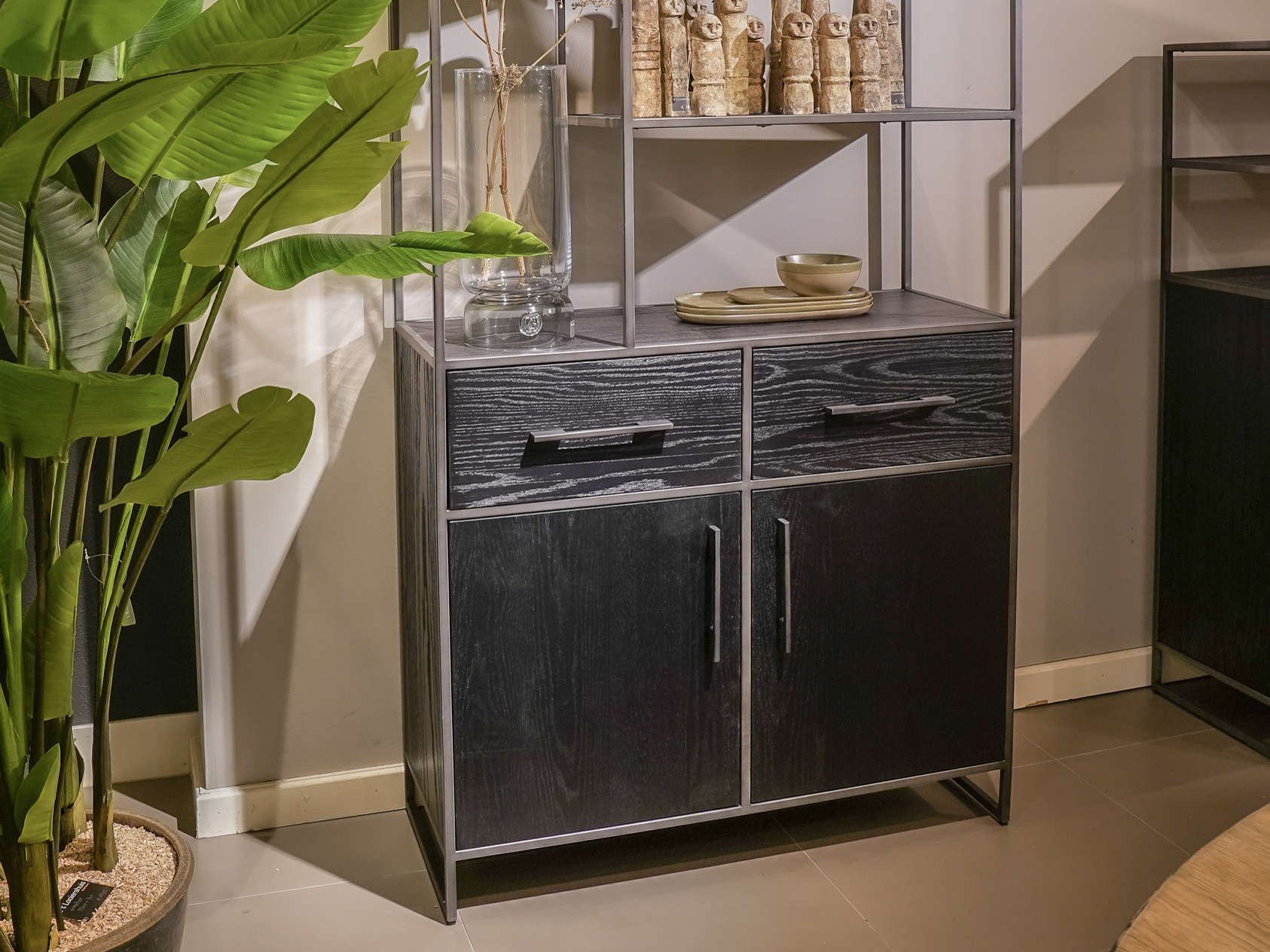 Robuuste kast gemaakt van eiken met een staal frame. Deze stoere kast is leverbaar in diverse uitvoeringen. Dit model combineert mooi met andere producten uit de Rochelle serie zoals de salontafel en tv-meubel.