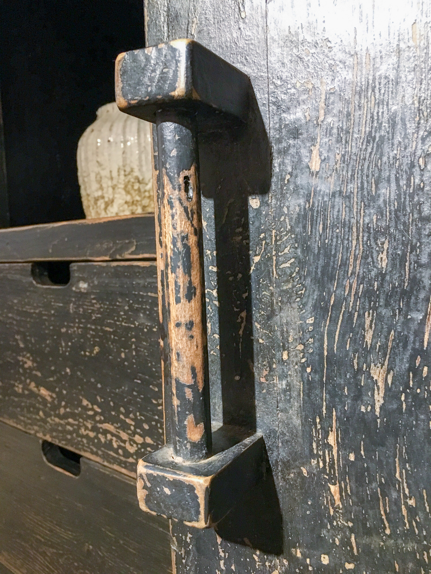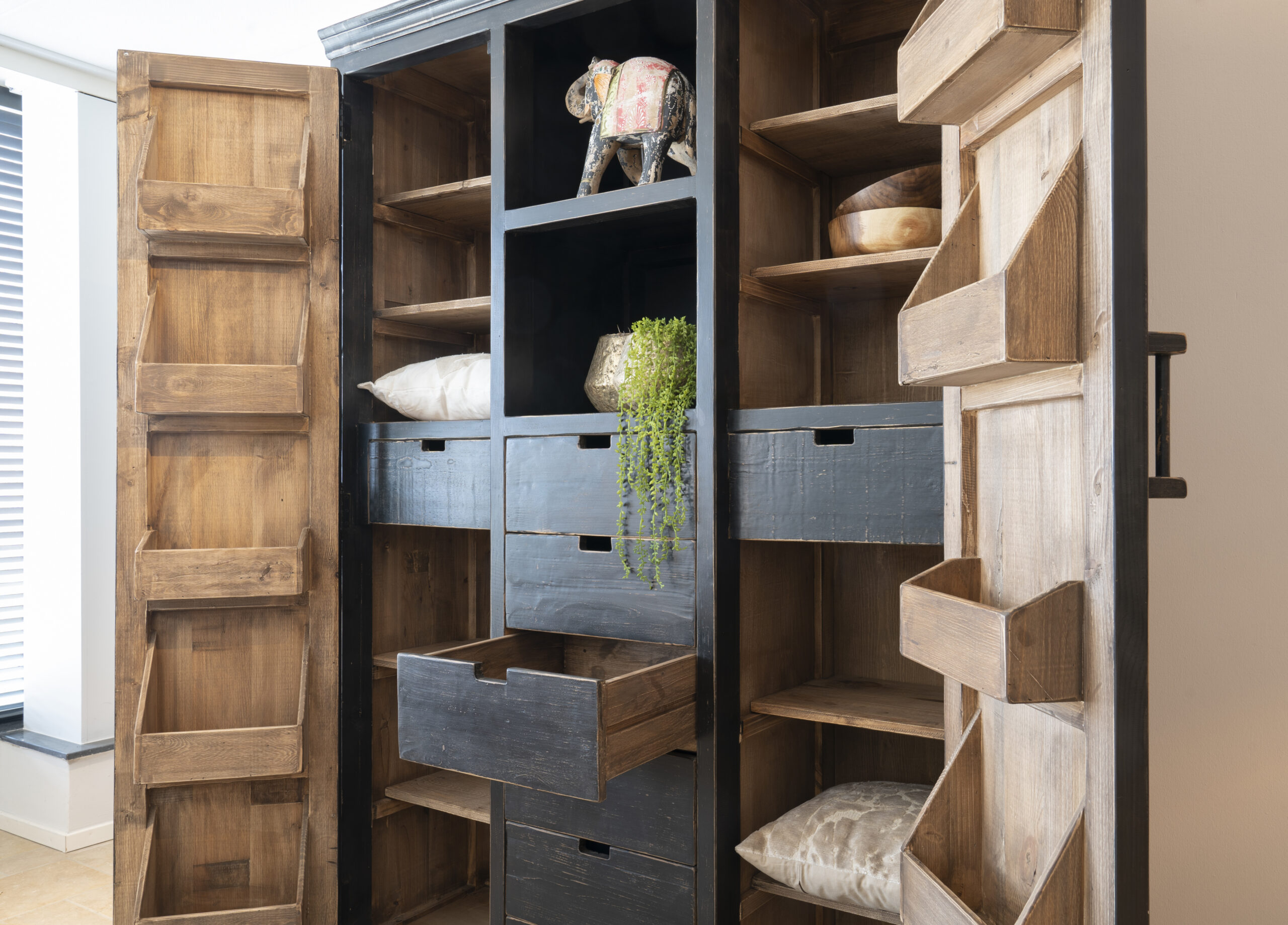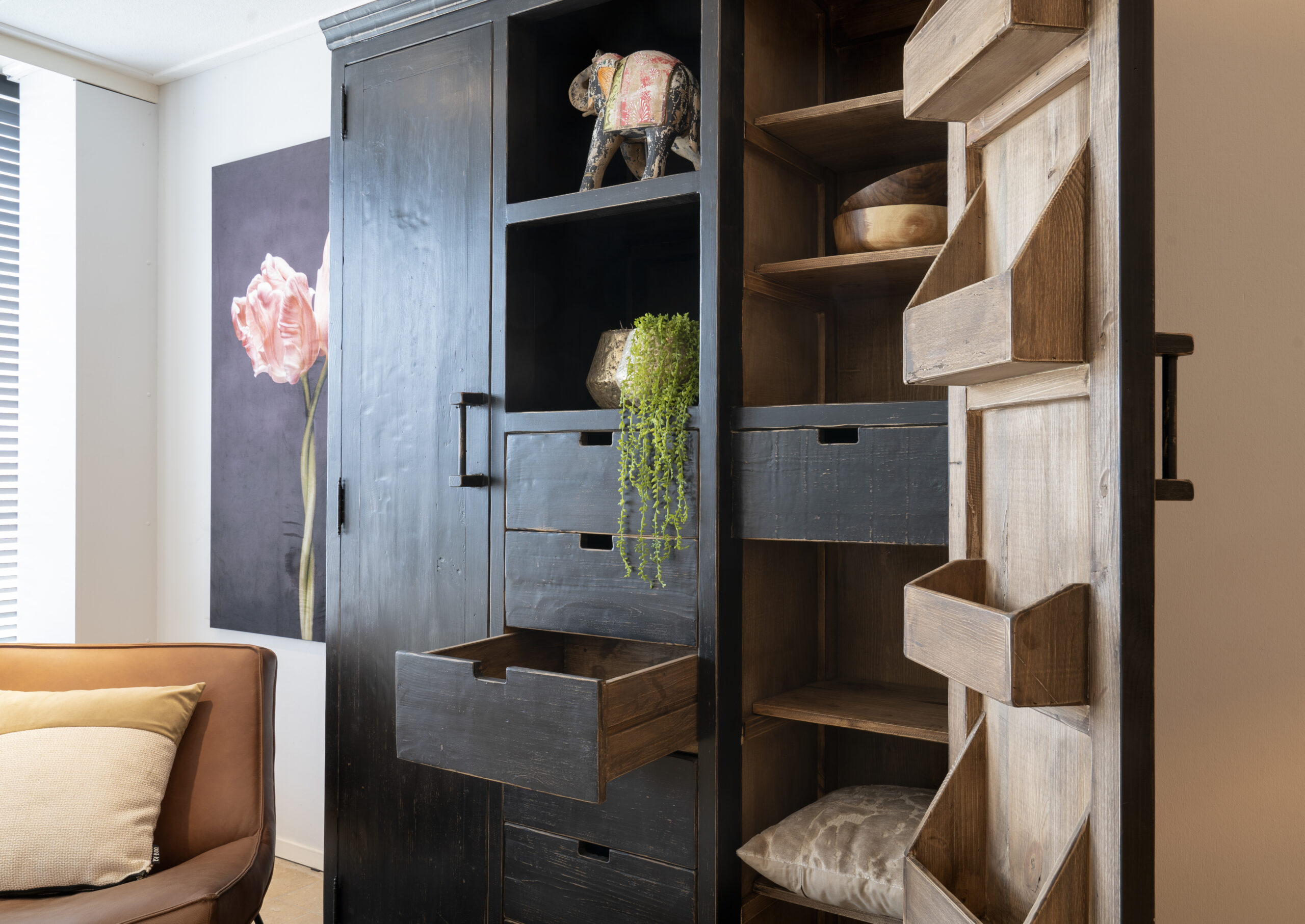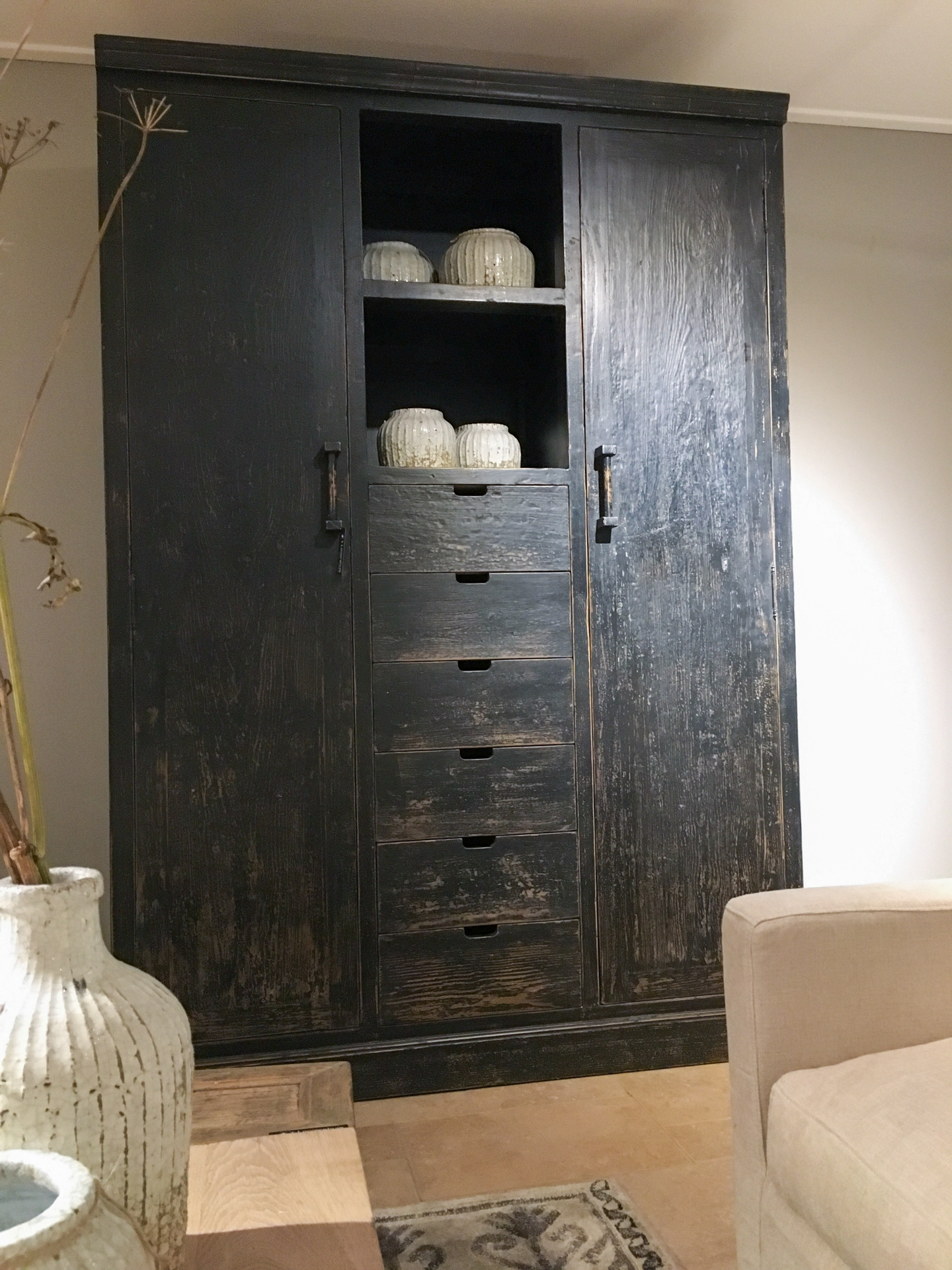 Stoere grote zwarte opbergkast met enorm veel opbergruimte, gemaakt van oud hout. Gemaakt van mooi authentiek hout met karakteristieke details, elk meubel is uniek en heeft zijn eigen karakter. Dit model is doorgaans direct uit voorraad leverbaar.