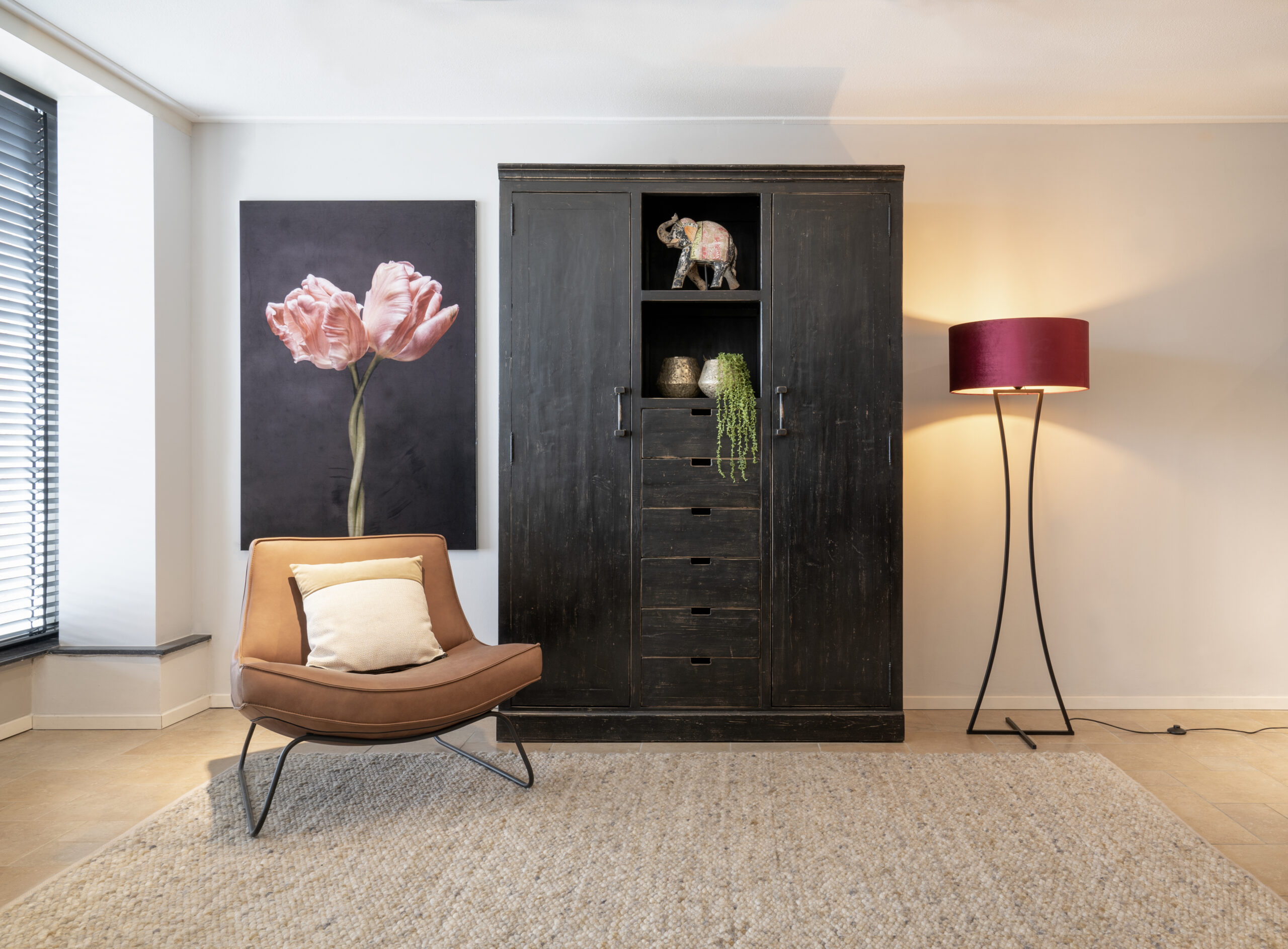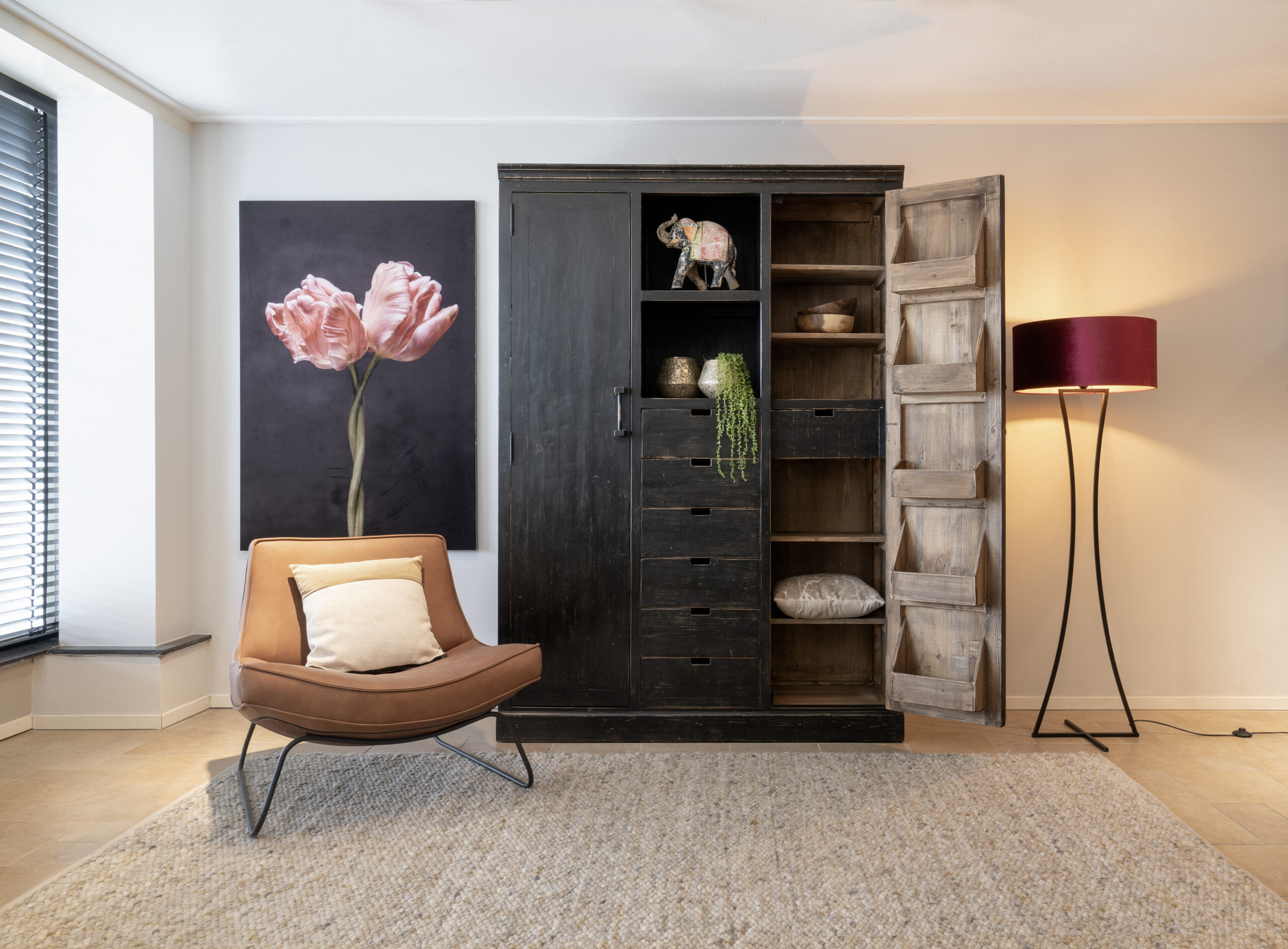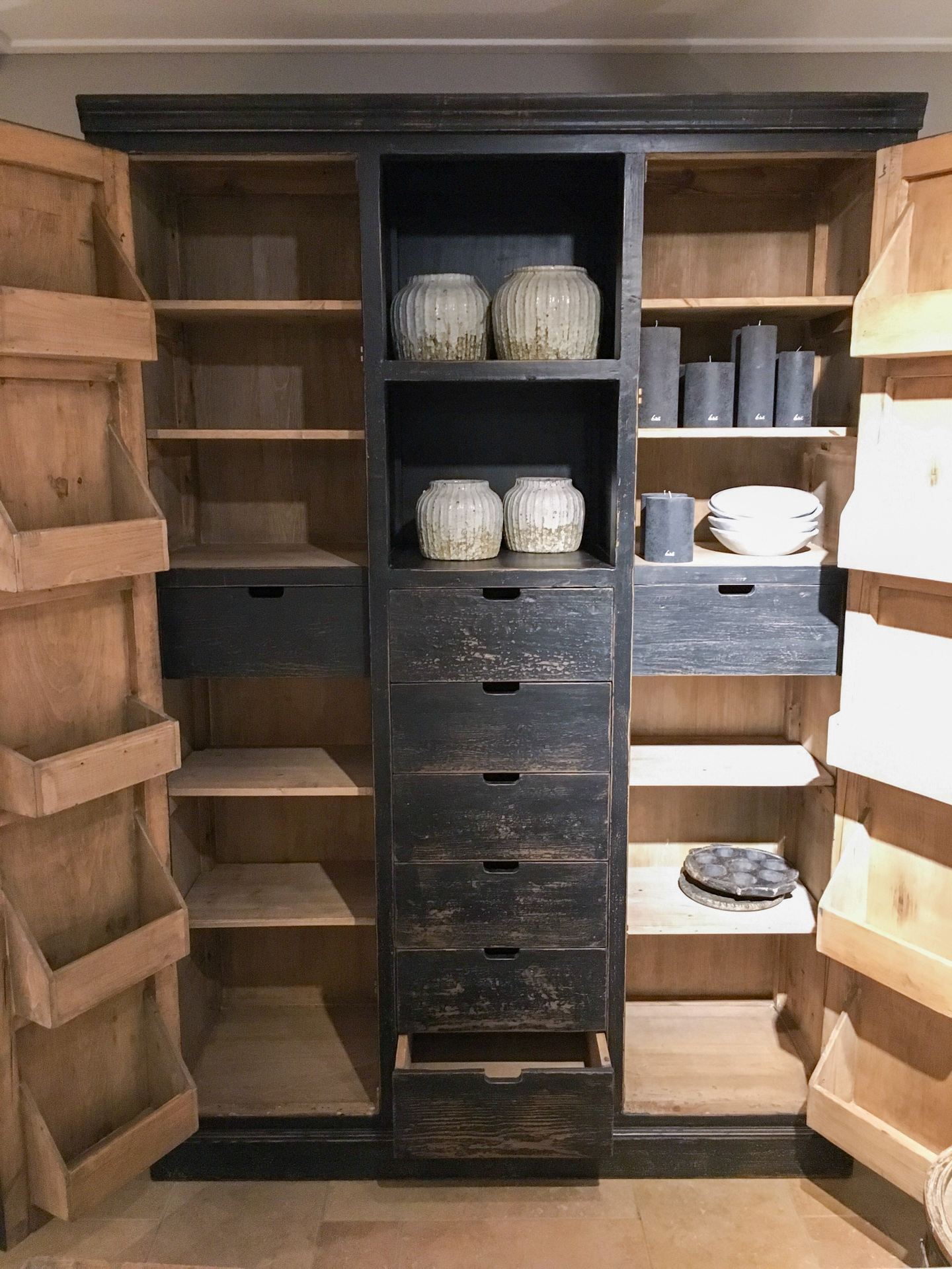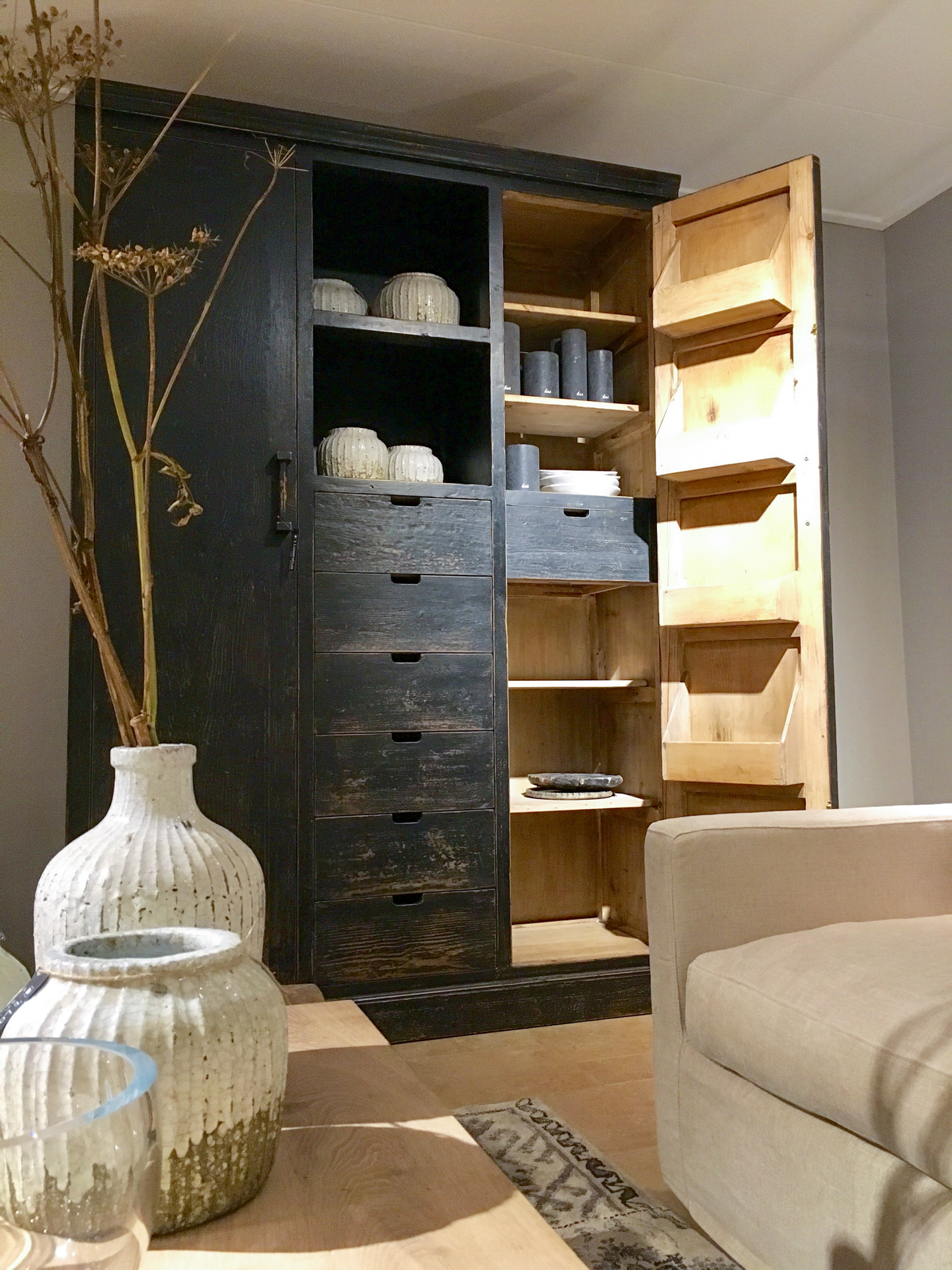 Stoere grote zwarte opbergkast met enorm veel opbergruimte, gemaakt van oud hout. Gemaakt van mooi authentiek hout met karakteristieke details, elk meubel is uniek en heeft zijn eigen karakter. Dit model is doorgaans direct uit voorraad leverbaar.