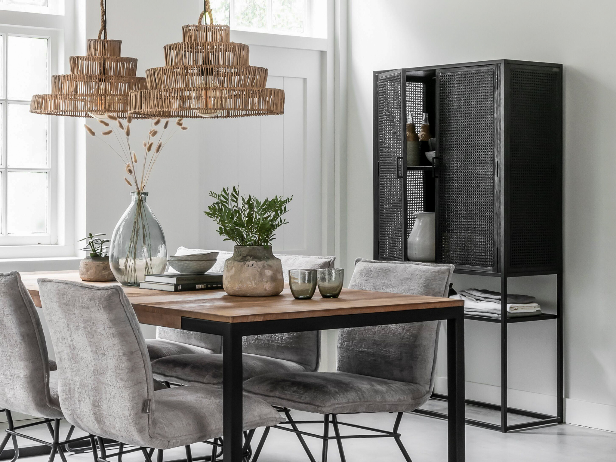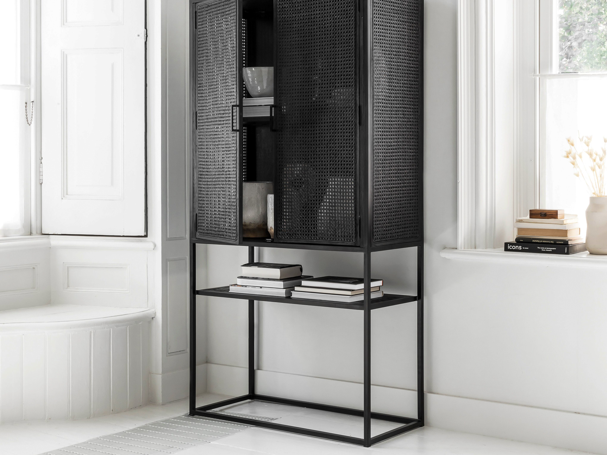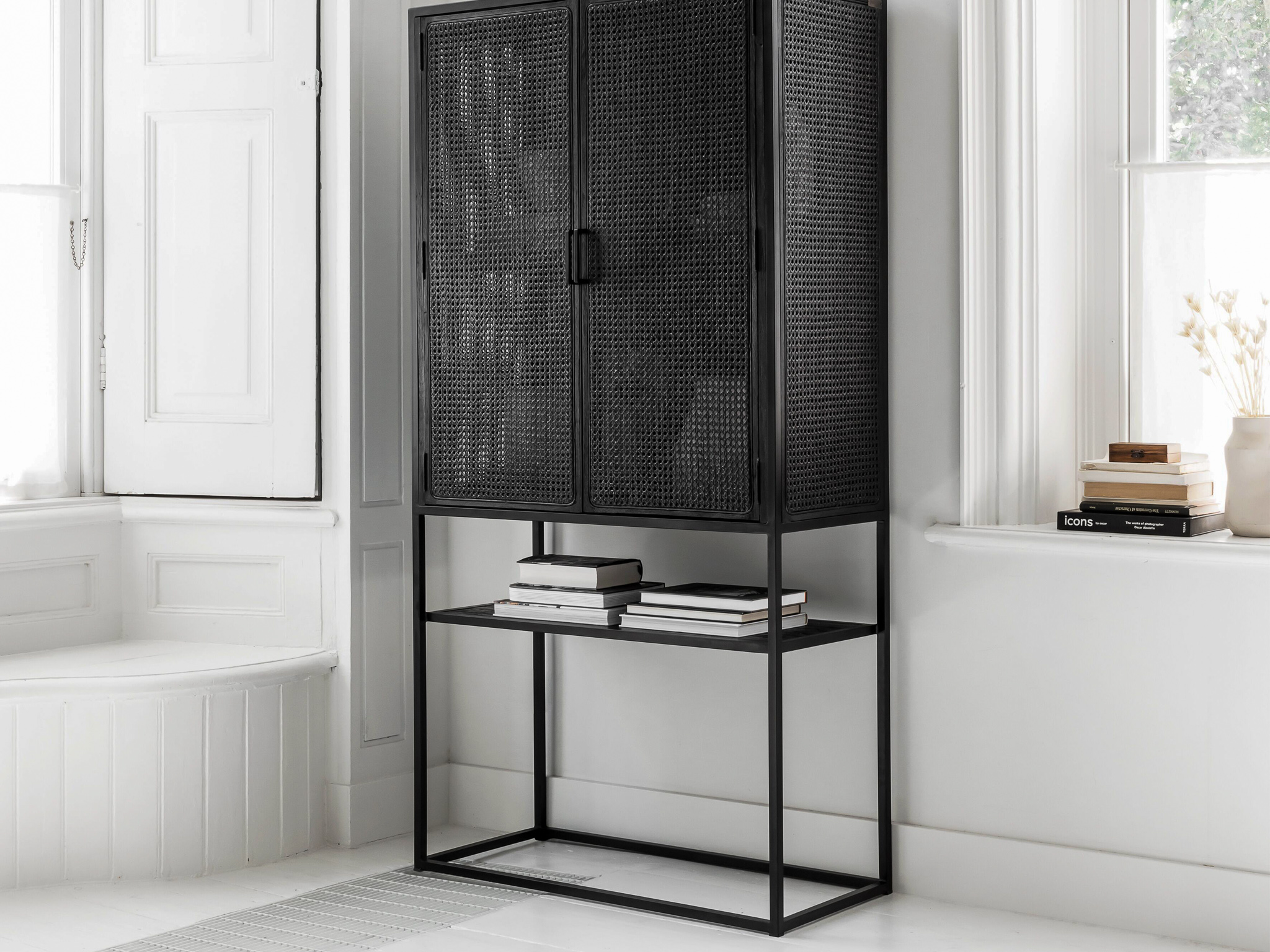 Unieke, karakteristieke, kast Veyron van oude rotanstengels met 2 deuren en zwart stalen onderstel. De Veyron serie is doorgaans direct uit voorraad leverbaar. Deze kast is uitsluitend leverbaar in de maat 88x40x175cm. De Veyron serie is kenmerkend door de zwart gemaakte rotangstengels, ook wel ´webbing´ genoemd. De overige panelen van deze kast zijn gemaakt van oud zwartgebeitst hout. Het meubel is tevens voorzien van een stalen onderstel met een handige legplank wat weer bijdraagt aan de industriële uitstraling.