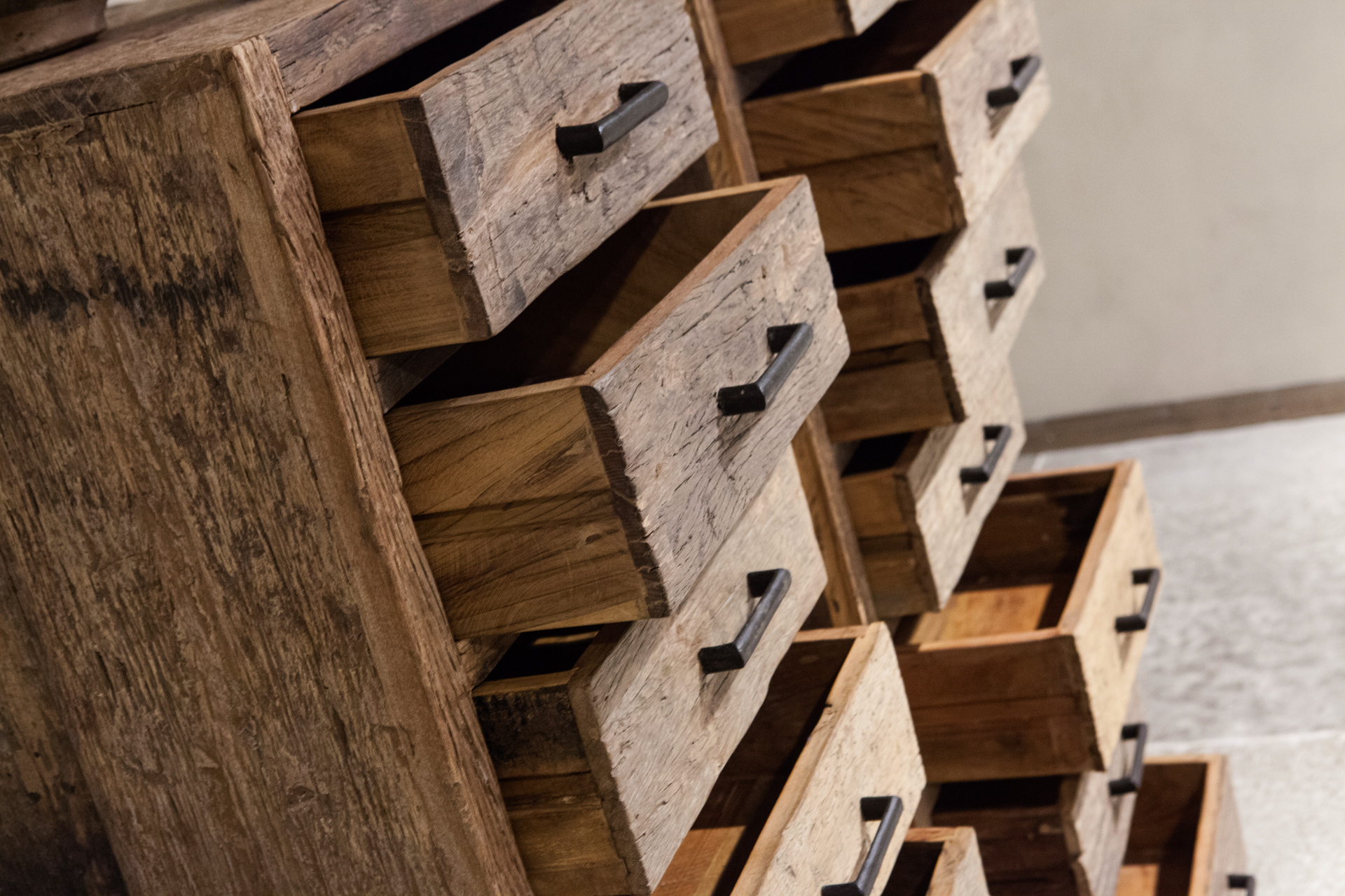 De hand gesmede handgrepen van deze meubels maken een mooi contrast en geeft het geheel net dat industriële tintje. Houd rekening met de grofheid van het hout, hoewel de planken netjes schoongeborsteld worden en ontdaan van schroeven en spijkers zal het hout nooit geheel splinter vrij zijn, iets wat natuurlijk ook het hout zijn eigen charme geeft.