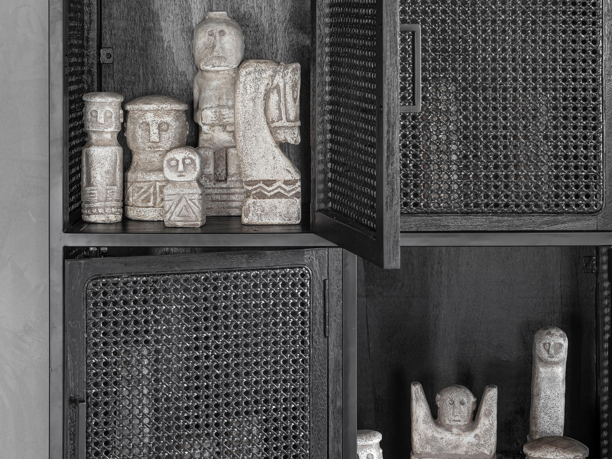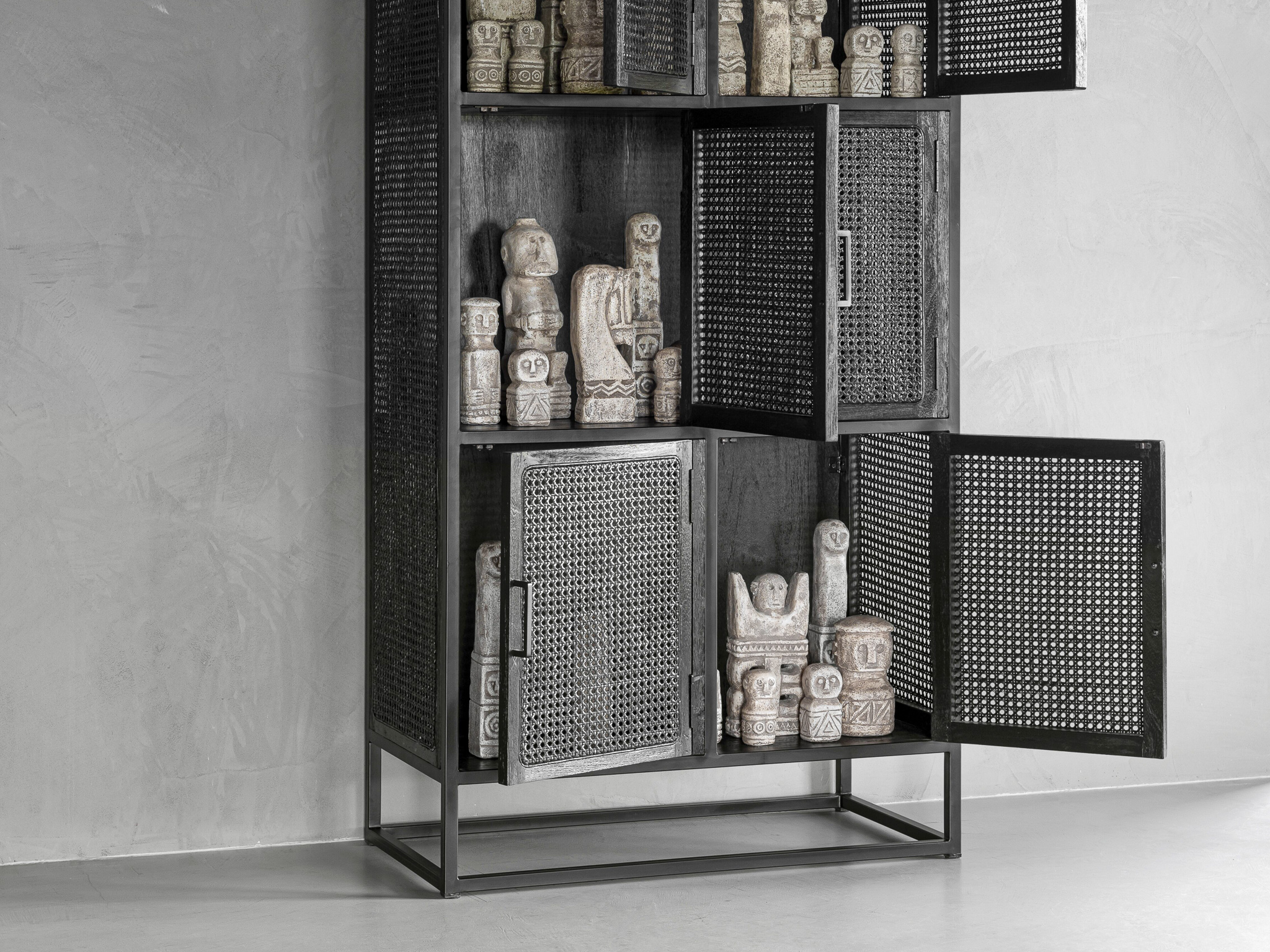 Unieke, karakteristieke, lockerkast Veyron van oude rotanstengels met 6 deuren en zwart stalen onderstel. De Veyron serie is doorgaans direct uit voorraad leverbaar. Deze kast is uitsluitend leverbaar in de maat 80x40x160cm. De Veyron serie is kenmerkend door de zwart gemaakte rotangstengels, ook wel ´webbing´ genoemd. De overige panelen van deze kast zijn gemaakt van oud zwartgebeitst hout. Het meubel is tevens voorzien van een stalen onderstel wat weer bijdraagt aan de industriële uitstraling.