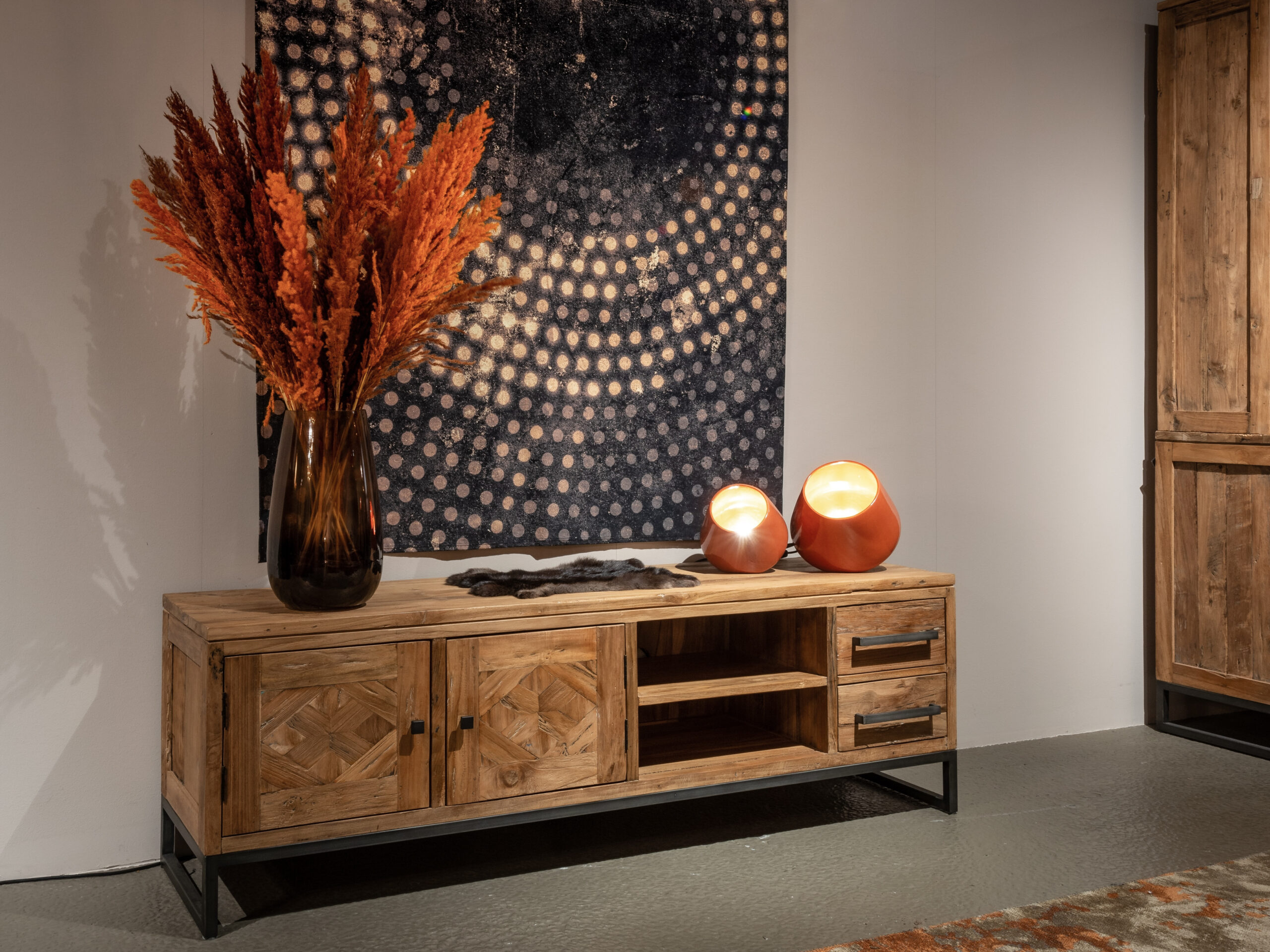 Stoer tv-meubel Cabimas van oud recycled teak, ook wel driftwood genoemd. Dit tv-meubel is afgewerkt met een lichte white wash en black wash. De houten bladen en fronden zijn met de hand in een prachtige design vorm ingelegd. Door de combinatie hout met staal krijgt dit meubel een industriële uitstraling. Het tv-meubel beschikt over 2 gesloten deuren, 2 laden en 2 open vakken. Dit model combineert mooi met onze andere producten van deze serie of andere series in oud teak hout, zoals bijvoorbeeld Perdano, Corrado, Parrano of Toulon.