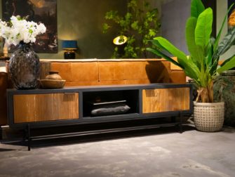 Om tot die kenmerkende robuuste look te komen, vervaardigen wij onze tv-kasten uit hout met metaal. De houtsoorten die wij gebruiken voor onze tv-dressoirs zijn Europees eiken en gerecycled teak. De massief eiken tv-meubels zijn van de hoogste kwaliteit en hebben een mooie, warme uitstraling die goed past in verschillende interieurs. De tv-meubels van oud teak zijn een duurzame keuze en hebben een ingeleefd uiterlijk. Elke plank is uniek. Het sfeervolle eikenhout en teakhout gecombineerd met de zwarte stalen details en poten geeft de lowboards een ruig randje dat uitstekend past in een industriële woonkamer.