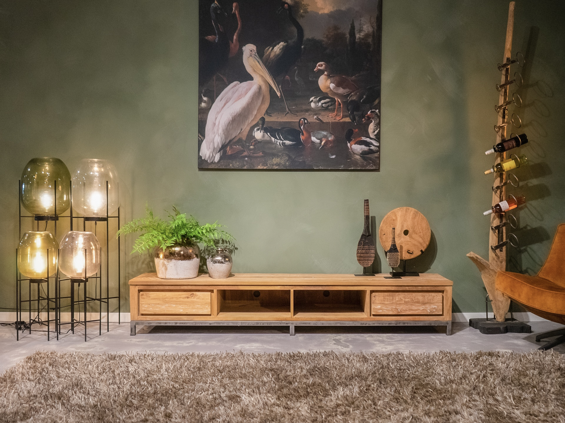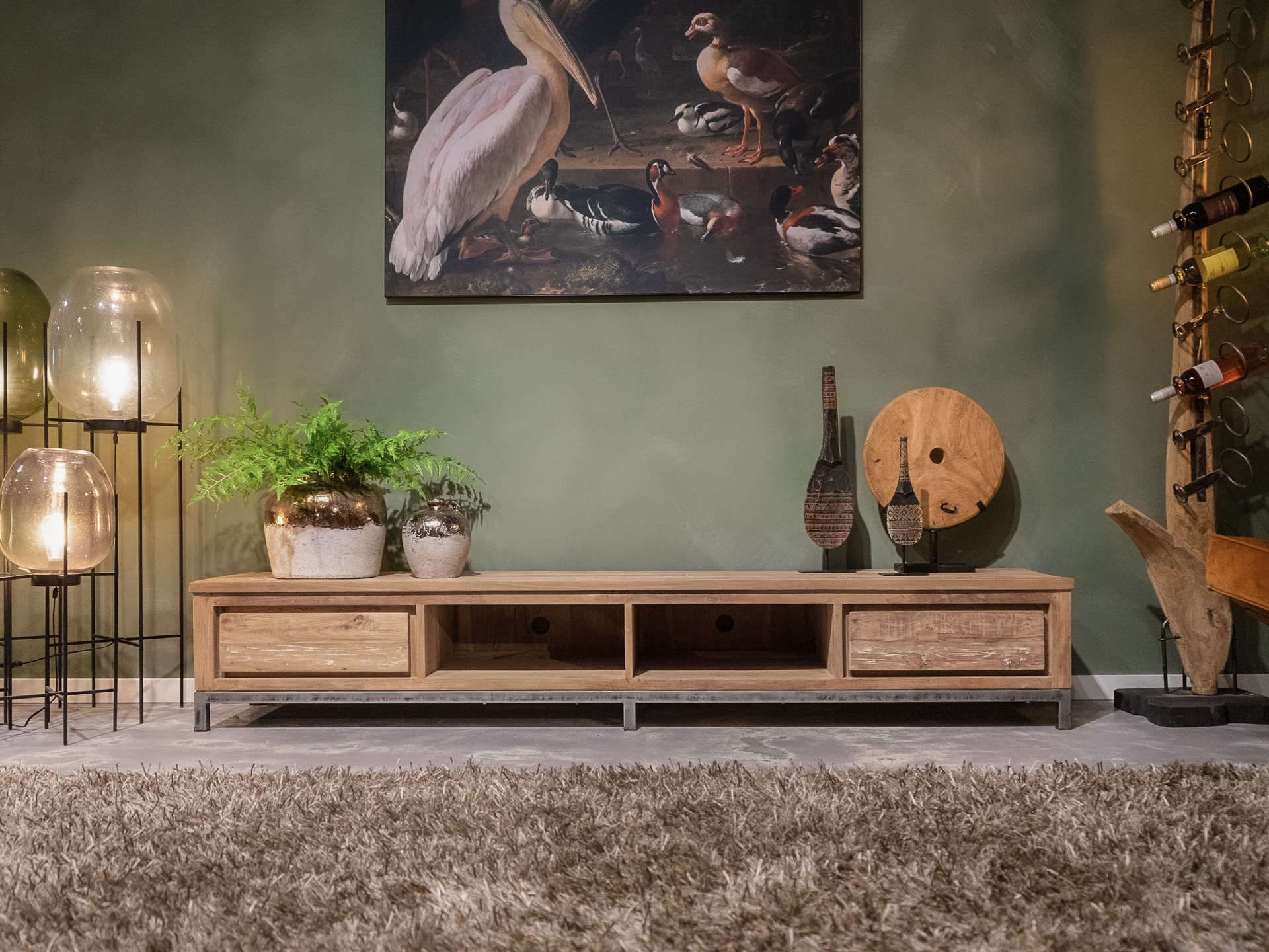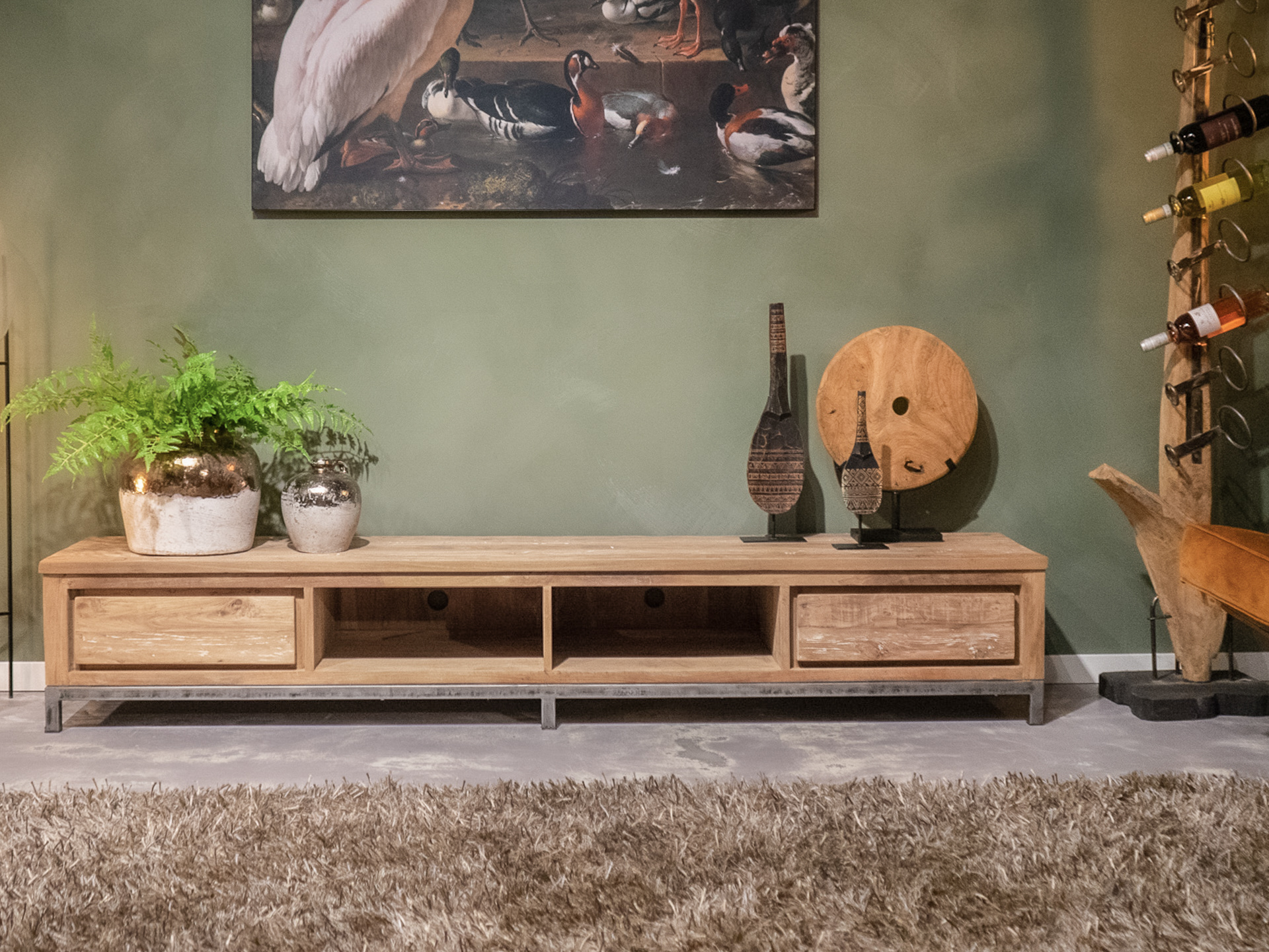 Stoer industrieel tv-meubel van oud recycled teak en stalen poten. Dit model is leverbaar in 3 verschillende maten. Dit model combineert mooi met onze salontafel Avezzano of een maatwerk model van oud eiken. De open vakken zijn circa 48cm breed, 40cm diep en 18cm hoog.