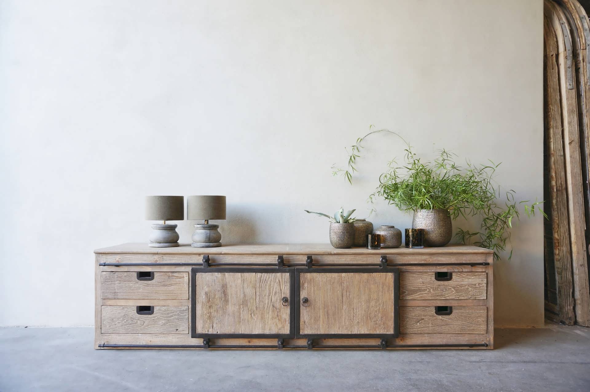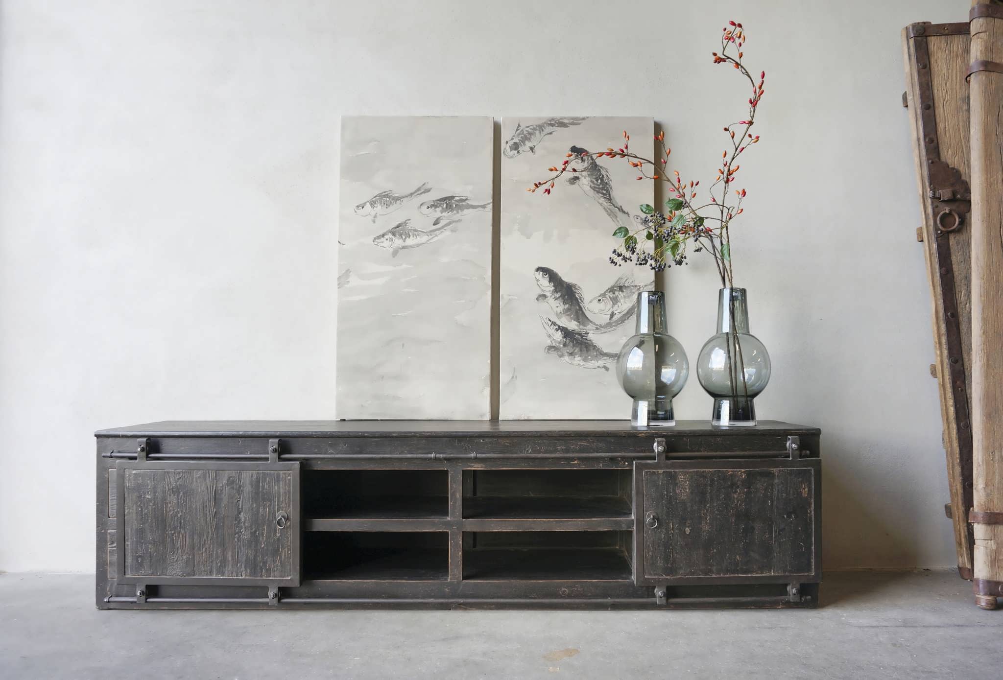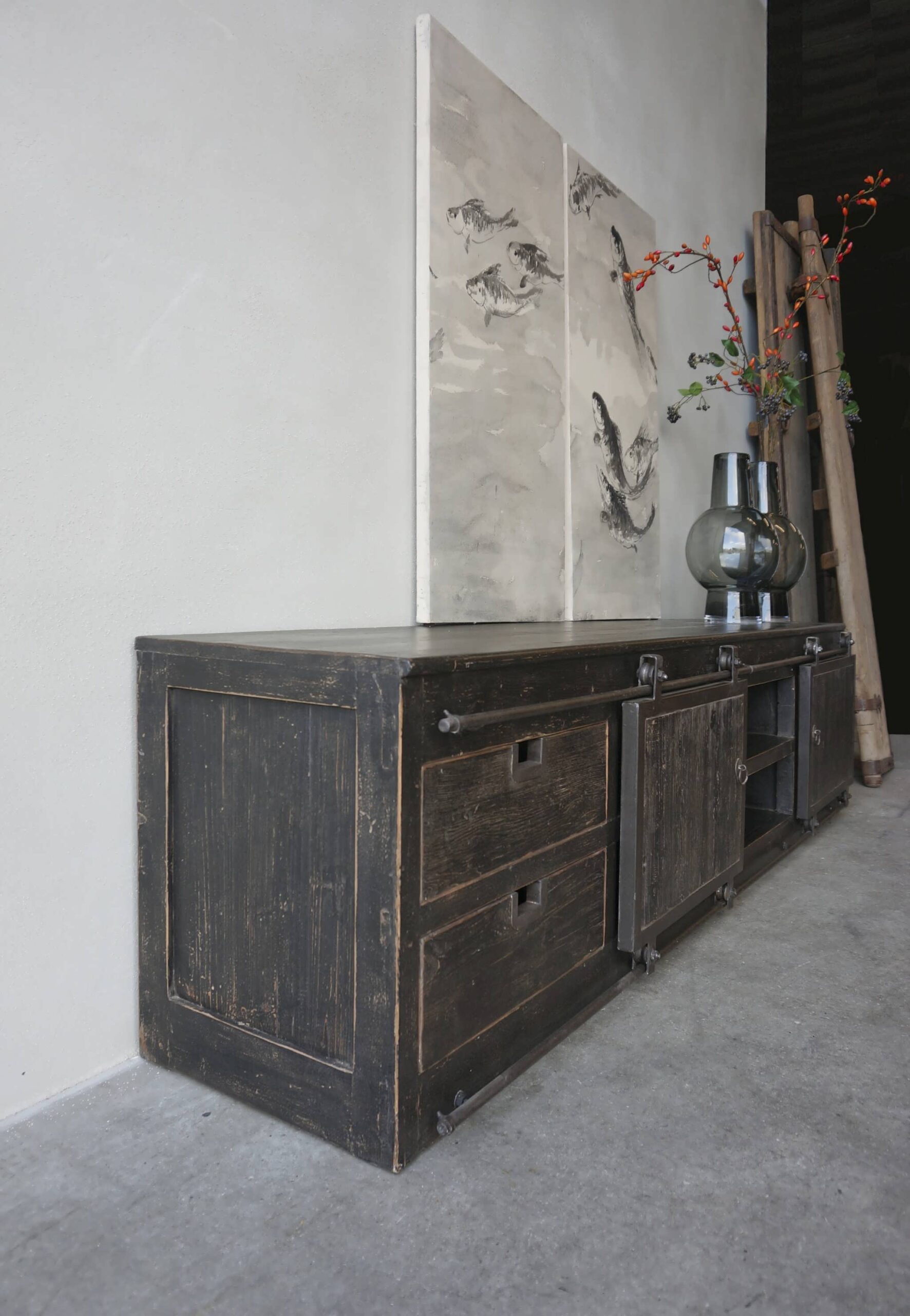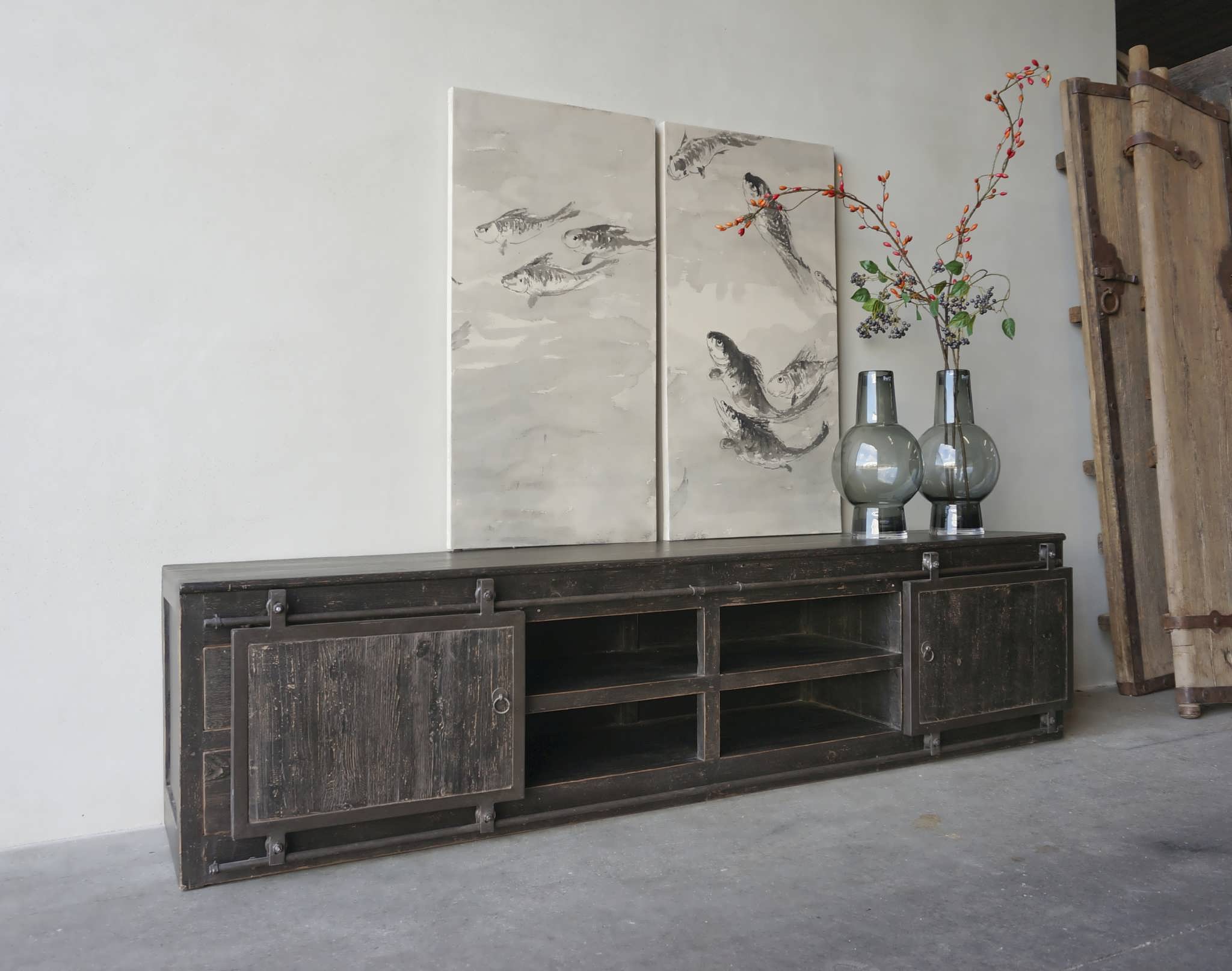 Stoer tv-meubel gemaakt van oud chinees elmhout, met schuifdeuren en laden. Gemaakt van mooi authentiek hout met karakteristieke details, elk meubel is uniek en heeft zijn eigen karakter. Dit model is doorgaans direct uit voorraad leverbaar, zowel in naturel als in old black.