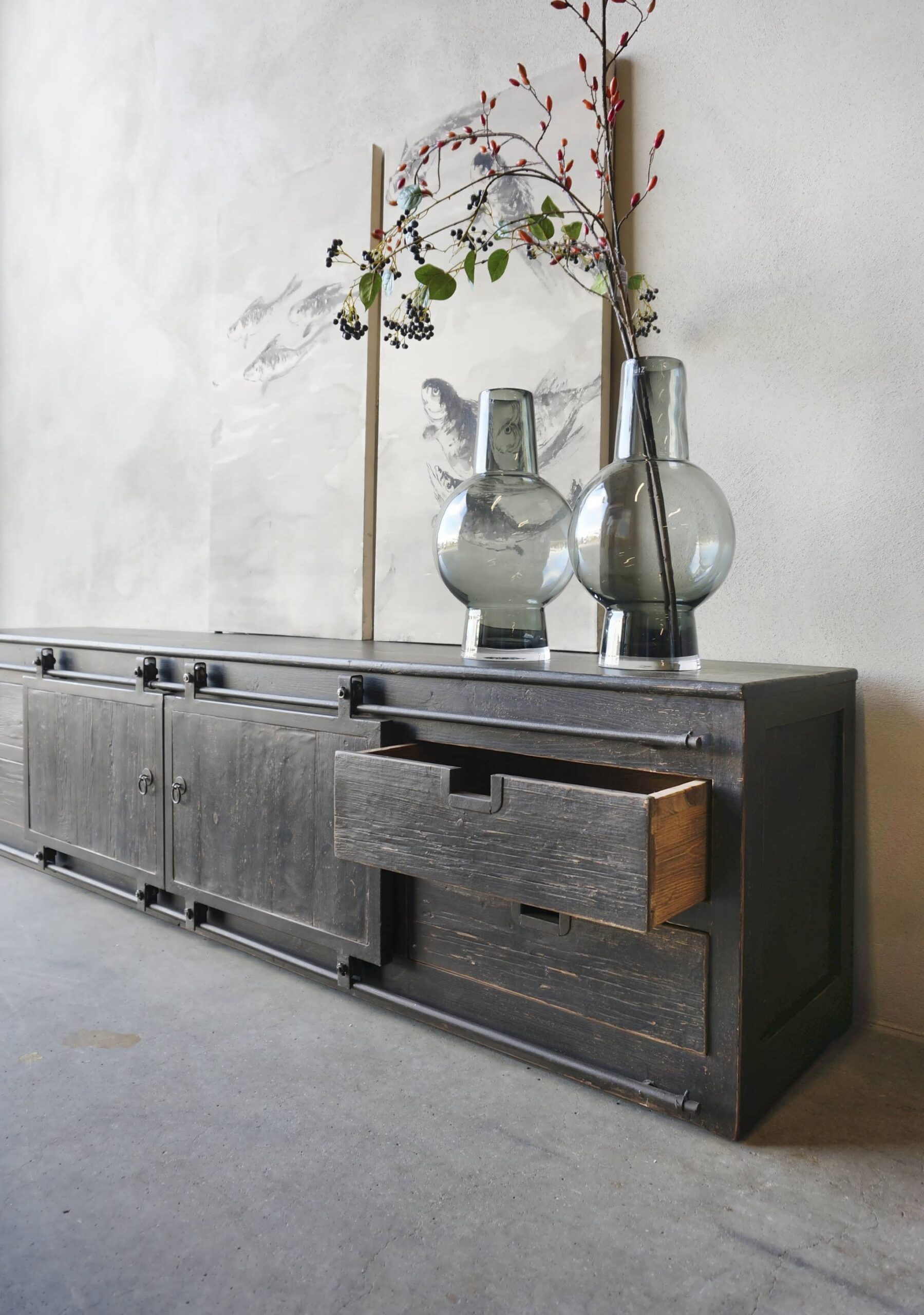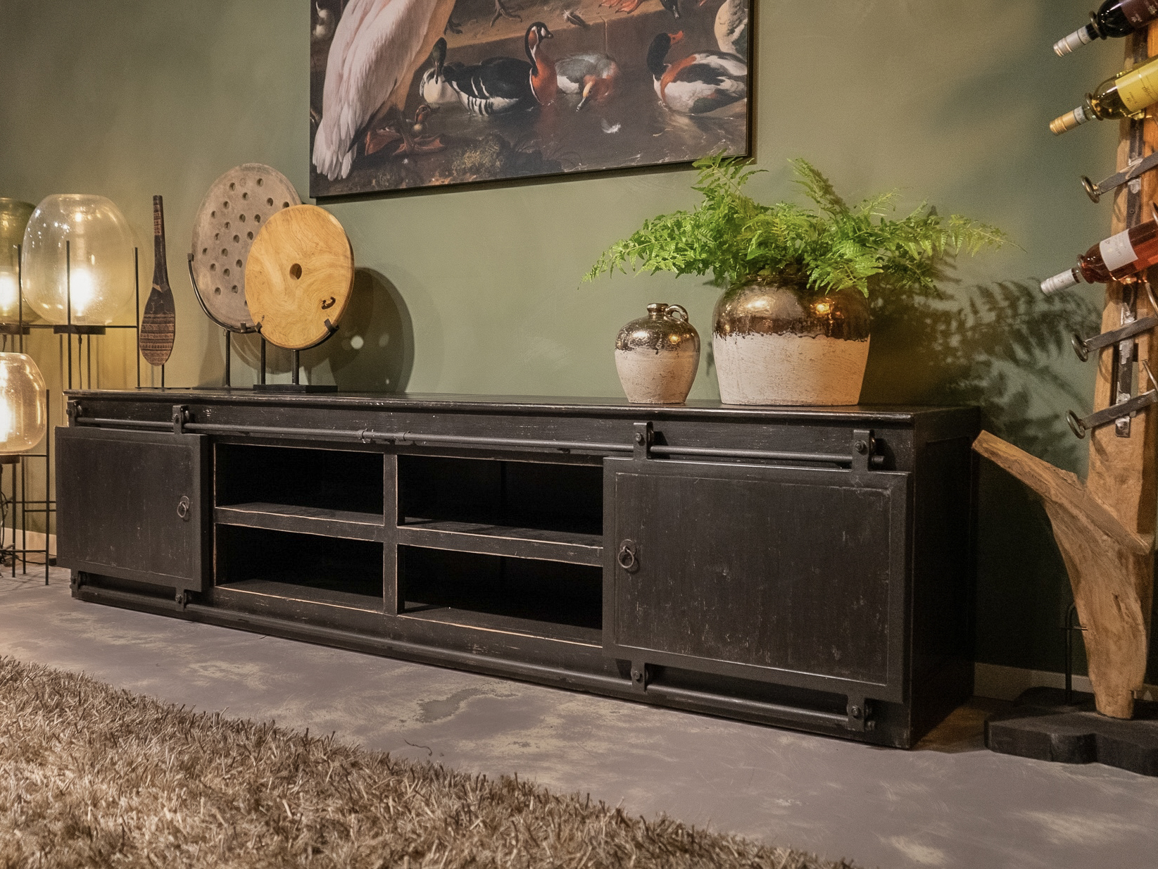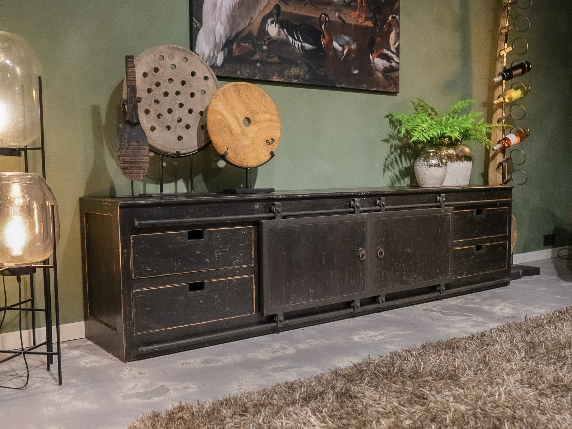 Stoer tv-meubel gemaakt van oud chinees elmhout, met schuifdeuren en laden. Gemaakt van mooi authentiek hout met karakteristieke details, elk meubel is uniek en heeft zijn eigen karakter. Dit model is doorgaans direct uit voorraad leverbaar, zowel in naturel als in old black.