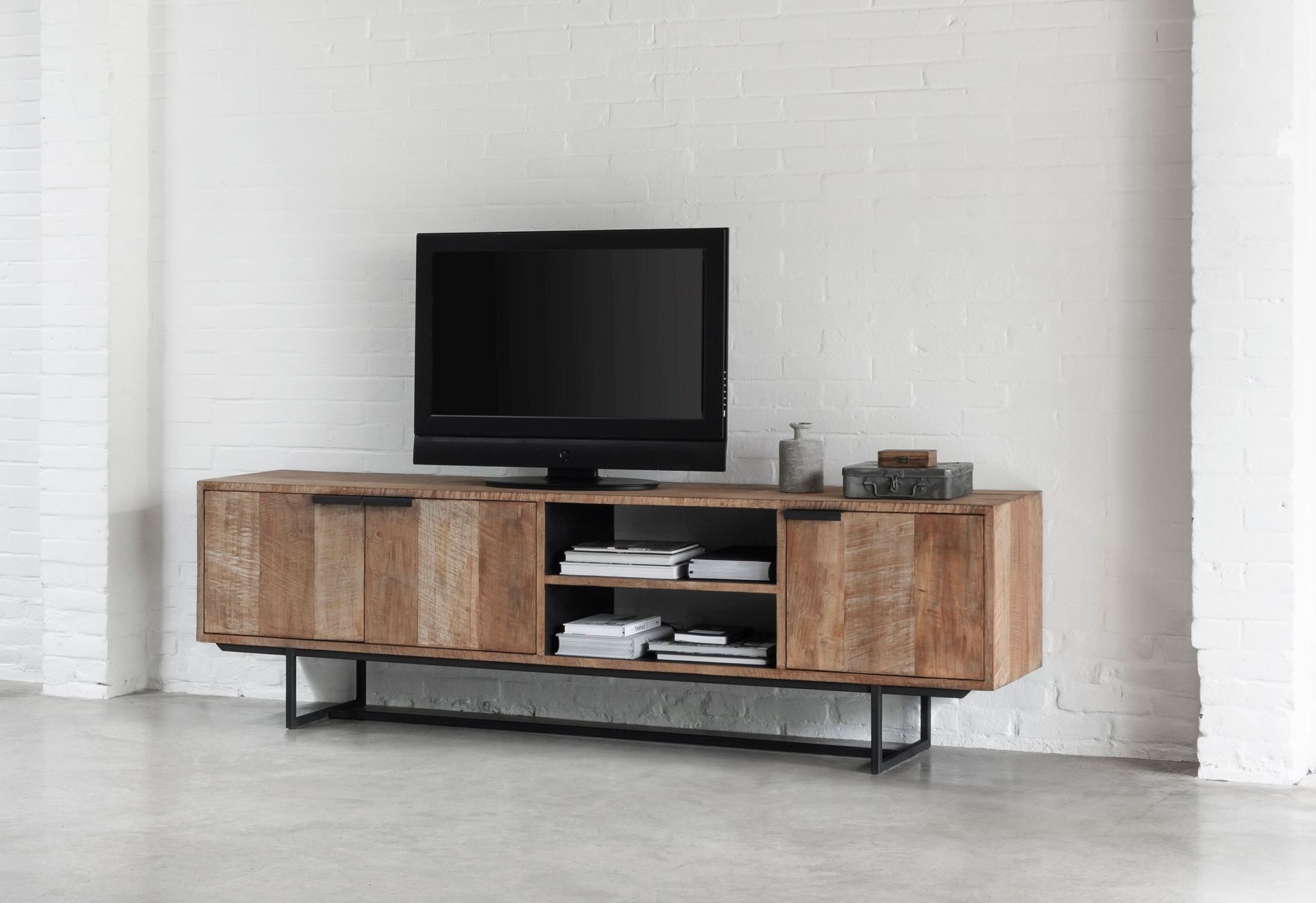 Stoer industrieel tv-meubel met laden gemaakt van oud recycled teak en stalen frame. Dit model combineert mooi met onze andere meubels van reclaimed teak of andere zwarte meubels, leverbaar doorgaans direct uit voorraad in diverse maten. Het 200cm exemplaar heeft van links naar rechts 2 deurtjes, een open vak en dan weer een deurtje, het 150cm exemplaar is deurtje, open vak, deurtje.