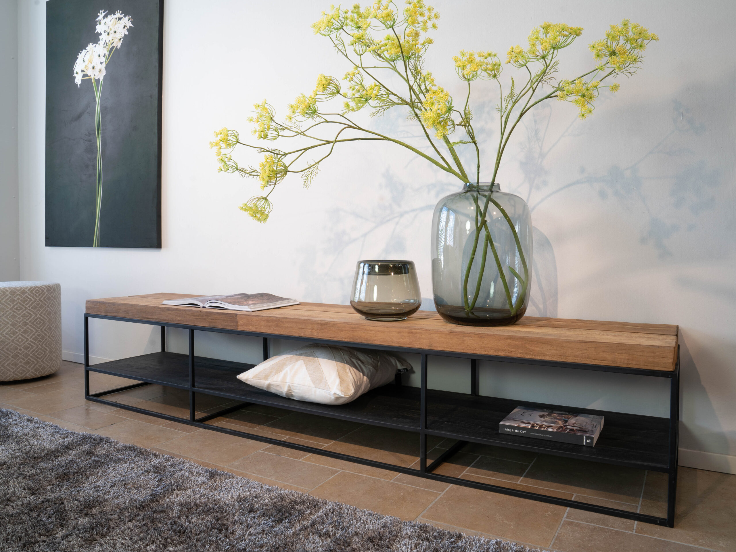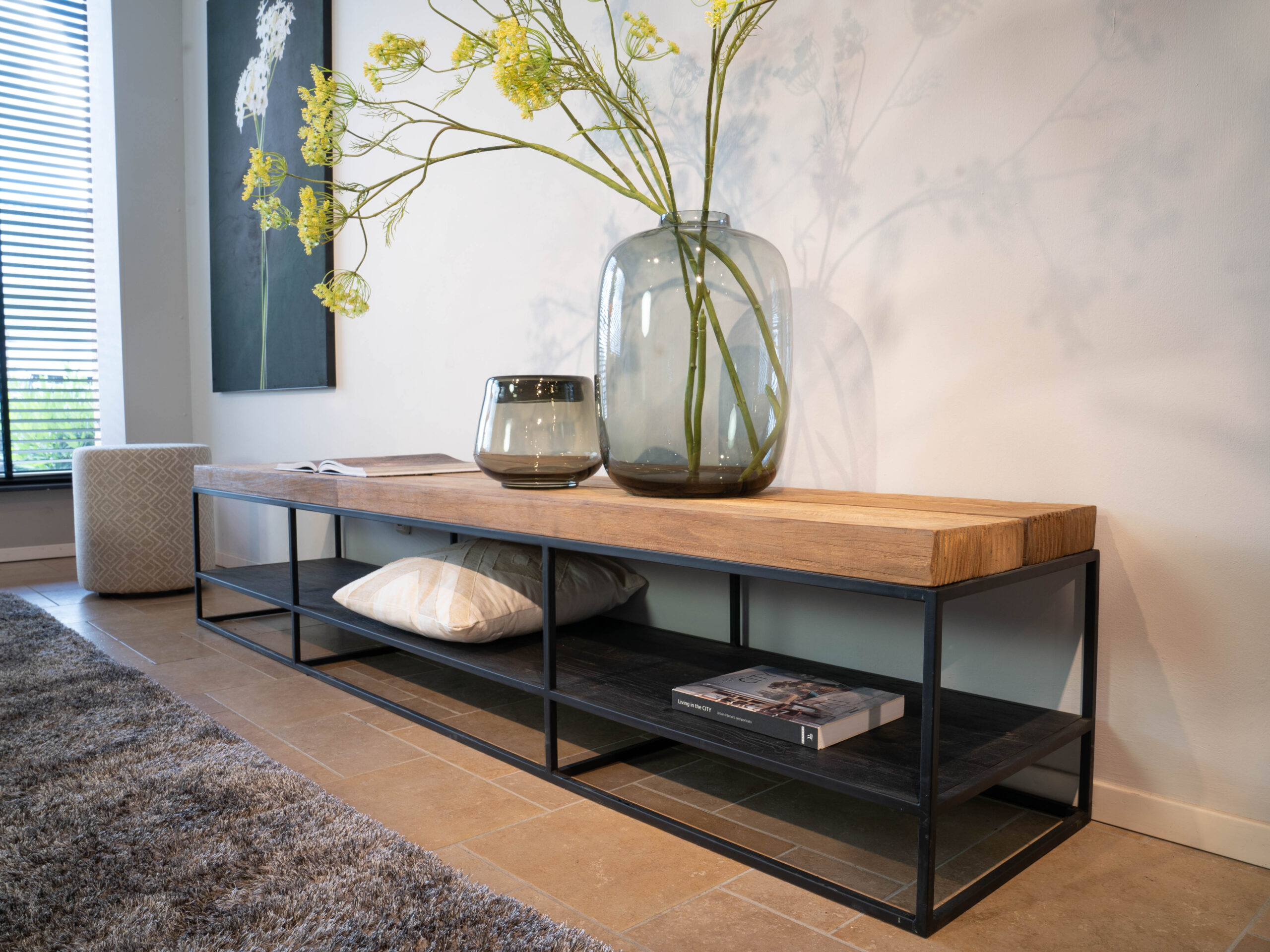 Robuust TV-meubel Anzio gemaakt van oud reclaimed teak. Dit meubel bevat mooi tropisch teakhout met authentieke details, elk meubel is uniek en heeft zijn eigen karakter. Het Anzio TV-meubel is voorzien van een industrieel stalen frame wat mooi doorloopt onder het meubel.