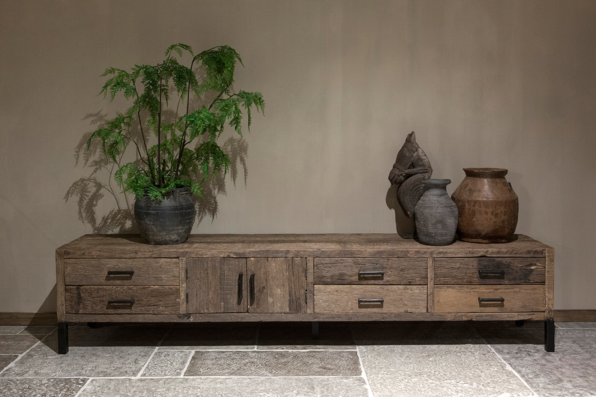 Stoer TV-meubel gemaakt van oud recycled hout en hand gesmede grepen. Dit model is leverbaar in diverse maten doorgaans direct uit voorraad. Dit model combineert mooi met onze andere meubels uit de Bailar lijn zoals een dressoir, kast en side table.