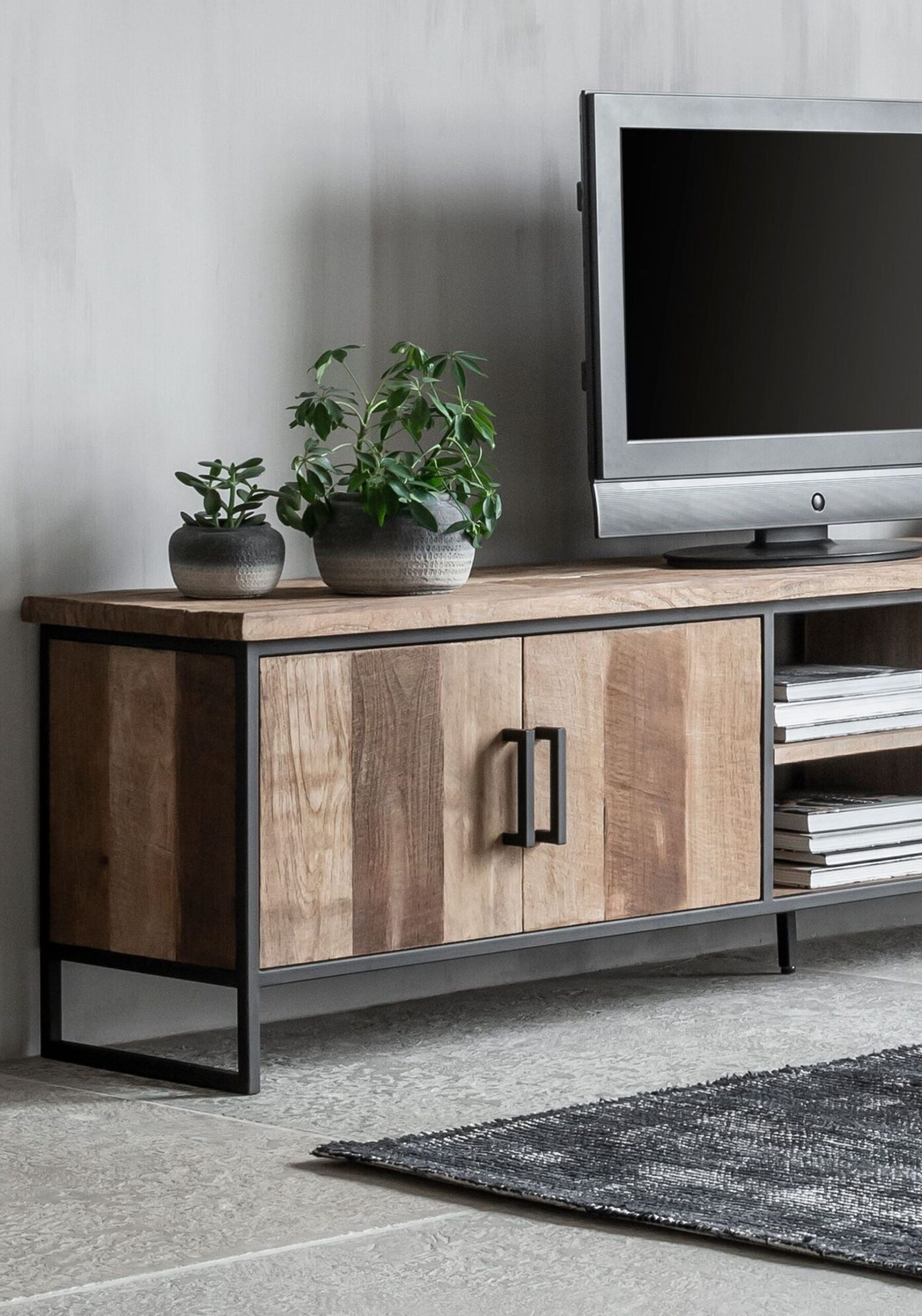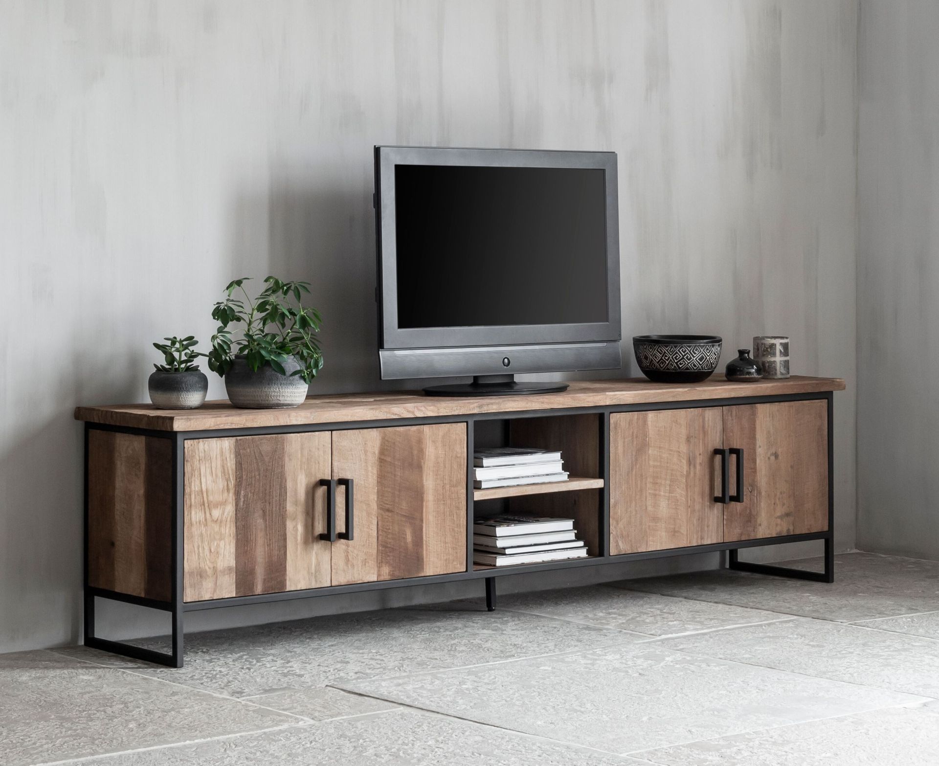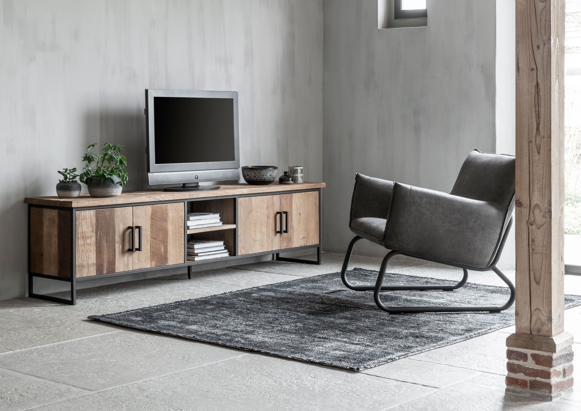 Stoer industrieel tv-meubel van oud recycled teak en stalen frame. Dit model is leverbaar in 3 verschillende maten, 140cm met 2 deurtjes links en rechts een schap, 180cm met 2 deurtjes links, open vakt en 1 deurtje rechts en een 220cm versie met 2 deurtjes links, open vak en 2 deurtjes rechts. Hetzelfde hout wordt gebruikt voor onze Maldini, Noma, Marconi en Cavallo serie. Het oude teak hout krijgt een 2e leven in deze meubels, elk meubel heeft zijn eigen karakteristieke kenmerken wat elk meubel uniek qua uitstraling maakt.
