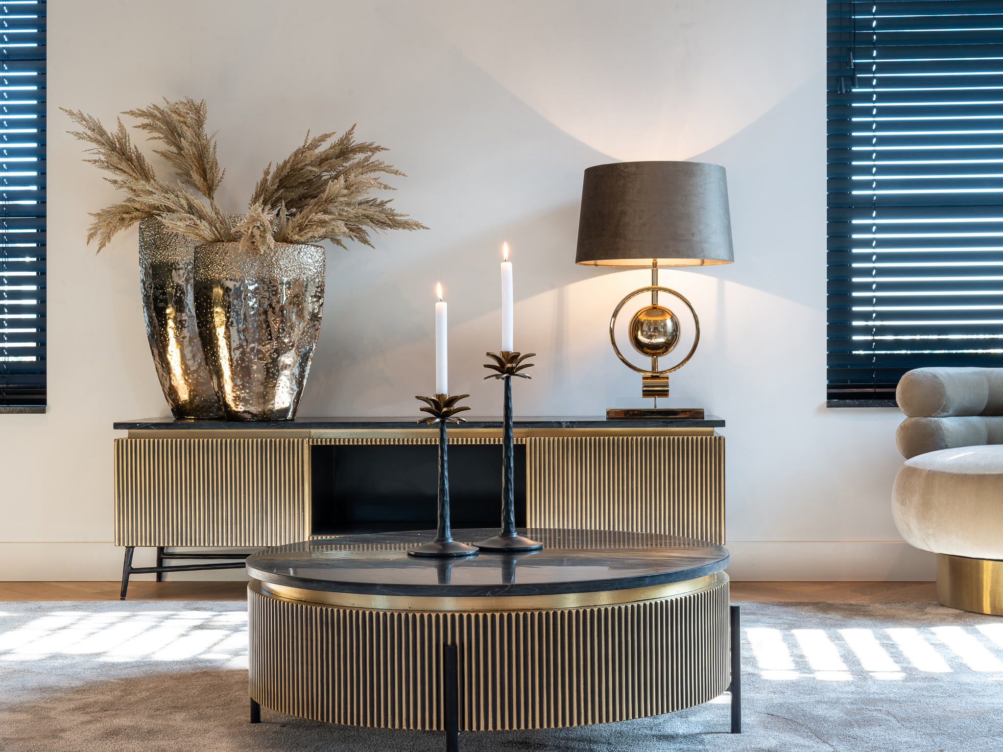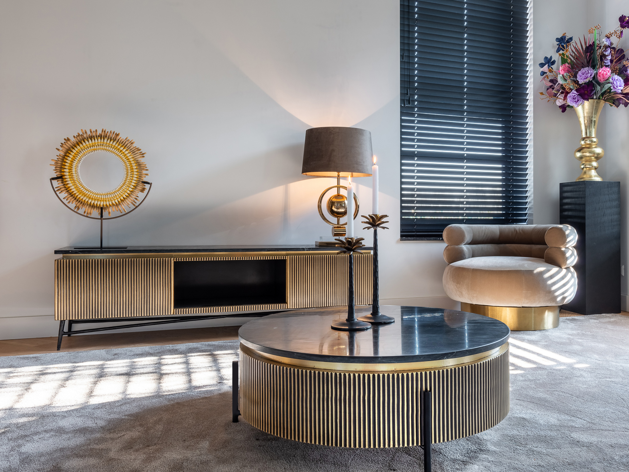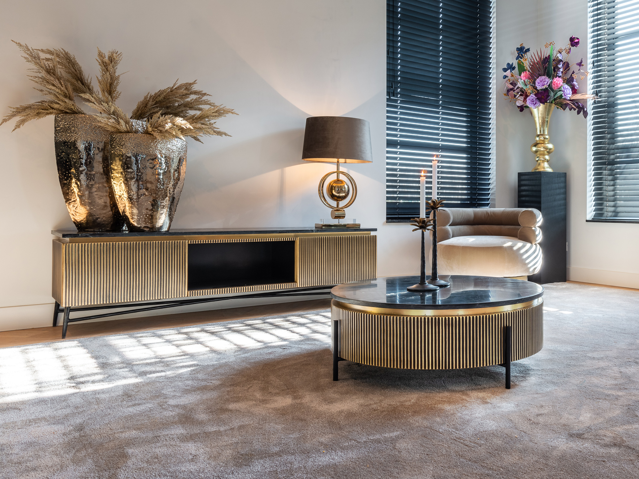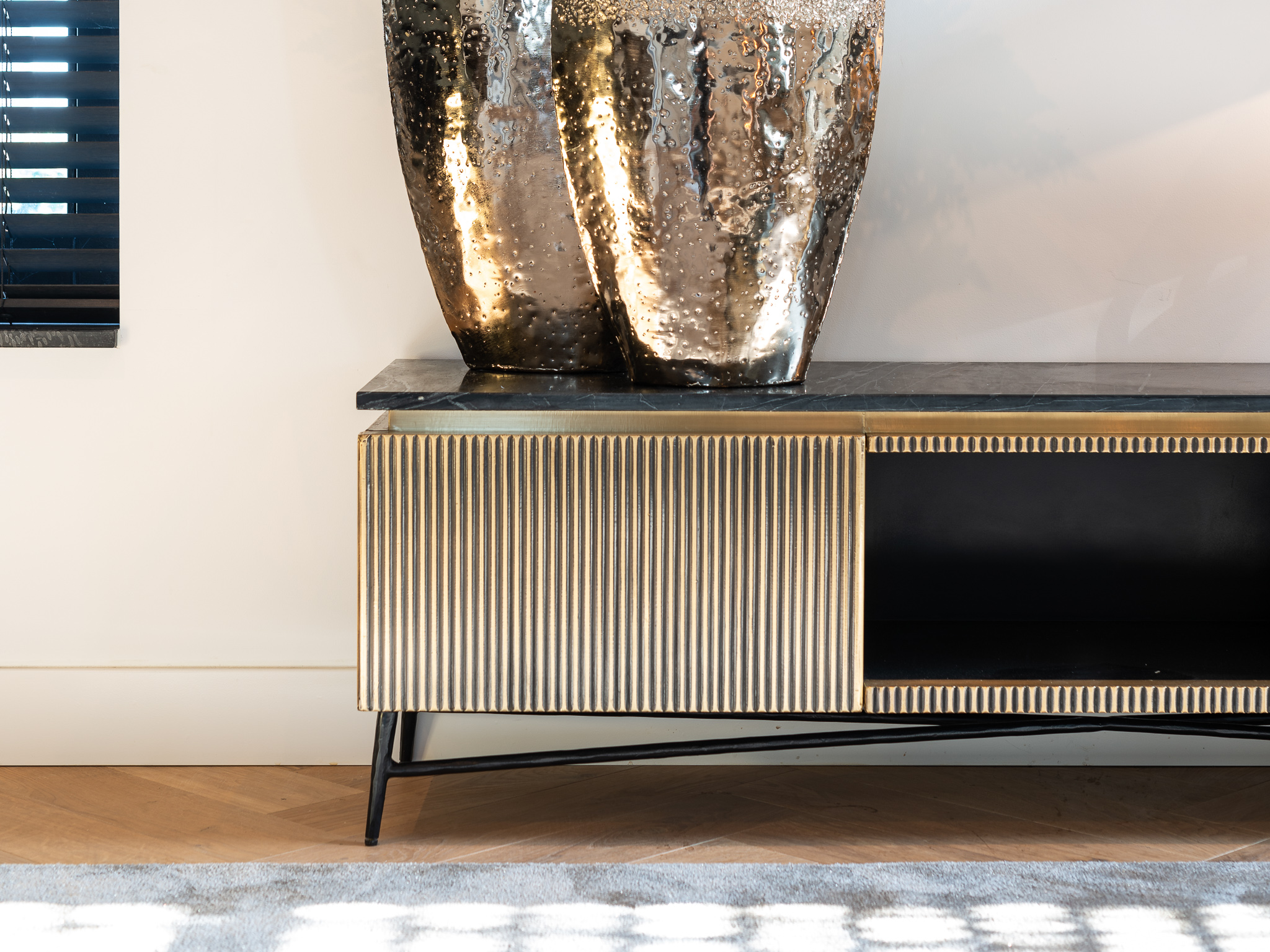 TV-meubel Colmar is een uniek meubel in goud / messing met geribbeld reliëf en zwart marmeren blad. Perfect te combineren met het dressoir, de boekenkast en de salontafel uit dezelfde serie. Mid-Century Modern stijl (jaren zestig) in een nieuw jasje!