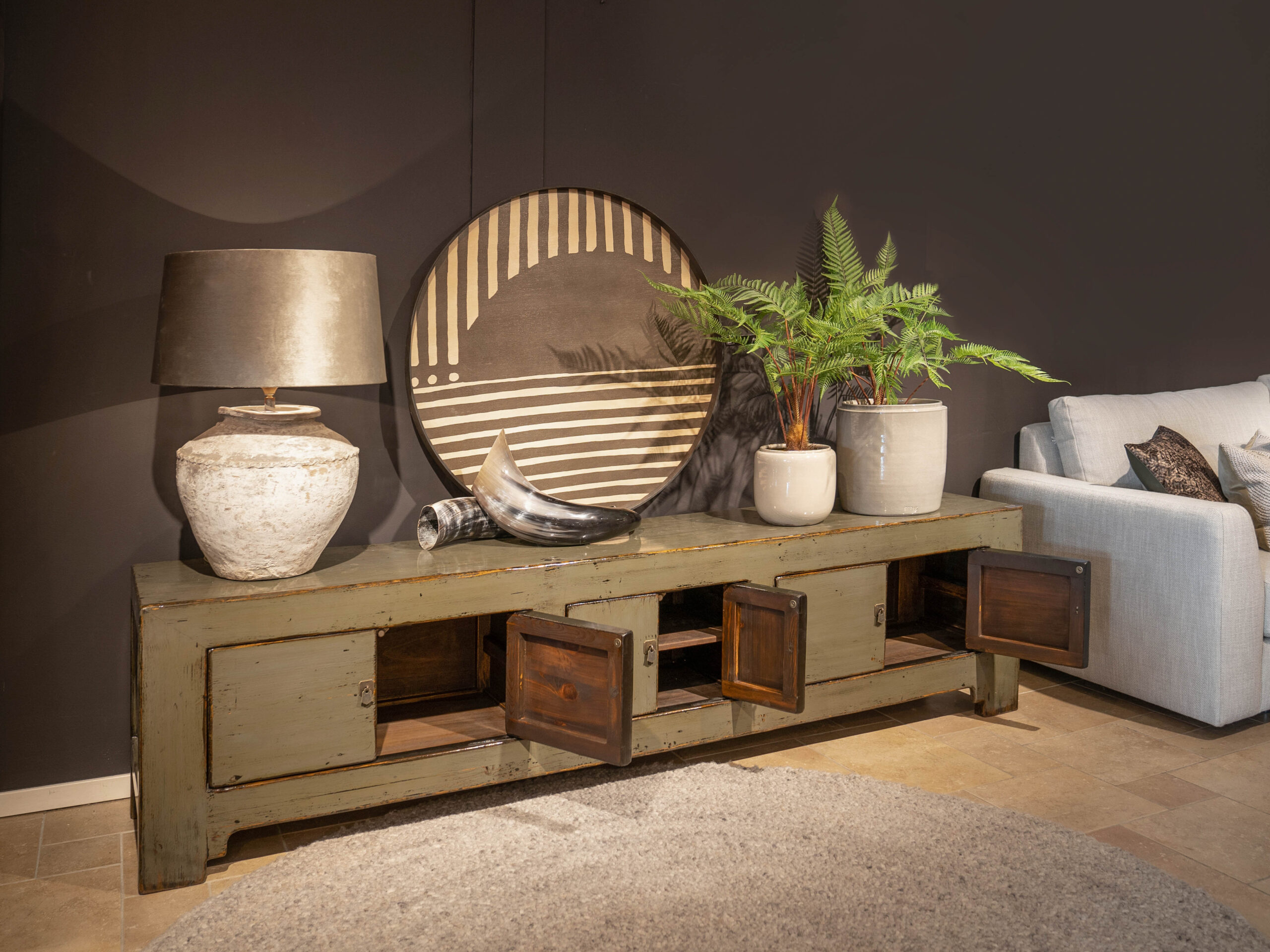 Mooie elegante tv-meubel van oud hout met een groene lak finish. Ontzettend praktisch met 6 deuren biedt deze kast bijzonder veel opbergruimte. Te bewonderen in onze showroom in…