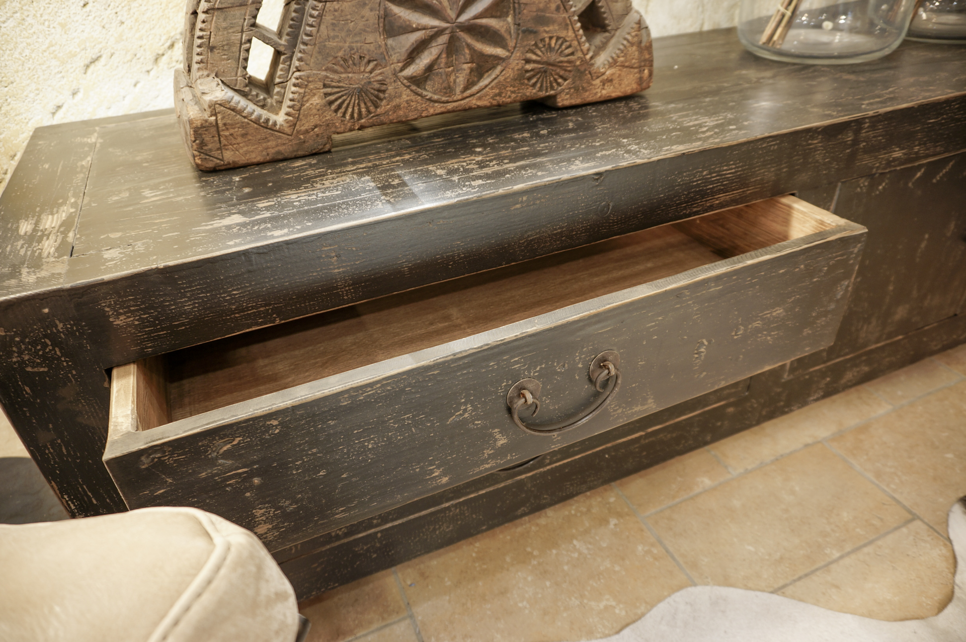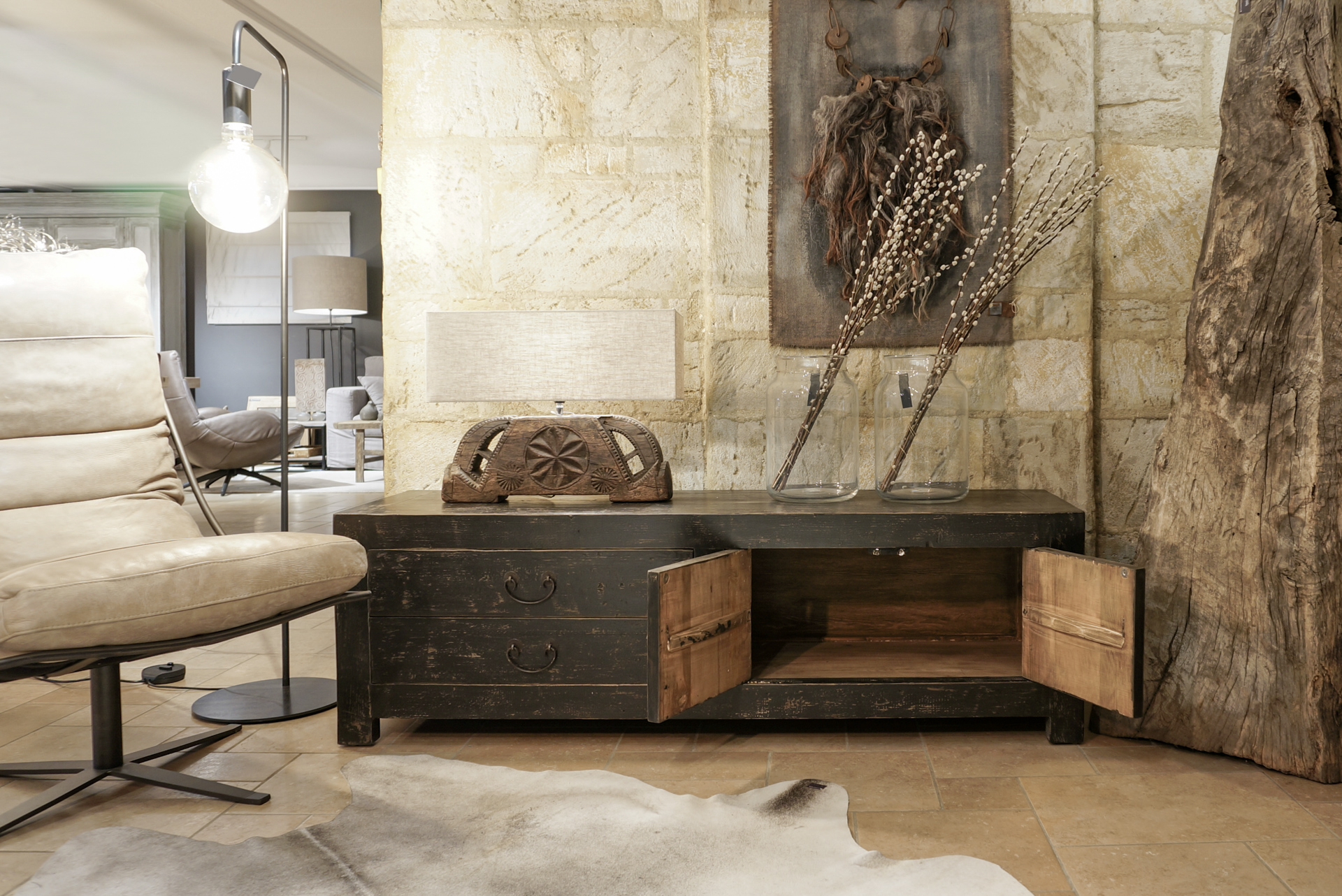 Deze tv-kast is gemaakt van mooi, oud en hergebruikt Elmhout wat onder andere wordt verkregen uit oude Chinese deuren waardoor elk meubel een unieke en eigen uitstraling krijgt. De productie van deze meubels geeft het oude elmhout een 2e leven, wat de meubels een duurzame en ecologisch verantwoorde keuze maakt.