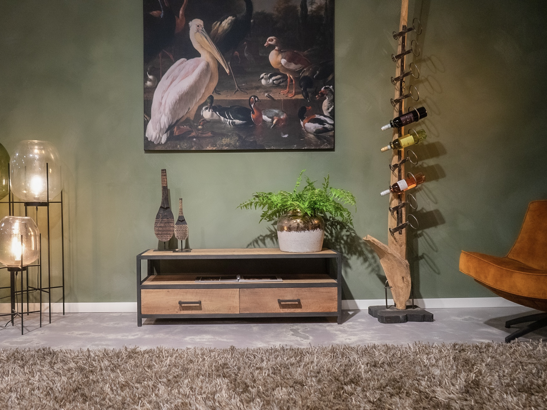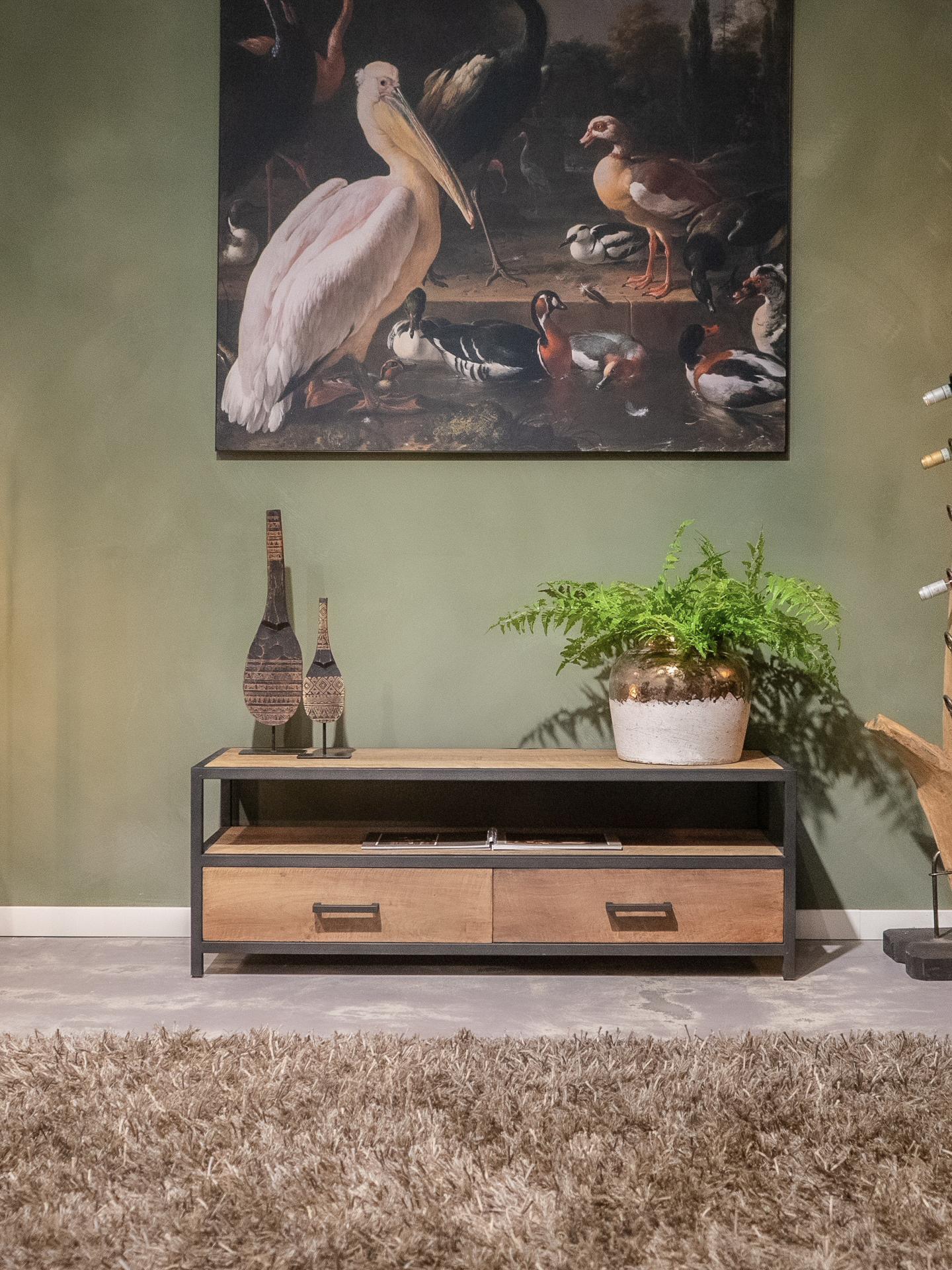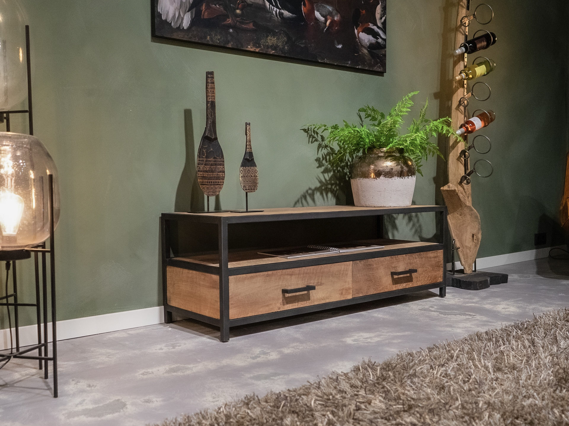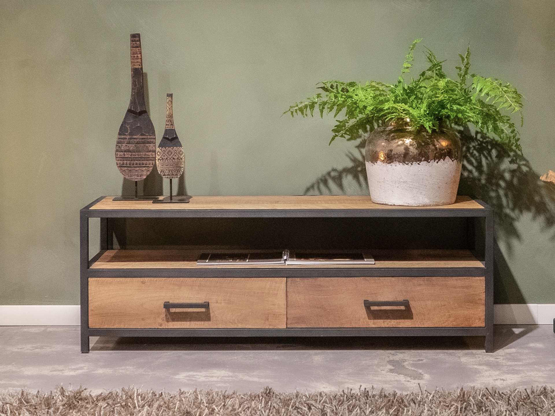 Stoer industrieel tv-meubel van oud recycled teak en stalen frame. Dit model is leverbaar in verschillende maten. Dit model combineert mooi met andere producten uit deze serie, of een maatwerk model van oud eiken. Het oude teak hout krijgt een 2e leven in deze meubels, elk meubel heeft zijn eigen karakteristieke kenmerken wat elk meubel uniek qua uitstraling maakt.