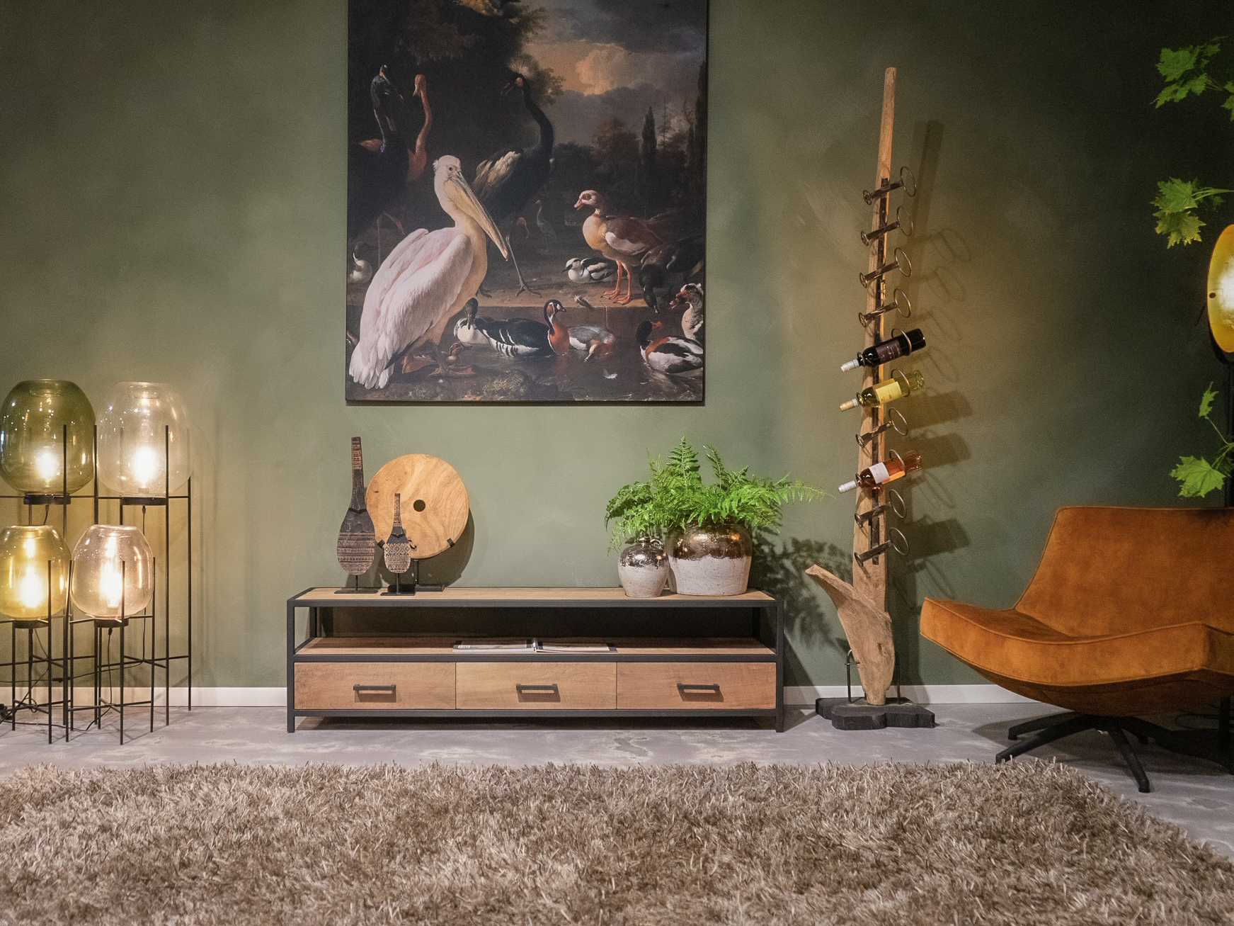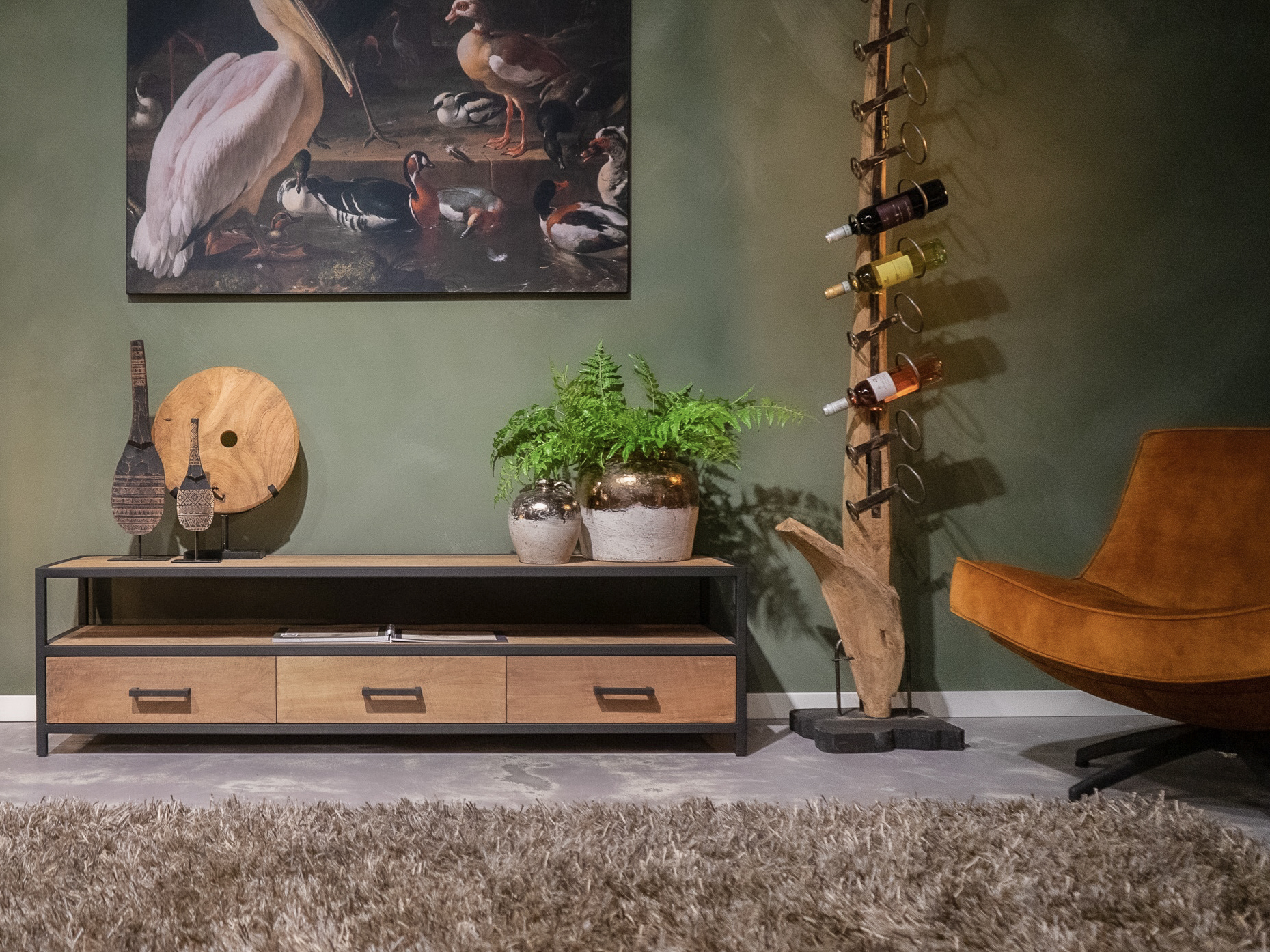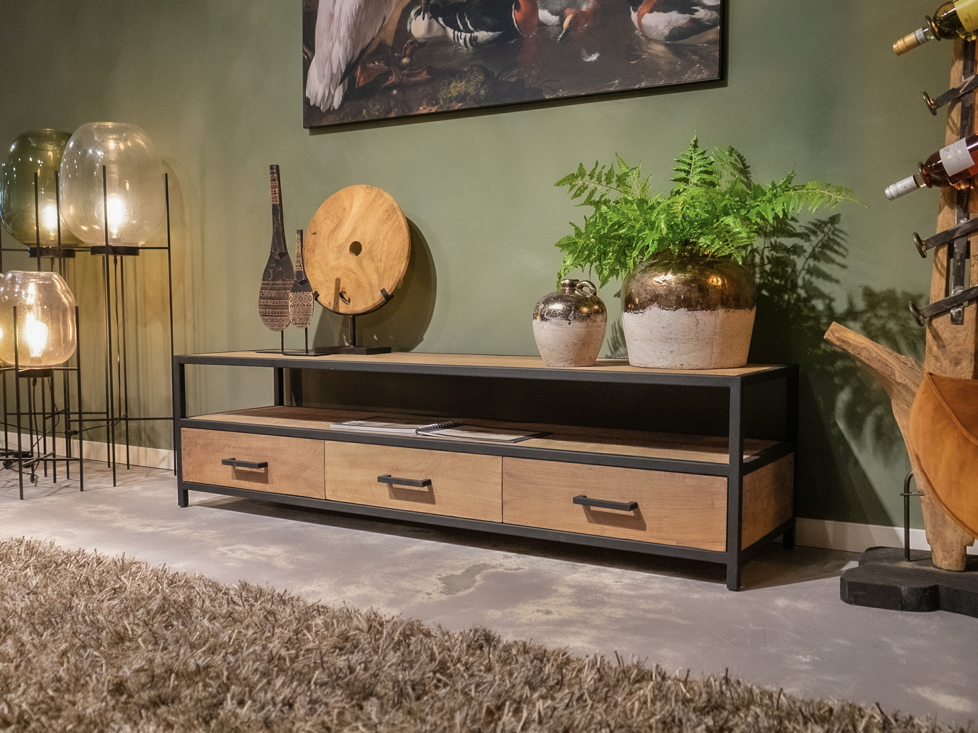 De tv kast Maldini is gemaakt van oud recycled teak gecombineerd met een smal stalen frame. Het teakhout is doorleefd maar heeft een gebruiksvriendelijk, glad oppervlak en een warme uitstraling. De combinatie van het industriële, stalen frame in mat zwart uitgevoerd met de warme kleur van teak zorgt voor een stoer maar toch verfijnd tv-meubel. De lades zorgen voor extra ruimte zodat alle apparatuur gemakkelijk opgeborgen kan worden.