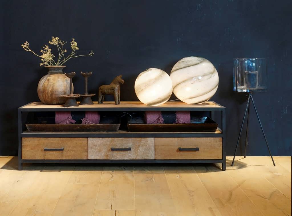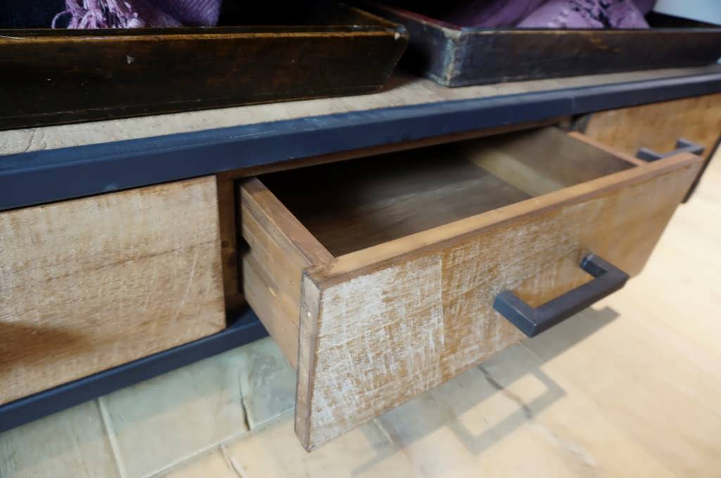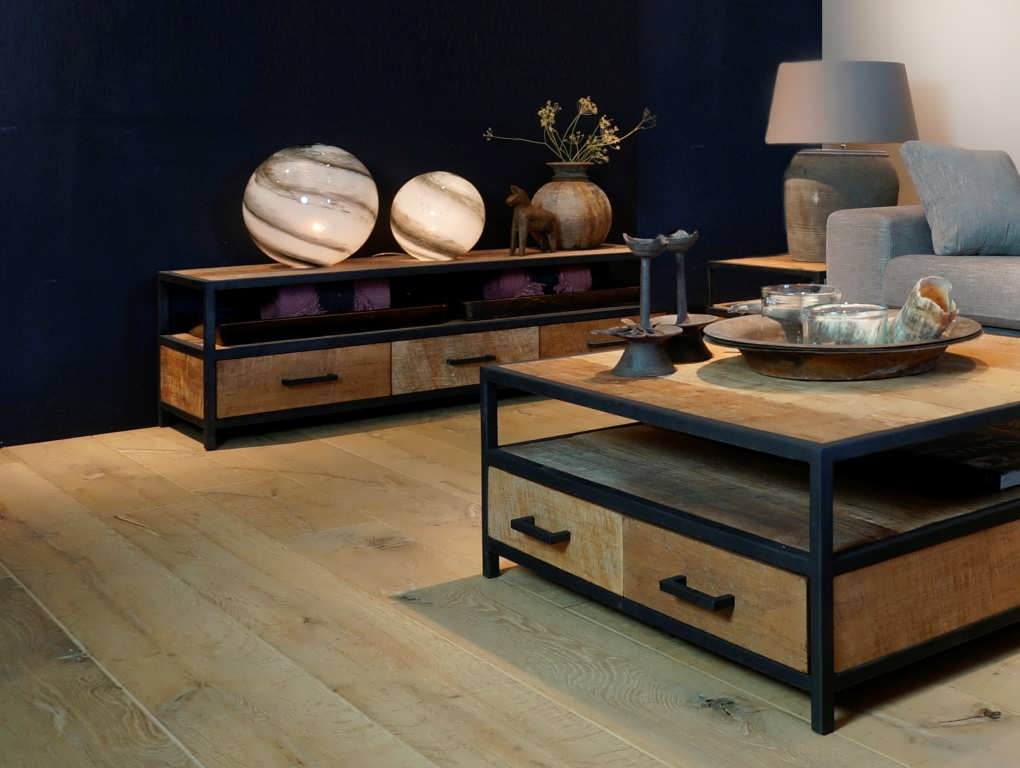 Stoer industrieel tv-meubel van oud recycled teak en stalen frame. Dit model is leverbaar in verschillende maten. Dit model combineert mooi met andere producten uit deze serie, of een maatwerk model van oud eiken. Het oude teak hout krijgt een 2e leven in deze meubels, elk meubel heeft zijn eigen karakteristieke kenmerken wat elk meubel uniek qua uitstraling maakt.