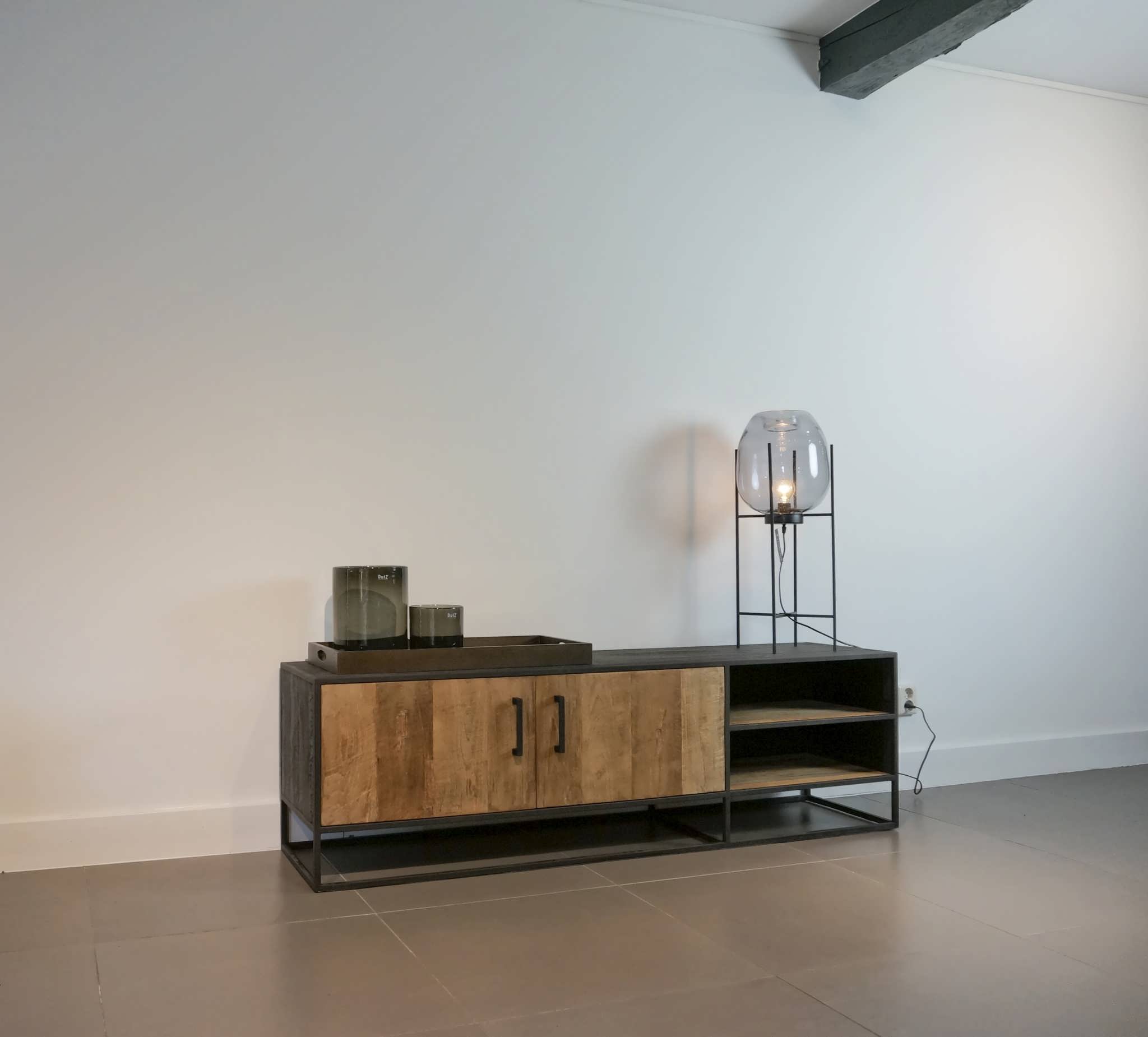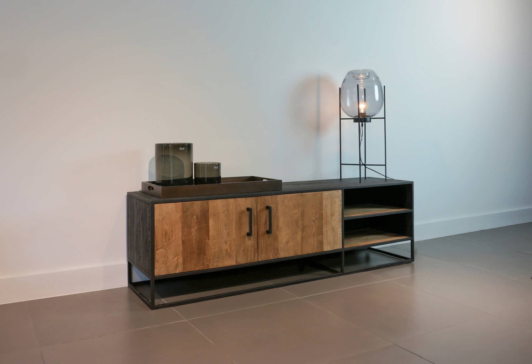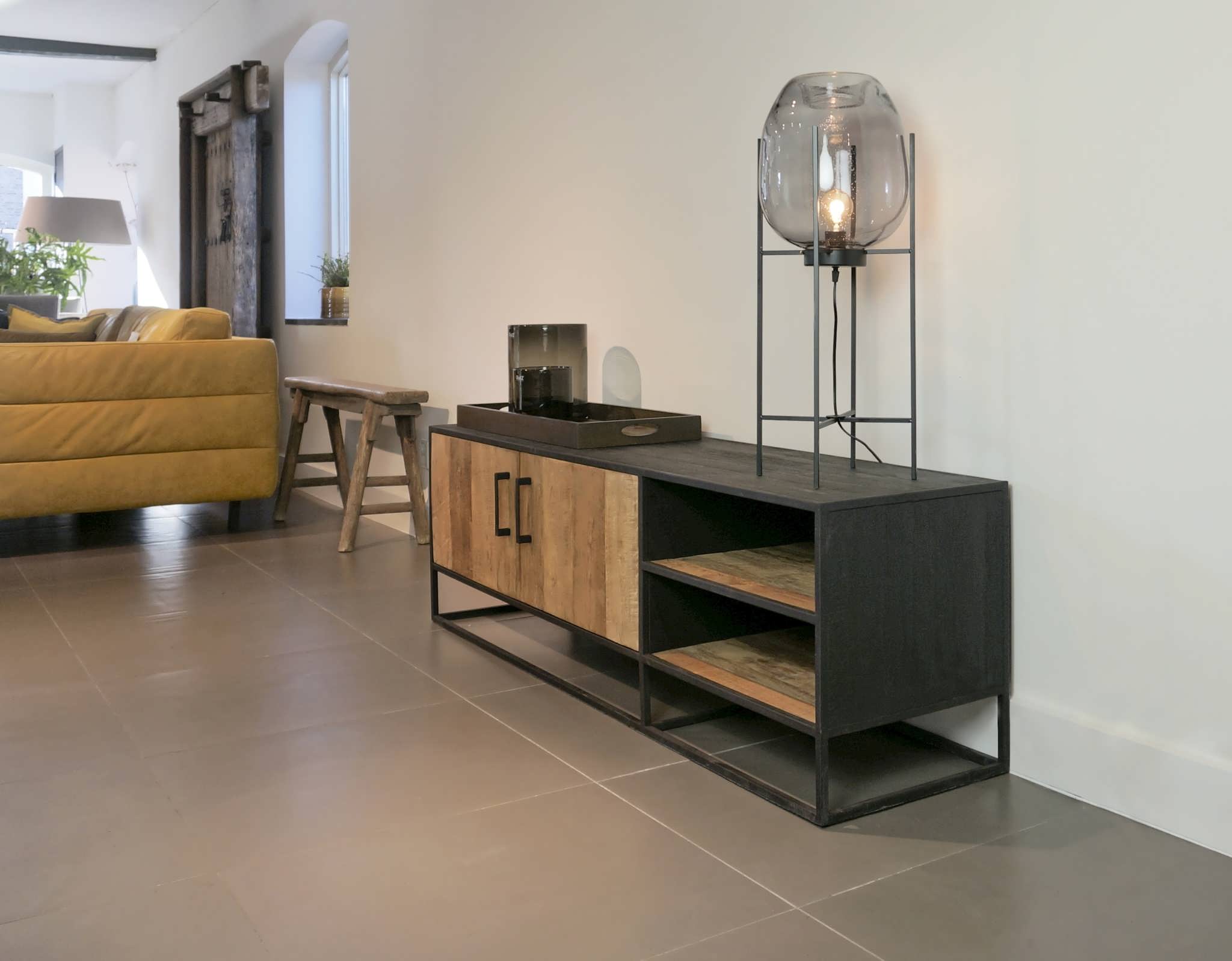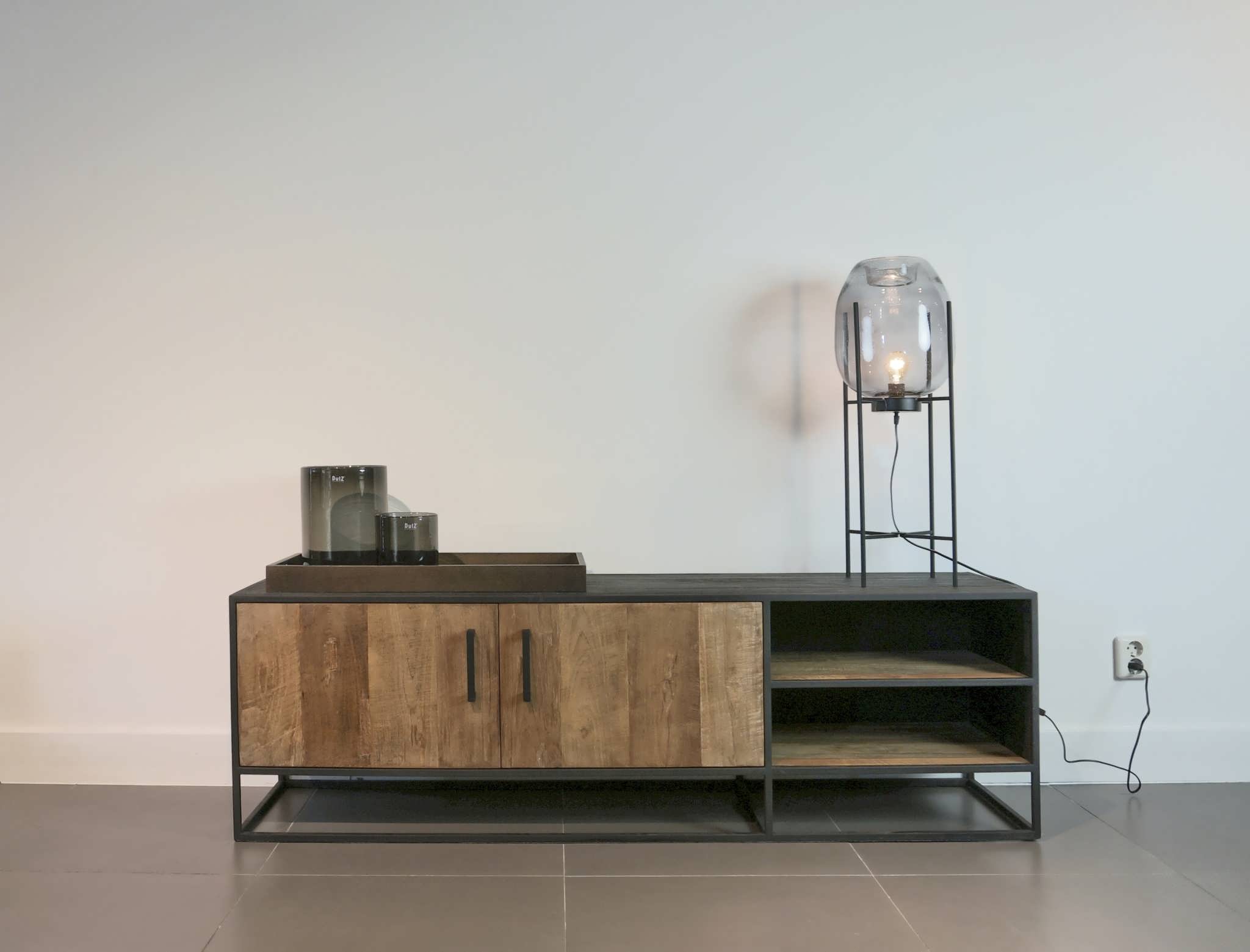 Stoer industrieel tv-meubel van oud recycled teak en stalen frame. Deze variant op onze Maldini serie is leverbaar in 5 verschillende uitvoeringen, 3 uitvoeringen met deurtjes en 2 open vak modellen. Dit model combineert mooi met andere producten uit de Marconi serie, maar ook met de Cavallo, Ferro, Larino en Noma serie. Het oude teak hout krijgt een 2e leven in deze meubels, elk meubel heeft zijn eigen karakteristieke kenmerken wat elk meubel uniek qua uitstraling maakt.