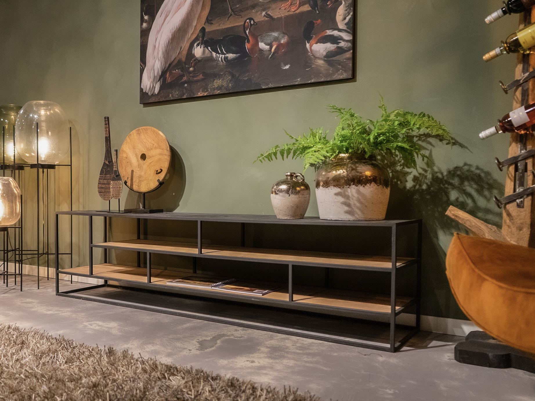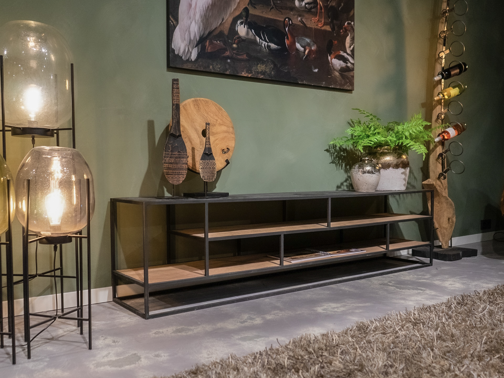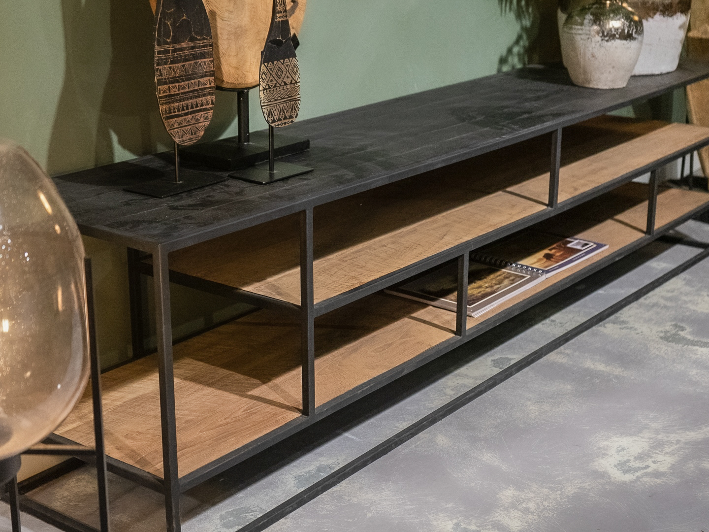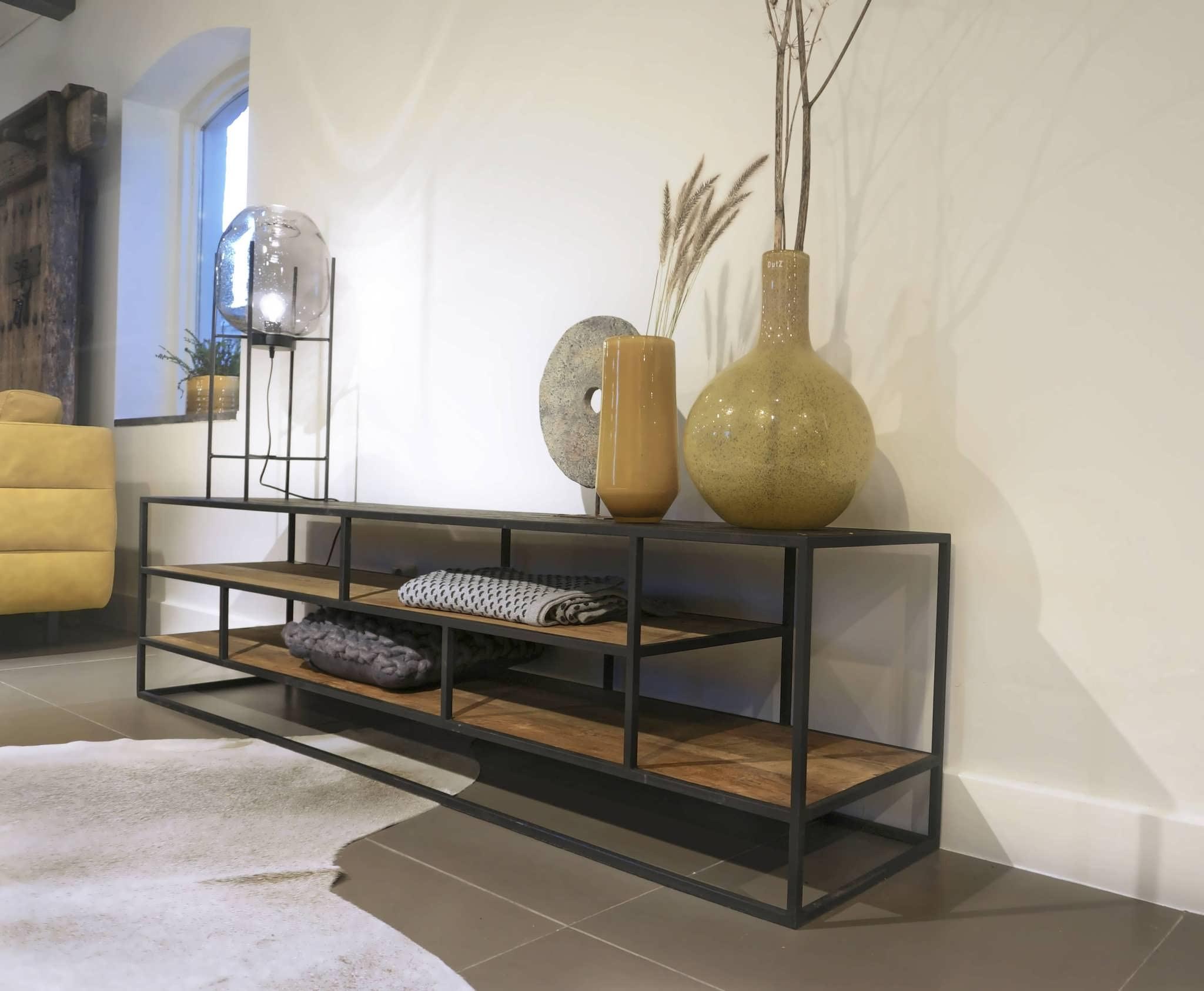 Stoer industrieel tv-meubel van oud recycled teak en stalen frame. Deze variant op onze Maldini serie is leverbaar in 5 verschillende uitvoeringen, 3 uitvoeringen met deurtjes en 2 open vak modellen. Dit model combineert mooi met andere producten uit de Marconi serie, maar ook met de Cavallo, Ferro, Larino en Noma serie. Het oude teak hout krijgt een 2e leven in deze meubels, elk meubel heeft zijn eigen karakteristieke kenmerken wat elk meubel uniek qua uitstraling maakt.