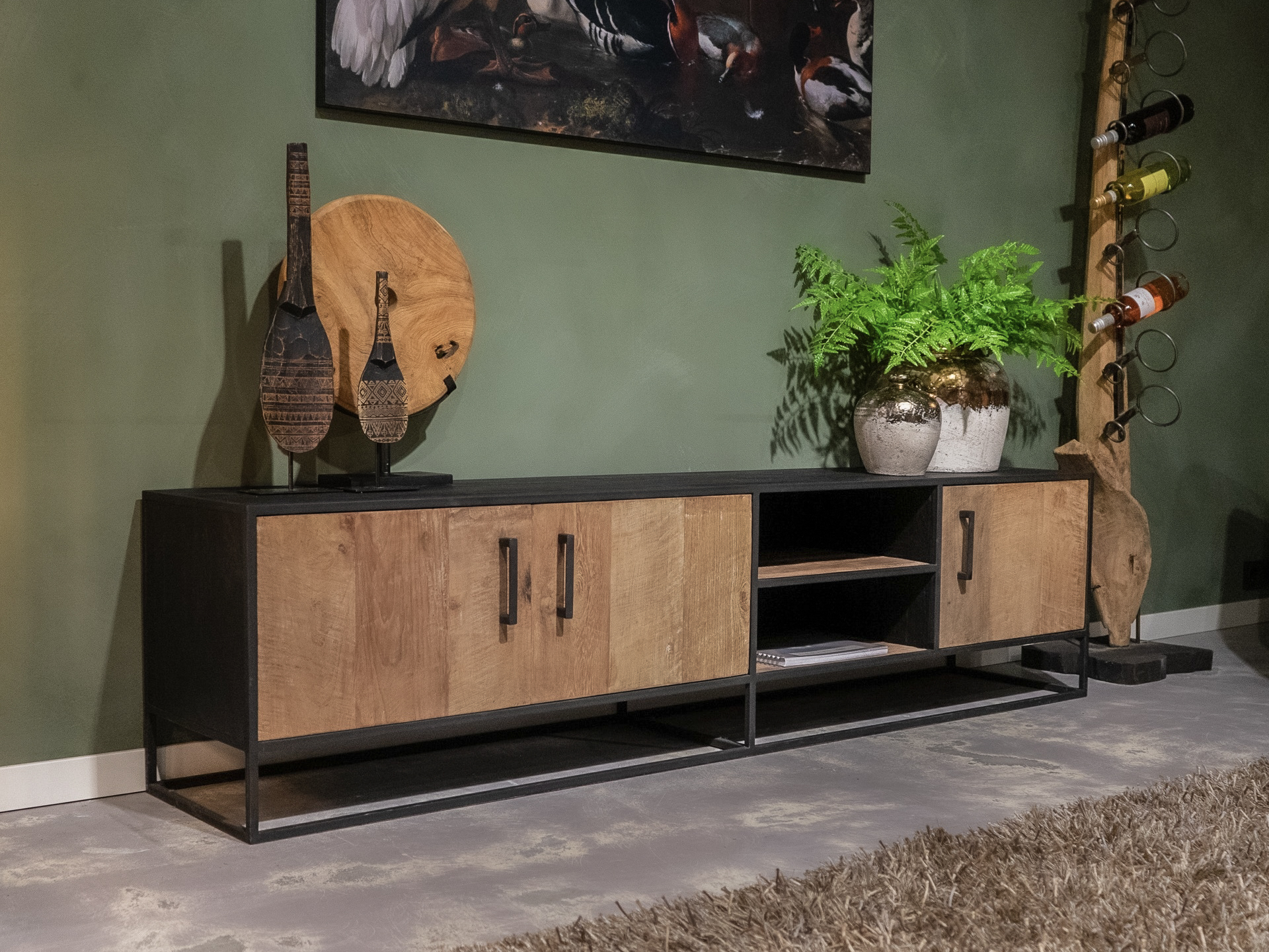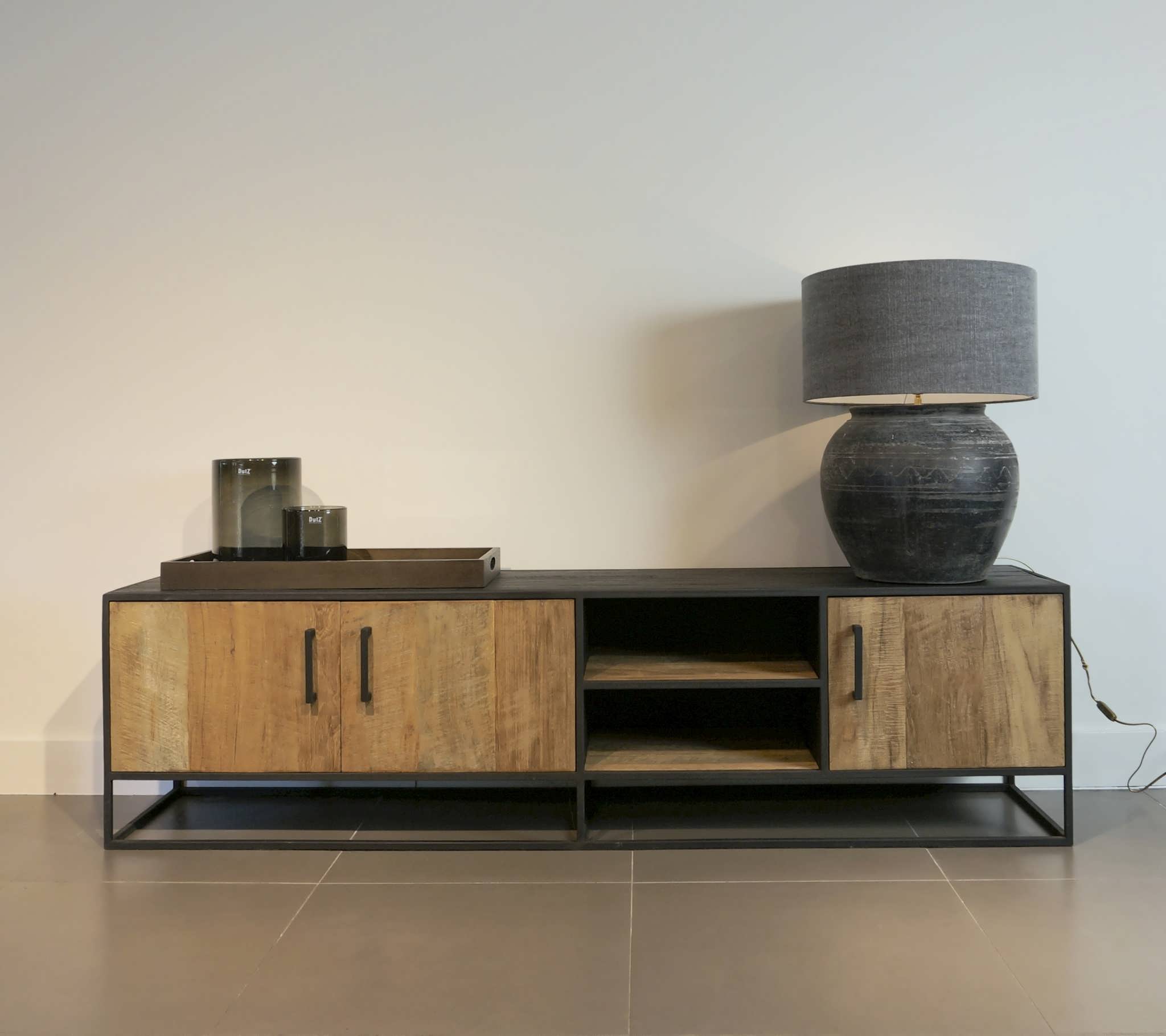 Stoer industrieel tv-meubel van oud recycled teak en stalen frame. Deze variant op onze Maldini serie is leverbaar in 5 verschillende uitvoeringen, 3 uitvoeringen met deurtjes en 2 open vak modellen. Dit model combineert mooi met andere producten uit de Marconi serie, maar ook met de Cavallo, Ferro, Larino en Noma serie. Het oude teak hout krijgt een 2e leven in deze meubels, elk meubel heeft zijn eigen karakteristieke kenmerken wat elk meubel uniek qua uitstraling maakt.