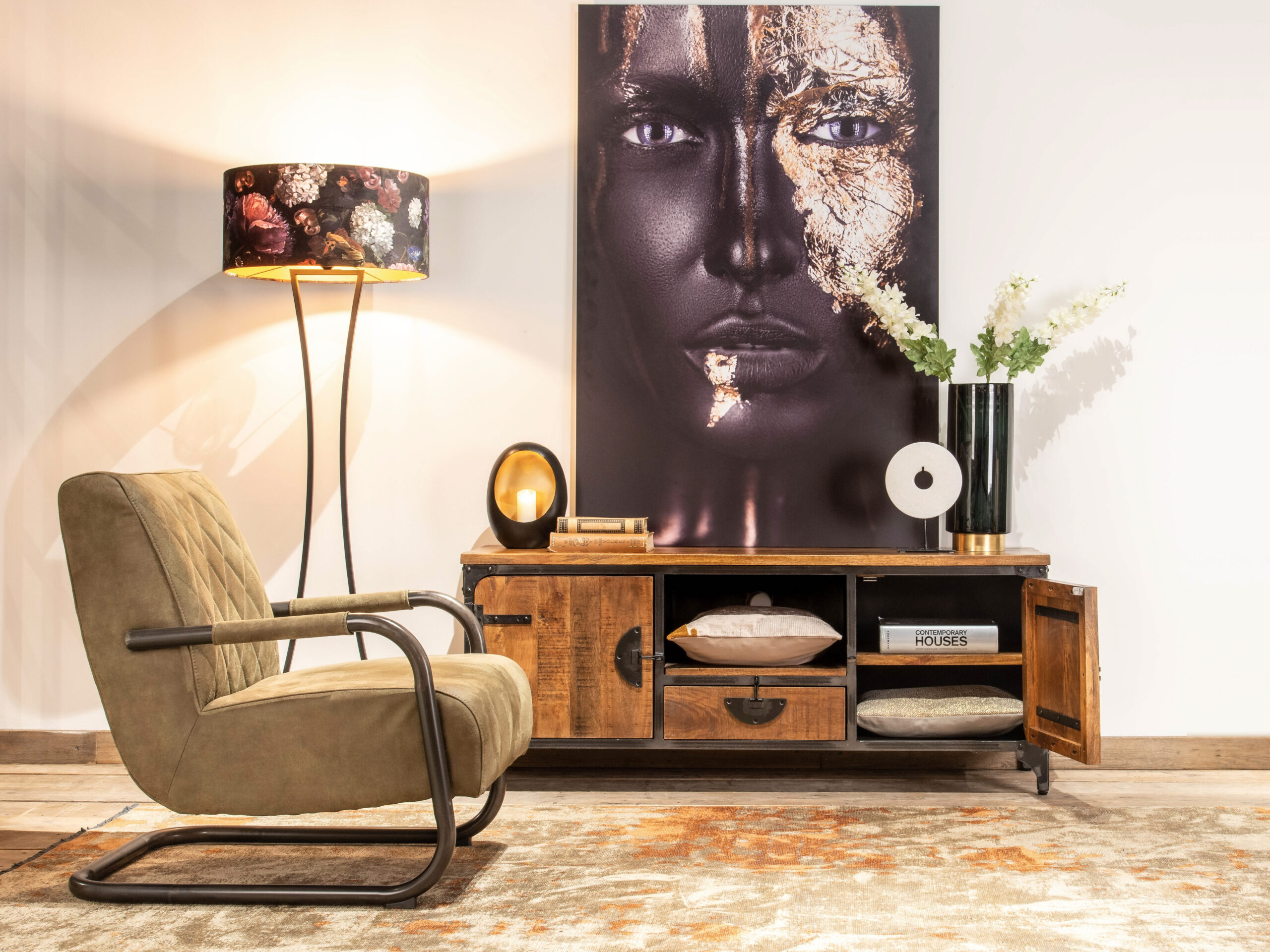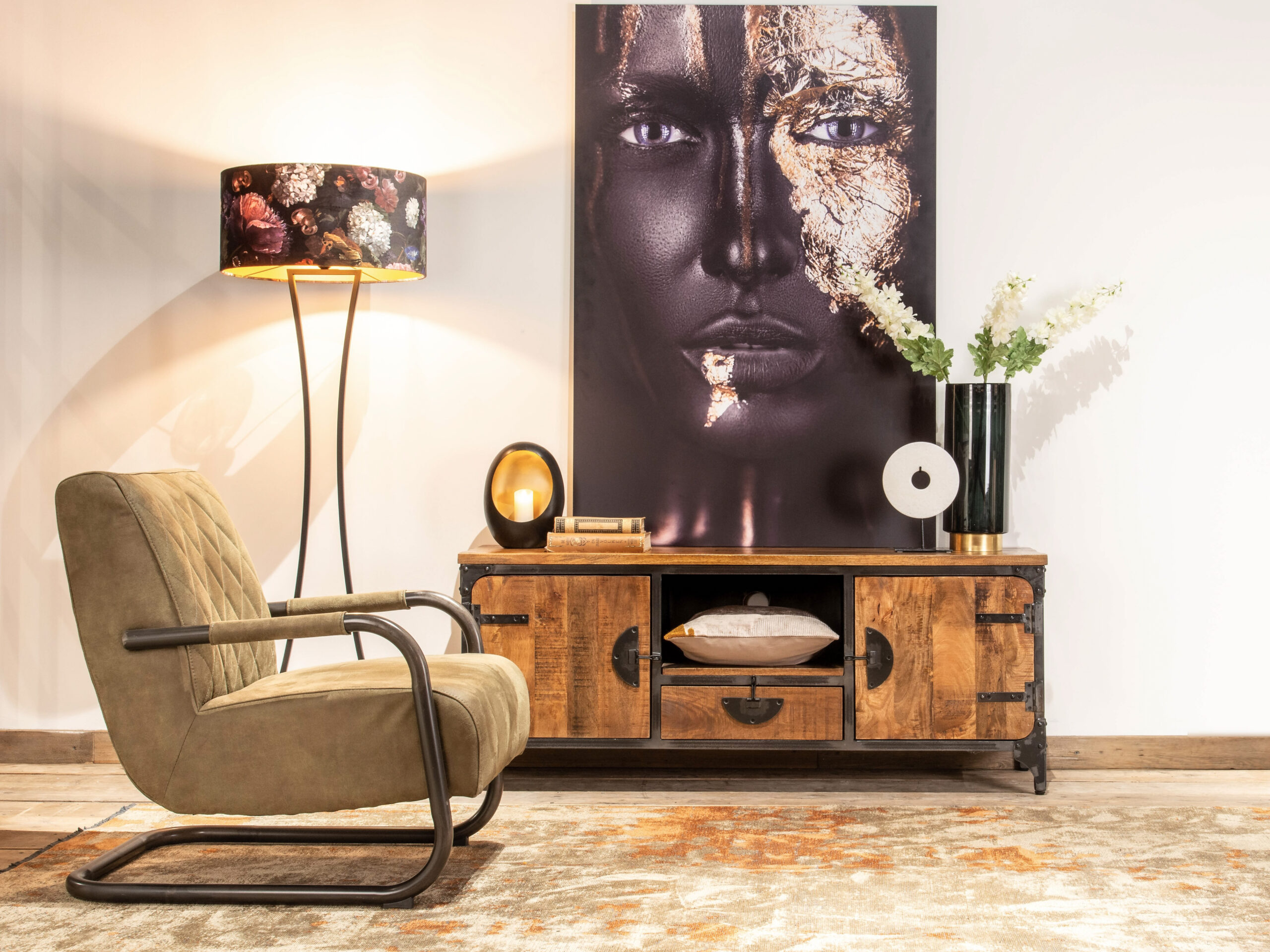 Stoer opvallend TV-meubel Mileto met 2 robuuste deuren en 2 laden. Deze prachtige kast heeft een unieke uitstraling met zijn klinknagels, metalen rand en brede scharnieren. Door de combinatie van grote stukken mangohout met metalen randen rondom afwerking creëert het geheel een stoere look in vrijwel ieder interieur. Het Mileto TV-meubel beschikt over de nodige opbergruimte achter de deuren. Het hout wordt vervaardigd uit ruw en duurzaam mangohout. Naast een TV-meubel zijn er meerdere meubels in onze Mileto serie, zoals: een vitrinekast, een boekenkast en een dressoir. Doorgaans is dit meubel direct uit voorraad leverbaar!