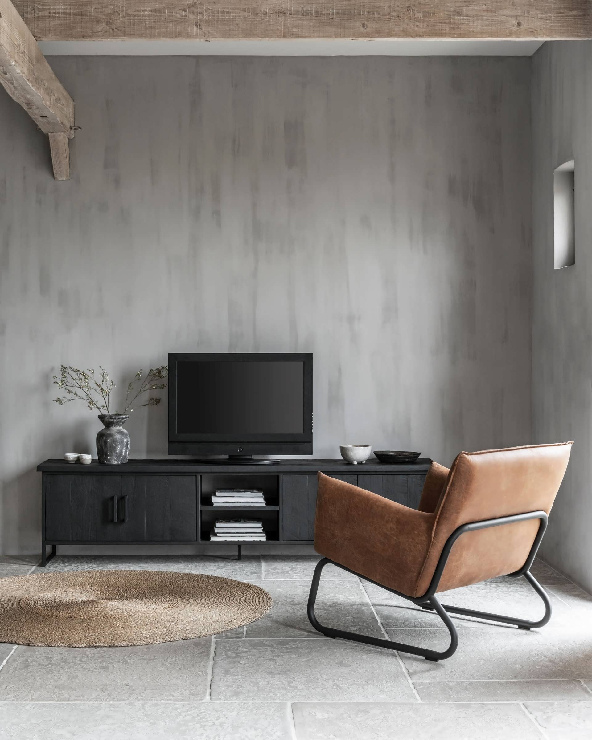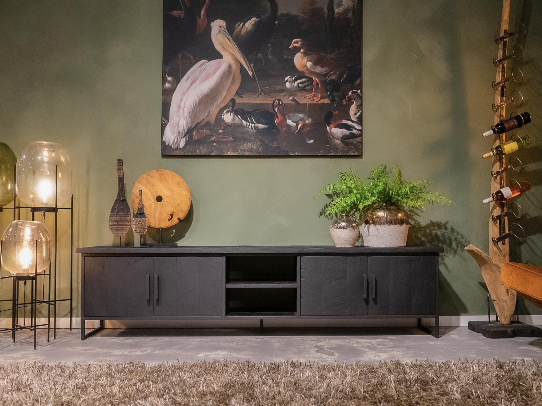 Stoer industrieel tv-meubel van zwart gespoten oud recycled teak en stalen frame. Dit model is leverbaar in 3 verschillende maten, 140cm met 2 deurtjes links en rechts een schap, 180cm met 2 deurtjes links, open vakt en 1 deurtje rechts en een 220cm versie met 2 deurtjes links, open vak en 2 deurtjes rechts. Hetzelfde hout wordt gebruikt voor onze Maldini, Noma, Marconi en Cavallo serie. Het oude teak hout krijgt een 2e leven in deze meubels, elk meubel heeft zijn eigen karakteristieke kenmerken wat elk meubel uniek qua uitstraling maakt.