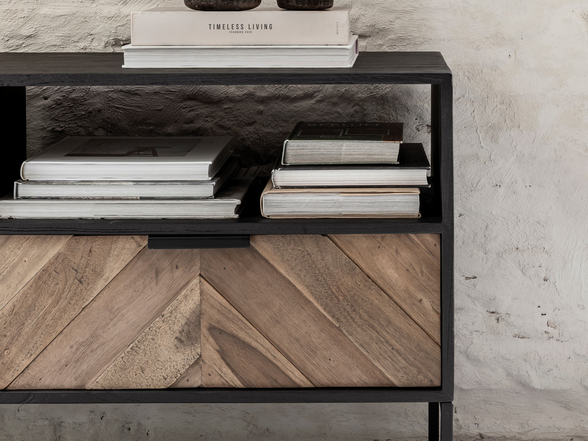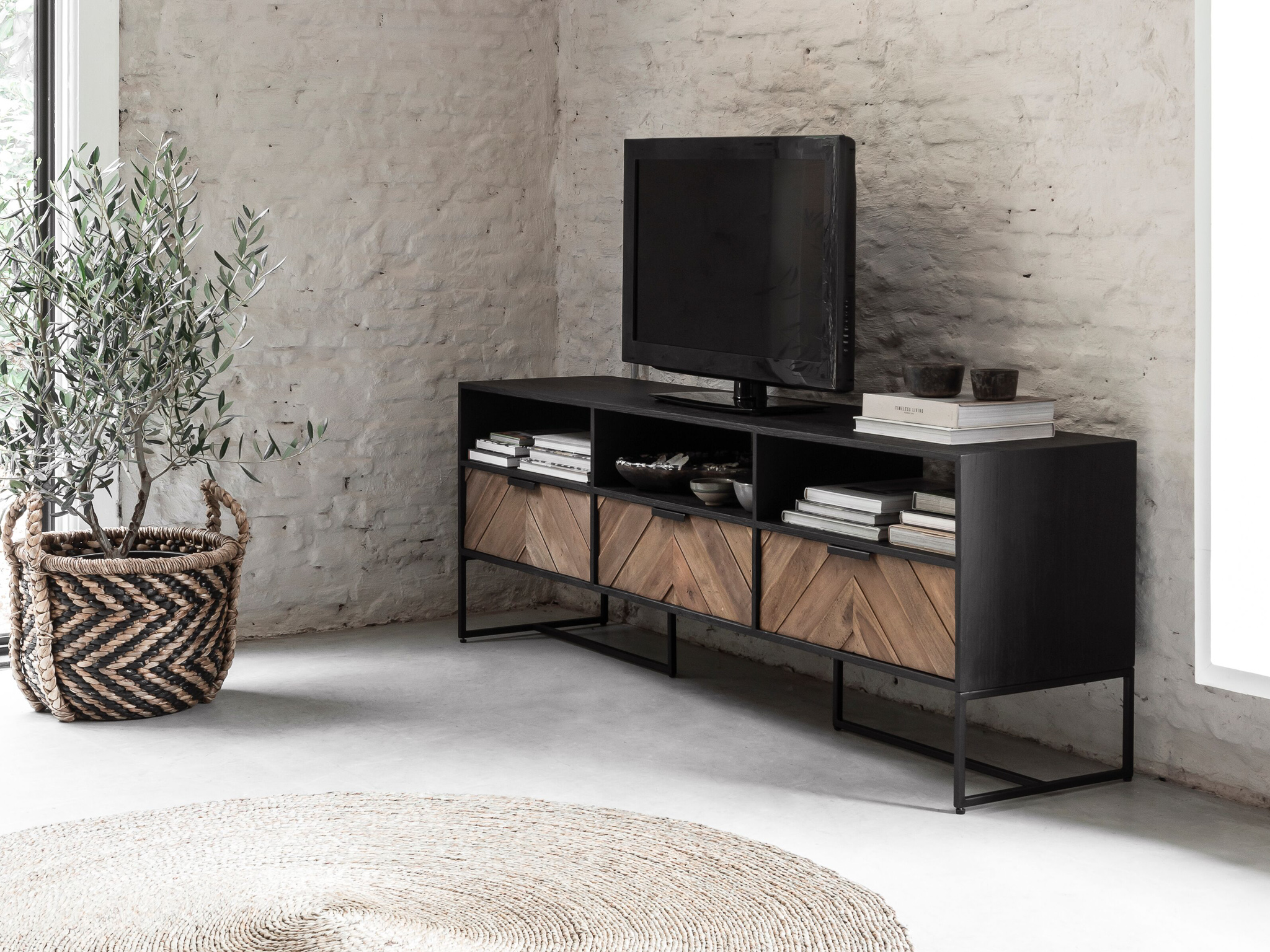 Stoer TV-meubel Padula van oud recyled teak en zwart stalen onderstel, leverbaar doorgaans uit voorraad. Het TV-meubel is leverbaar in de breedtematen 120cm, 150cm en 180cm. De Padula serie is uniek doordat de teak planken in visgraat motief zijn geplaast om zo het meubel een karakteristiek uiterlijk te geven. De combinatie van het zwart gebeitste hout en het oude gerecyclede teak zorgt voor een erg warme en robuuste uitstraling.