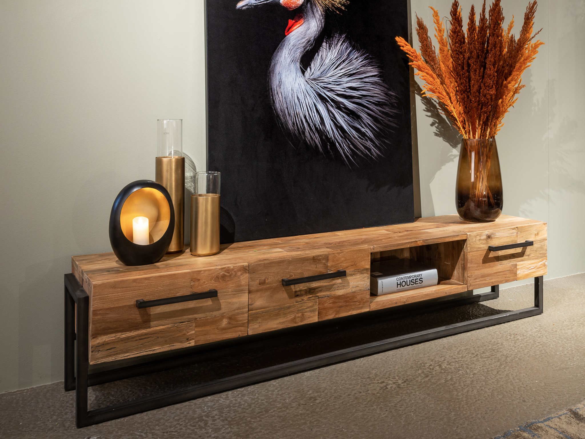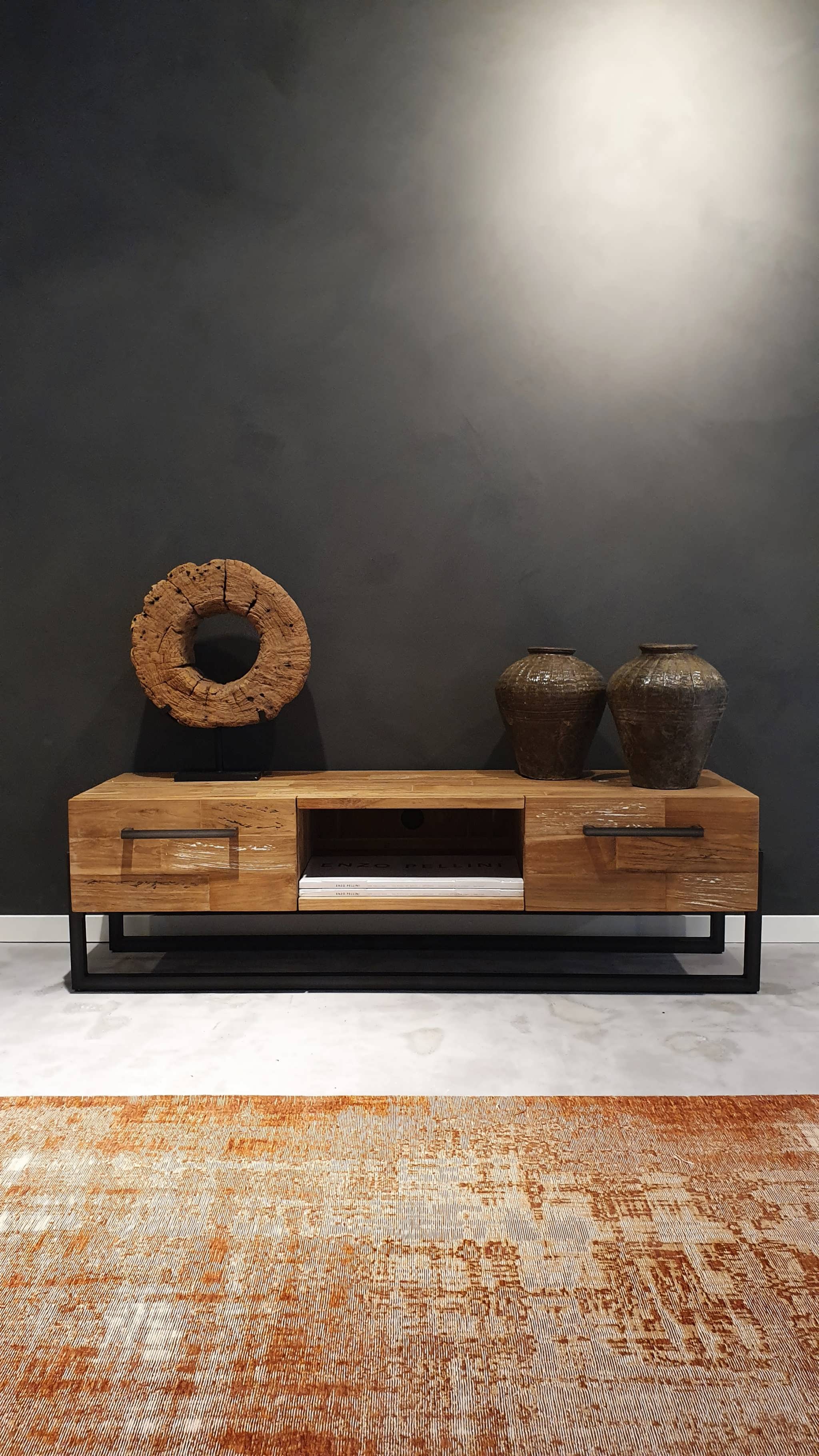 Stoer industrieel tv-meubel met stalen frame, gemaakt van oud recycled teak vergelijkbaar met onze Avezzano serie. Leverbaar doorgaans uit voorraad in 2 maten. Dit model combineert uiteraard mooi bij de overige meubels uit de Perdano serie, maar ook zeker bij de Cavallo, Ferro, Noma en Maldini welke ook gemaakt zijn van oud teak hout.