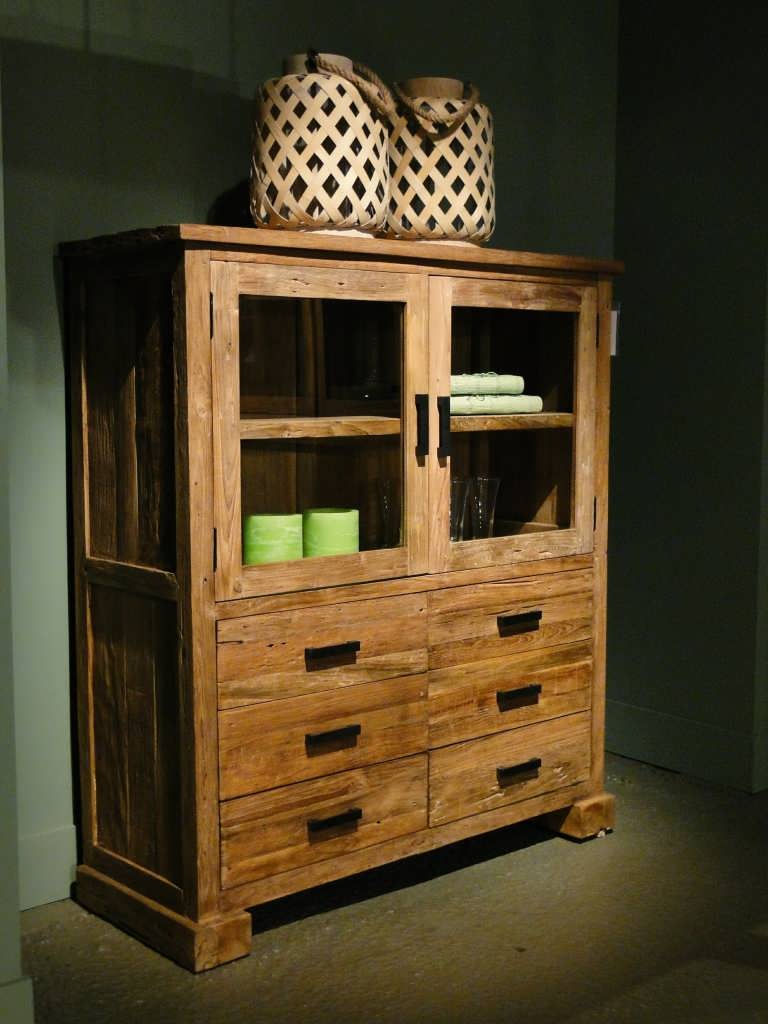Stoere vitrinekast van oud recycled teak, ook wel driftwood genoemd. Dit model combineert mooi met onze andere producten van oud hout zoals bijvoorbeeld onze tafel Brunoy of kloostertafel Tressot.